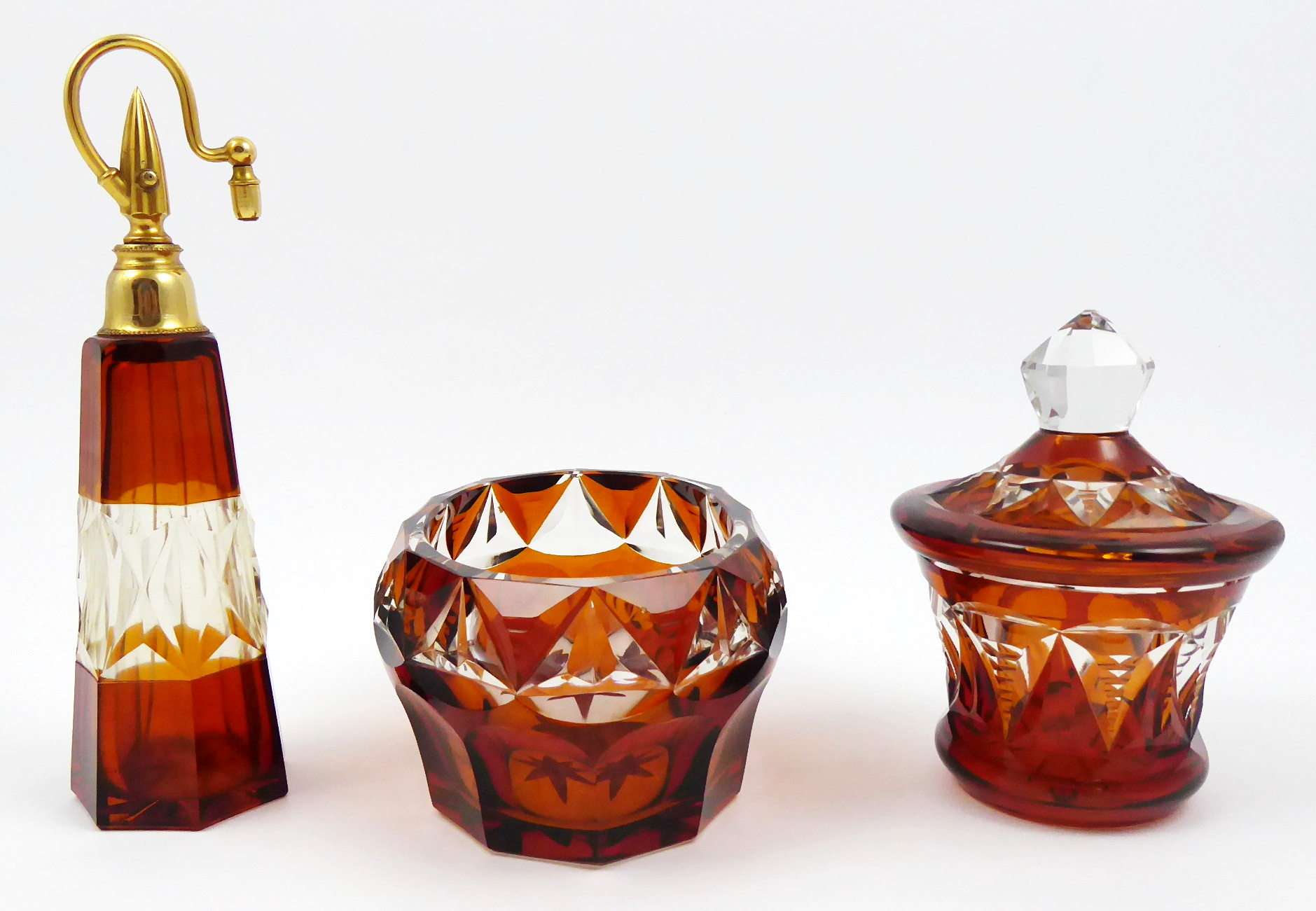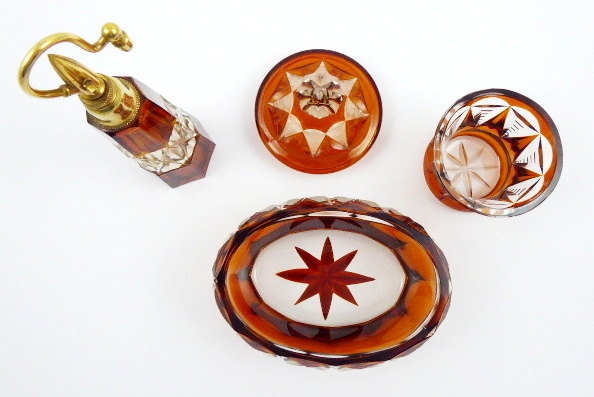 Bezbarvé ručně broušené sklo přejímané ambrovou lazurou, mosazná montáž. Období a styl: art deco. Toaletní souprava složená z flakonu na parfém s mosaznou montáží, dózy se zdobným víkem a odkládací oválné misky z ručně do fazet a dekorativních reliéfů broušeného skla přejímaného ambrovou lazurou. Na dnu všech tří nádob ručně broušené hvězdice. Místy velmi drobné oťuky. Československo 1925 – 1935. Výška flakonu na parfém či toaletní vodu 21 cm, výška dózy 14,5 cm, průměr dózy 10 cm, výška misky 8,5 cm, šířka 15 cm, hloubka 12,5 cm.