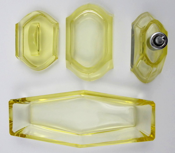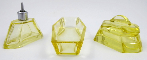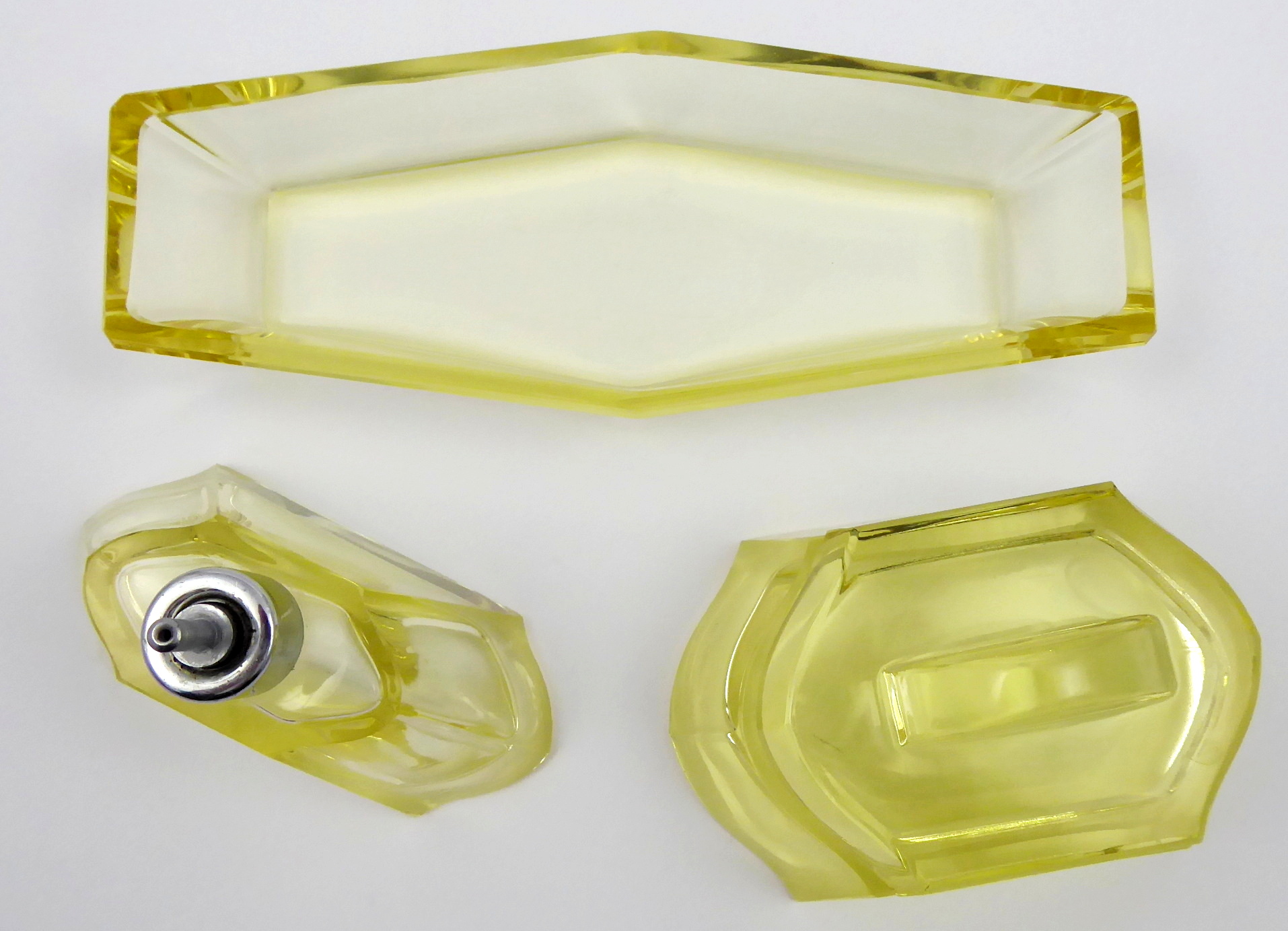 Žluté citrínové sklo, broušené. Období a styl art deco. Sestávající se z flakonu, dózy a misky. Toaletní set art deco zdobený fazetami a zabrušovanými okraji. Československo 1920 – 1940. Rozměr obdélné misky 21 cm x 8,5 cm x 3,5 cm. Rozměr dózy s víkem 12 cm x 7 cm x 8 cm. Rozměr flakonu 11 cm x 9,5 cm x 5 cm.