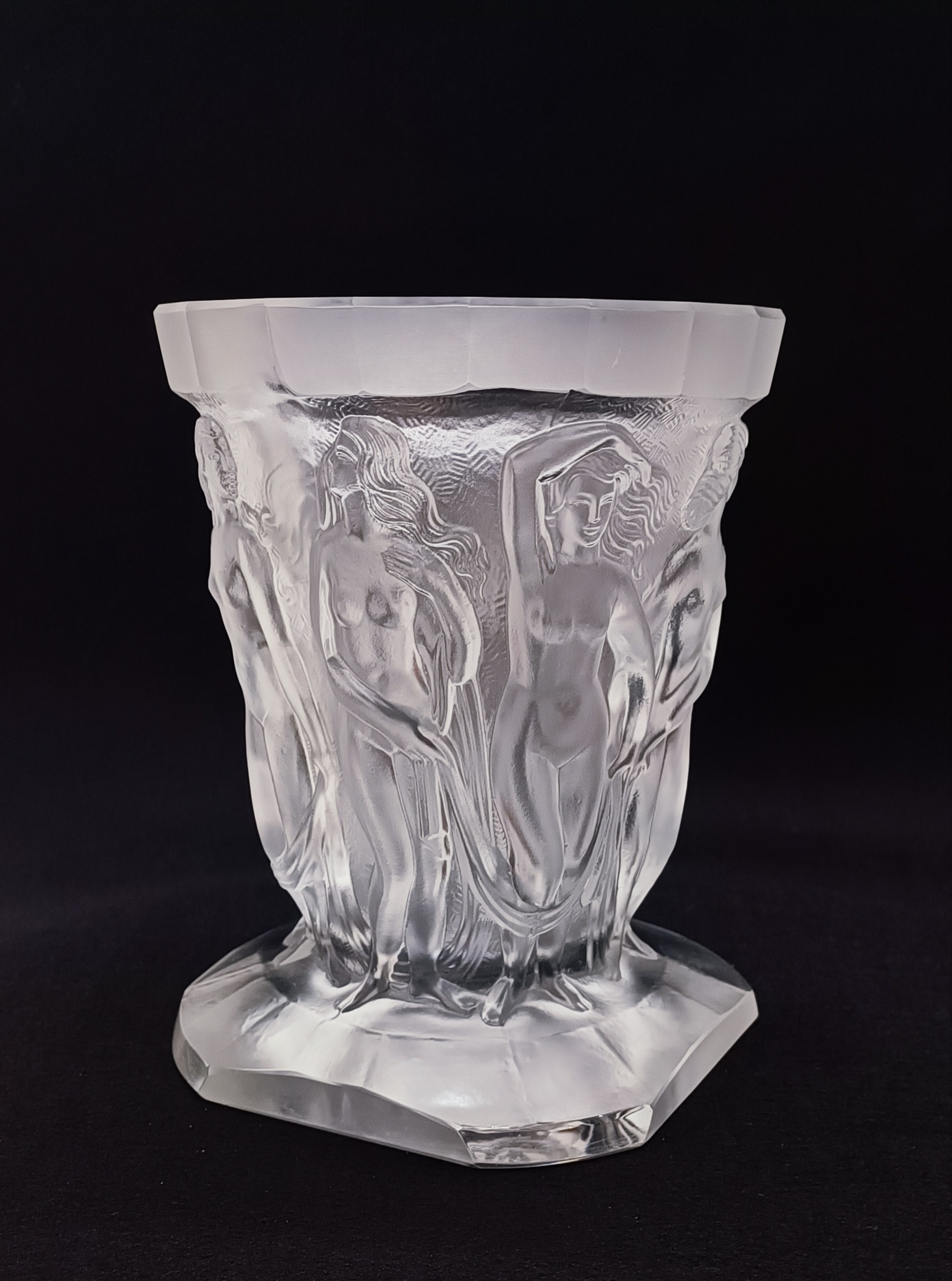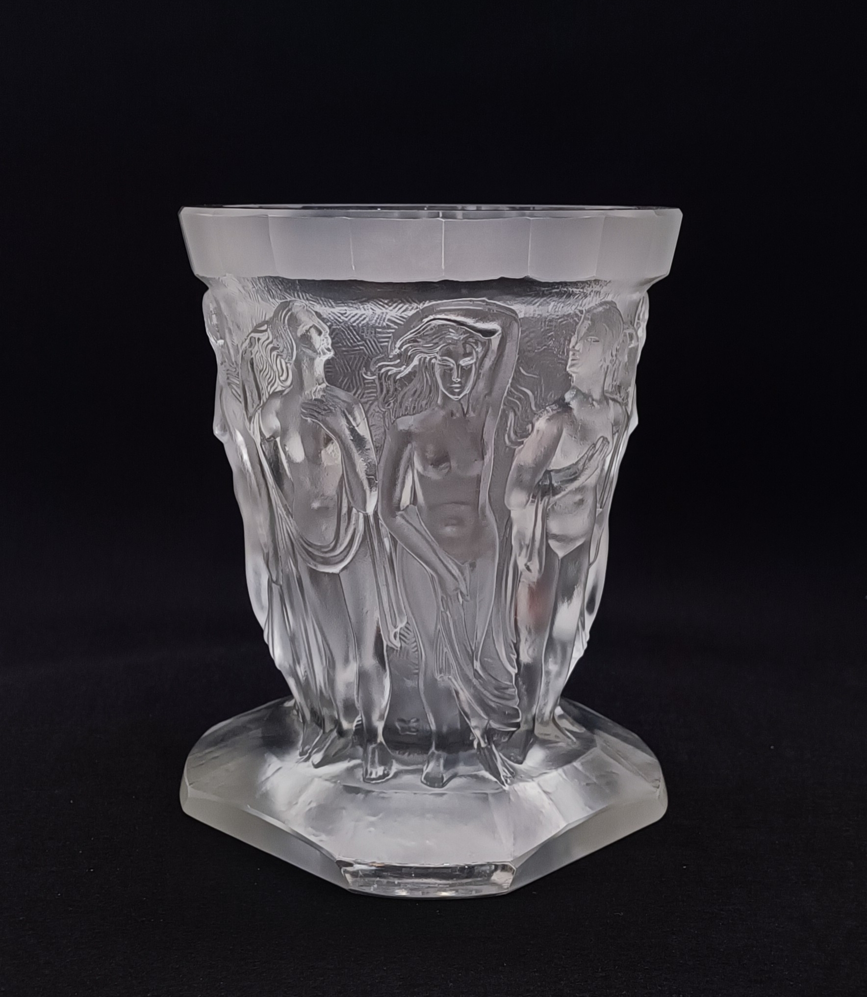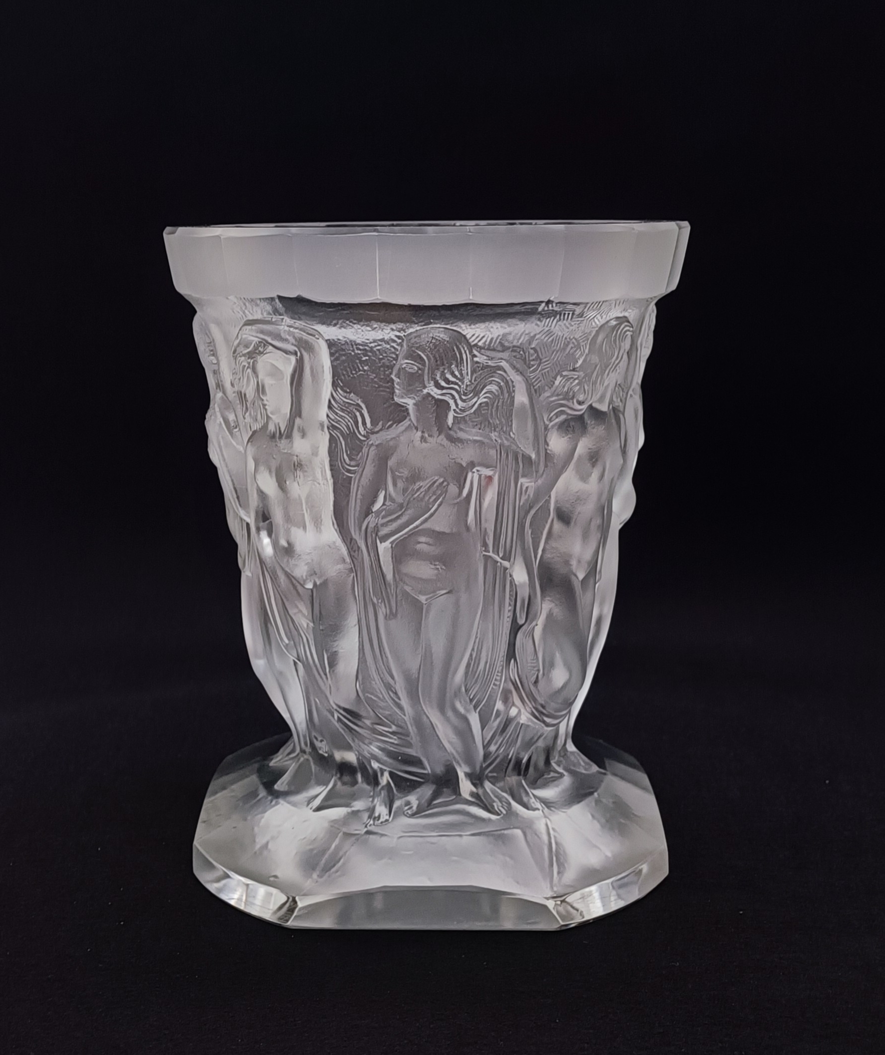 Art deco váza z čirého litého dobrušovaného matovaného skla, vynikající design a provedení s reliéfním dekorem nahých tanečnic, v sortimentu jablonecké sklářské firmy Heinrich Hoffmann, značeno motýlkem, kolem roku 1930, výška 22 cm; sběratelsky zajímavé, špičková evropská kvalita srovnatelná s produkcí slavné francouzské značky Lalique