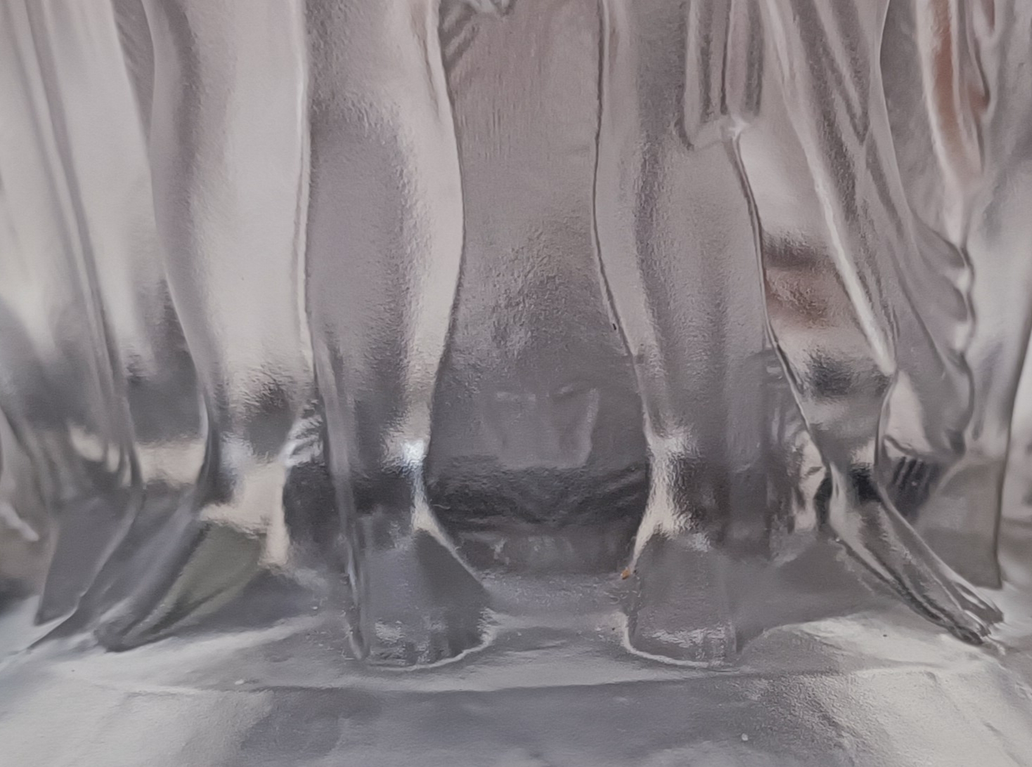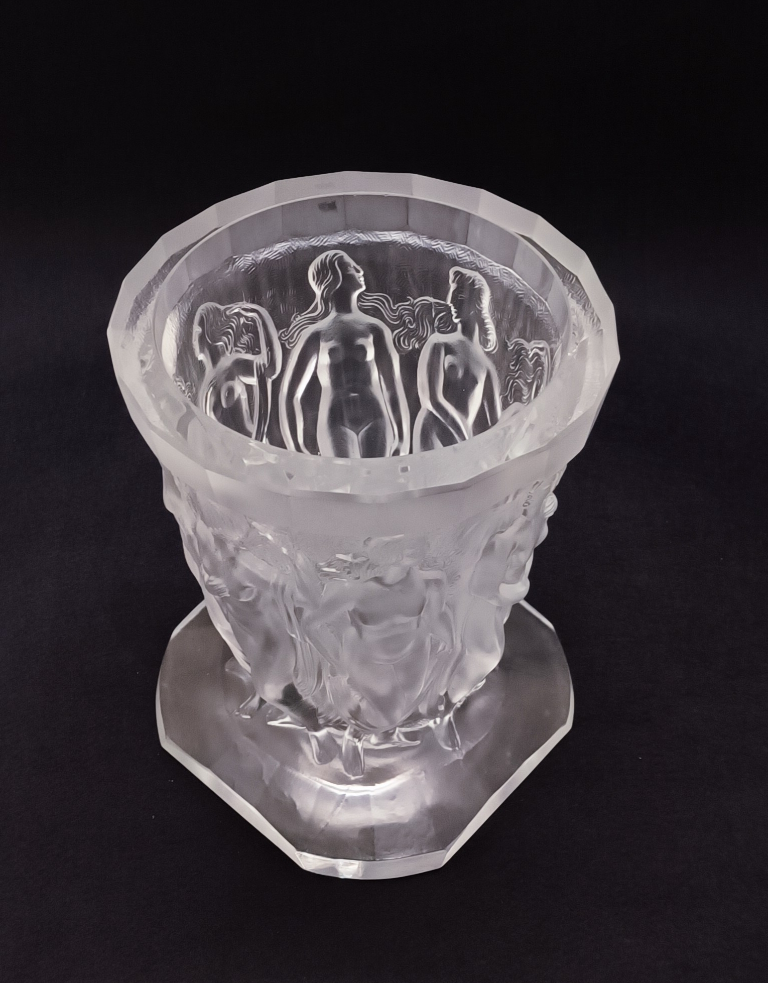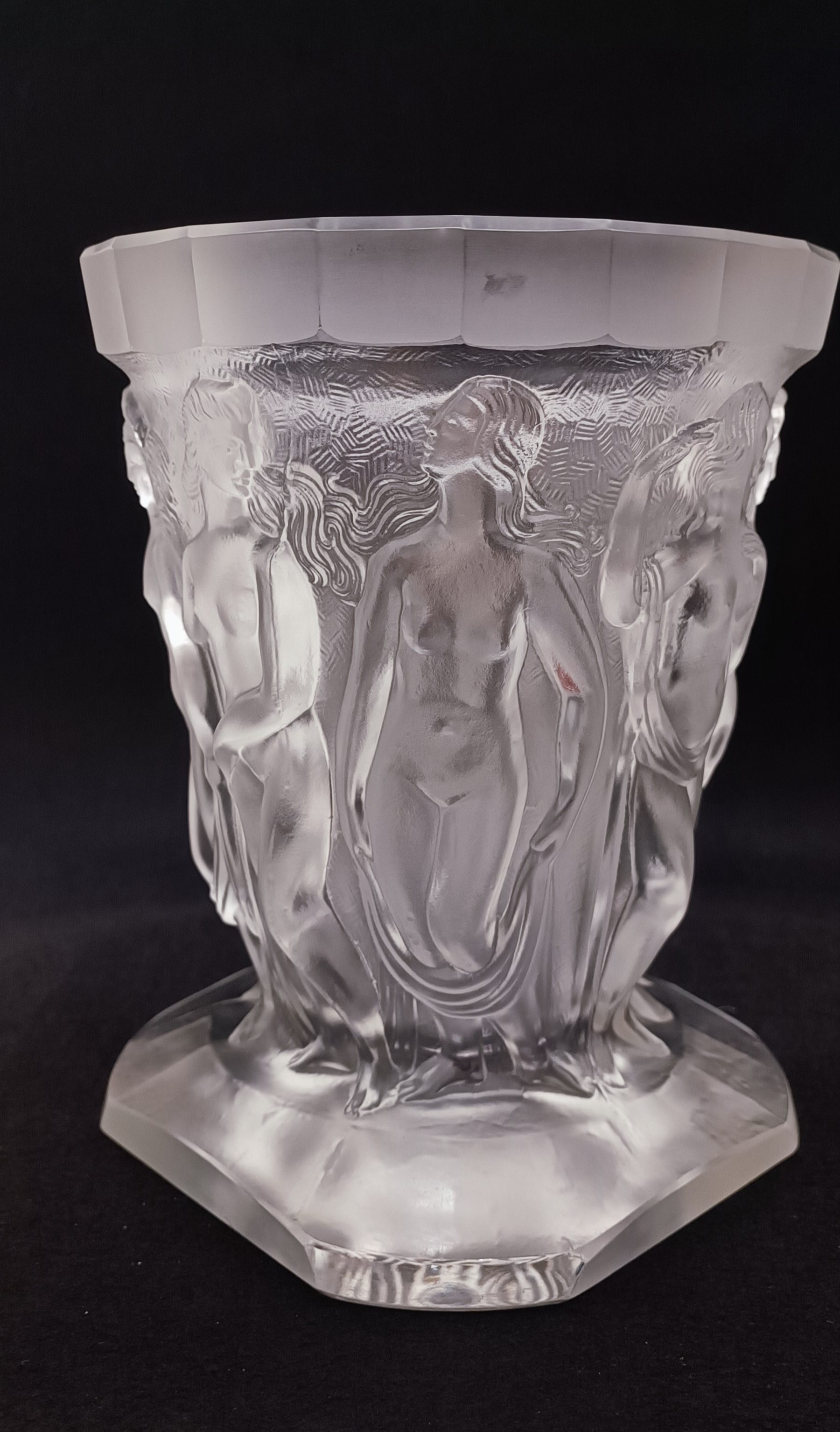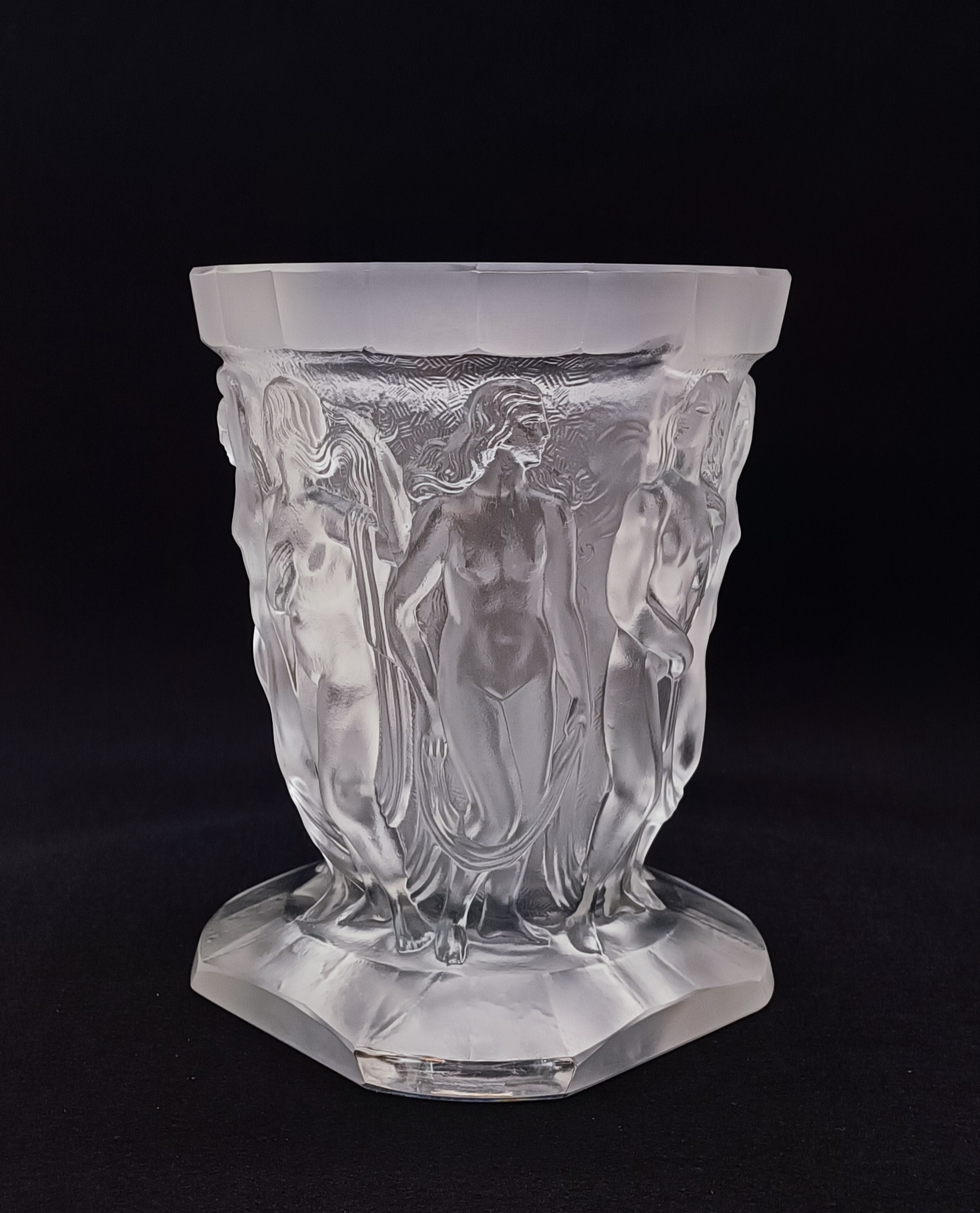Art deco váza z čirého litého dobrušovaného matovaného skla, vynikající design a provedení s reliéfním dekorem nahých tanečnic, v sortimentu jablonecké sklářské firmy Heinrich Hoffmann, značeno motýlkem, kolem roku 1930, výška 22 cm; sběratelsky zajímavé, špičková evropská kvalita srovnatelná s produkcí slavné francouzské značky Lalique