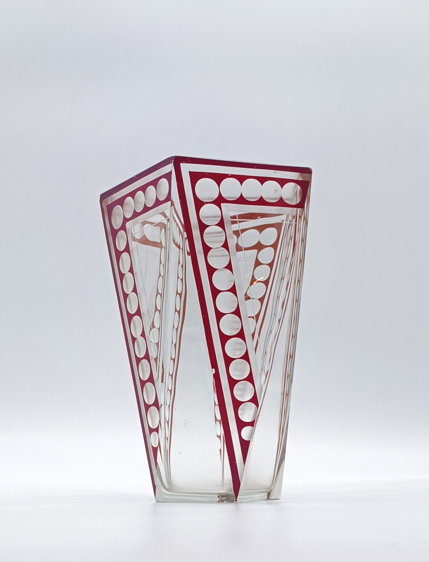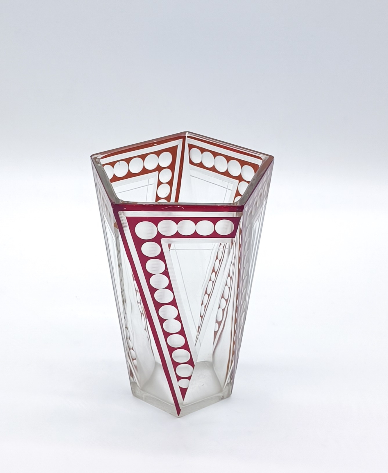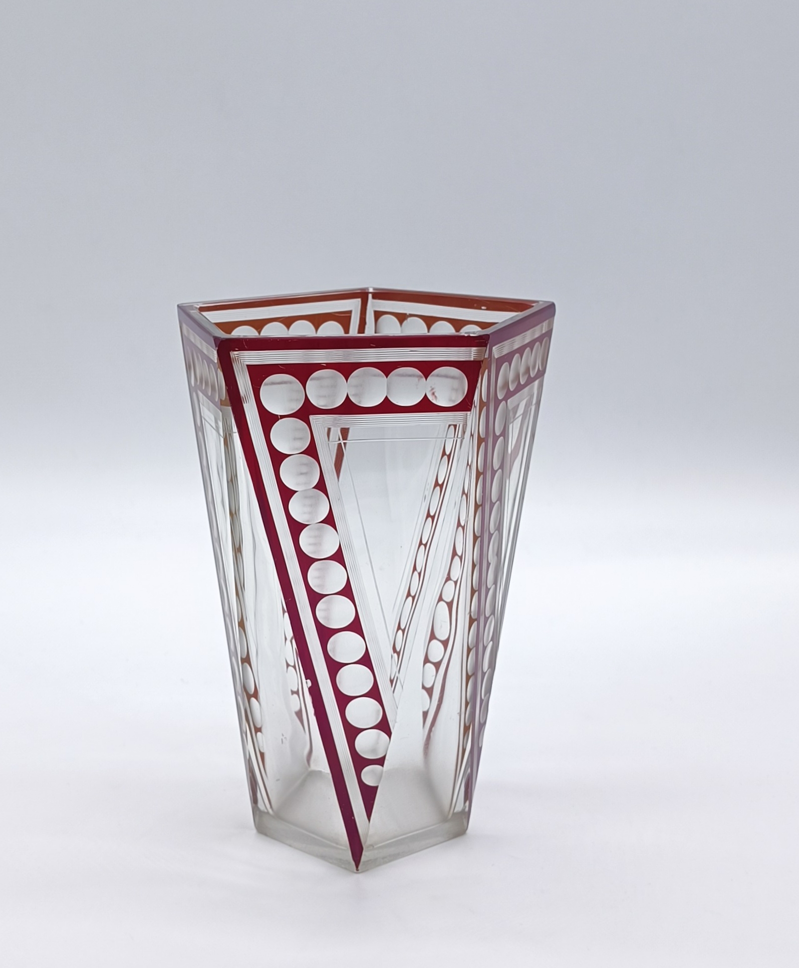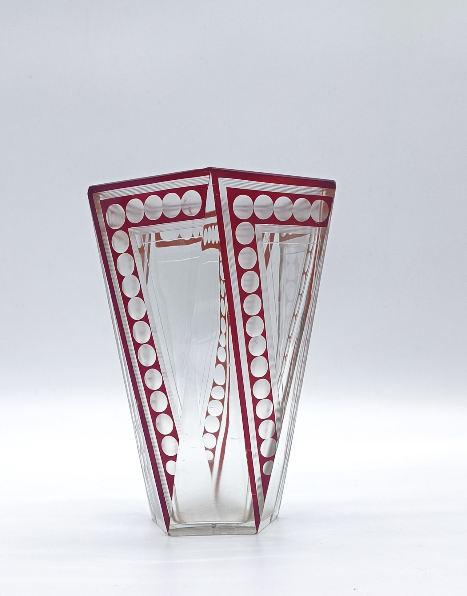 Art deco váza z broušeného a probrušovaného vrstveného skla, uvnitř zlacená lazura, na povrchu rubínová lazura s broušenými čočkami. Váza výjimečného tvaru z dílny Karla Paldy, Československo , Nový Bor, 20.-30. léta 20. století; výška 19,5 cm, průměr 13 cm