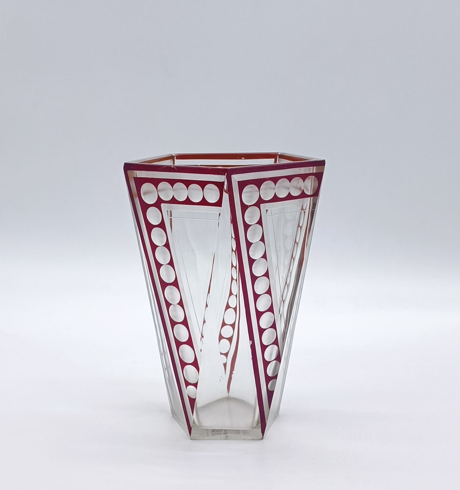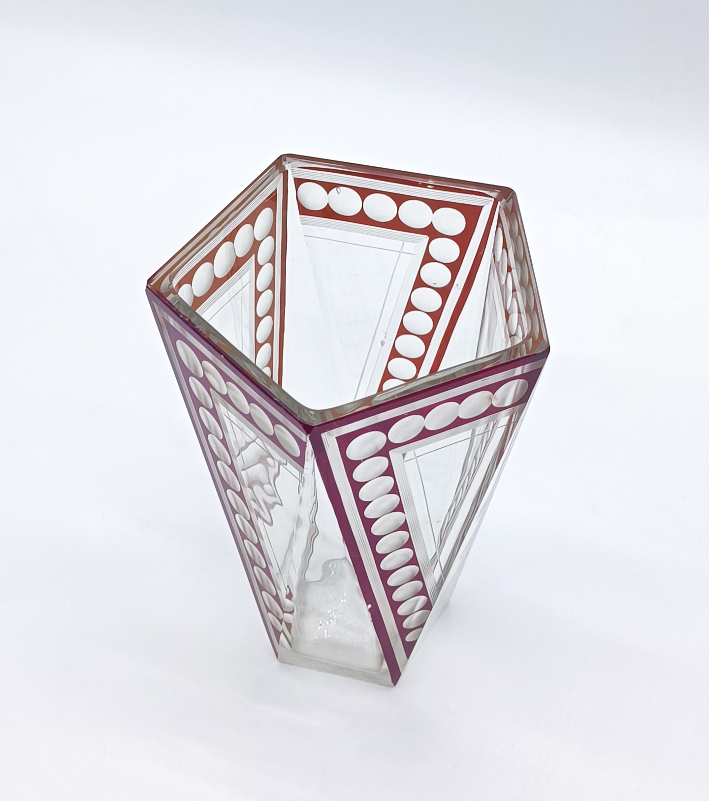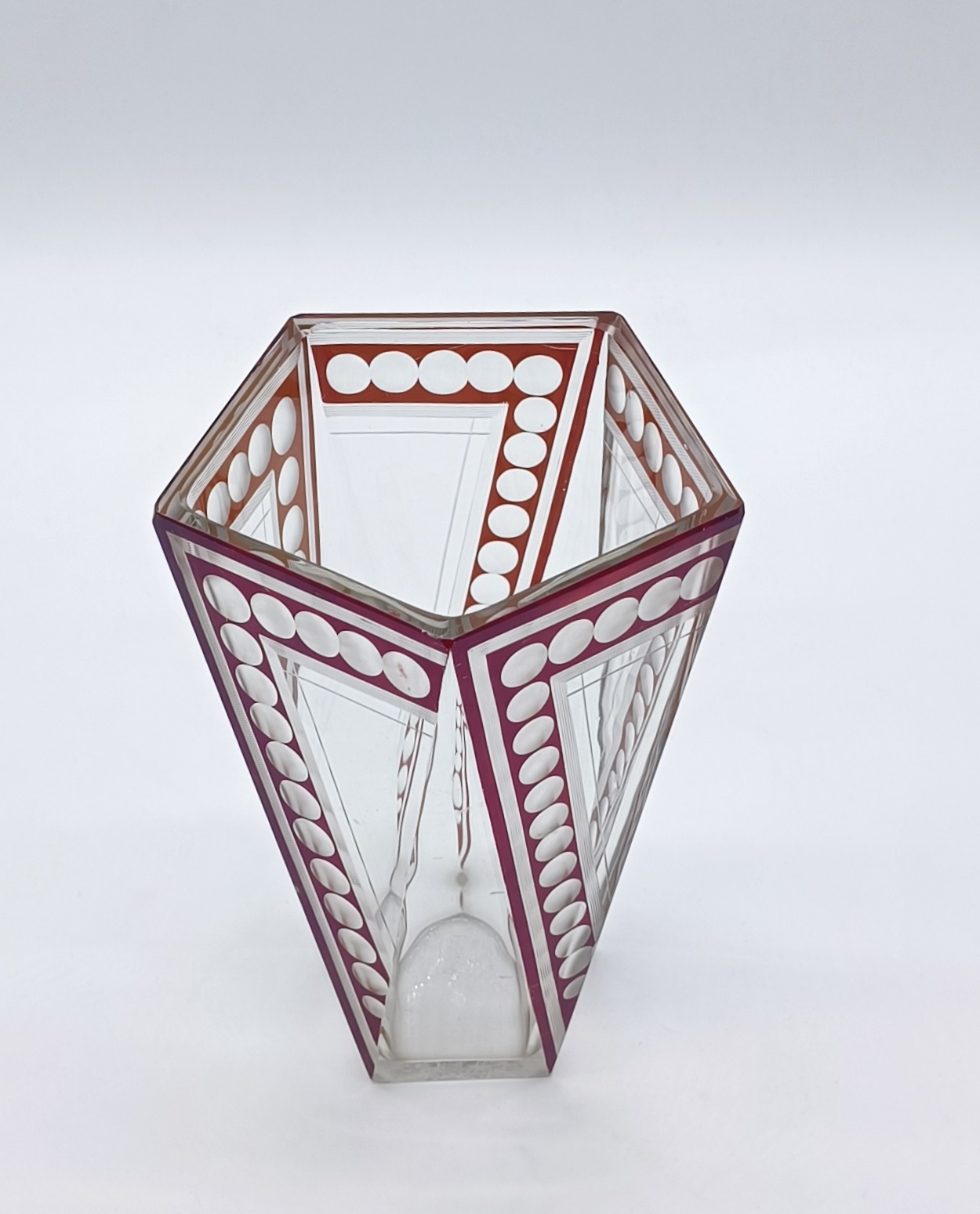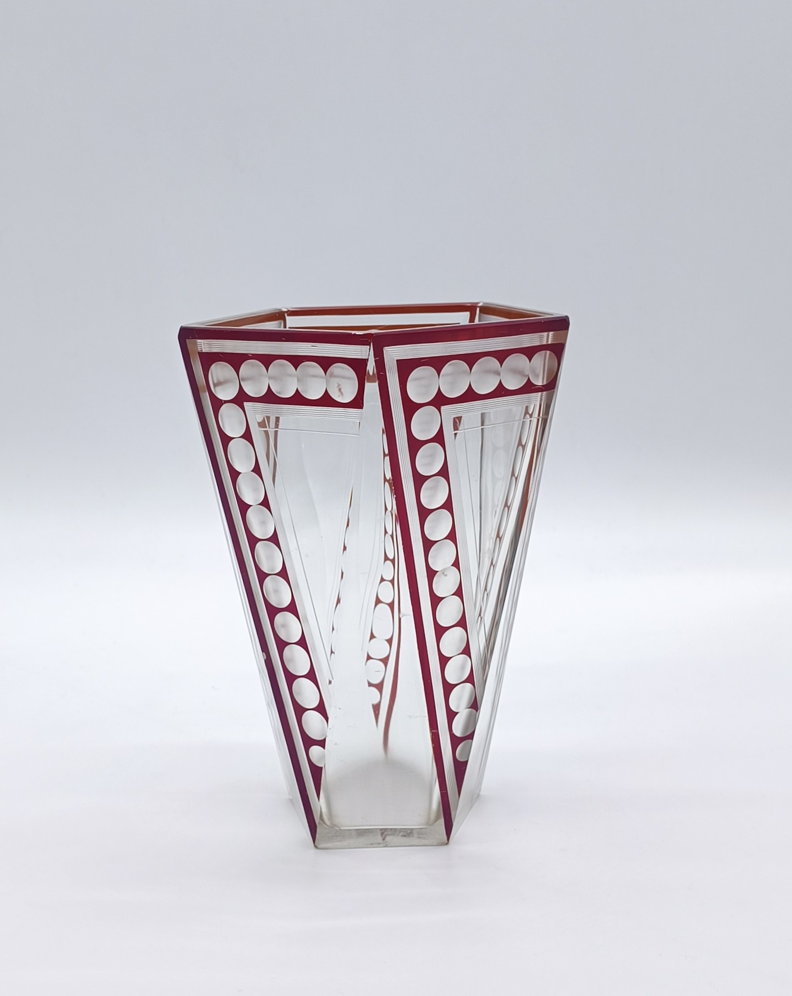 Art deco váza z broušeného a probrušovaného vrstveného skla, uvnitř zlacená lazura, na povrchu rubínová lazura s broušenými čočkami. Váza výjimečného tvaru z dílny Karla Paldy, Československo , Nový Bor, 20.-30. léta 20. století; výška 19,5 cm, průměr 13 cm