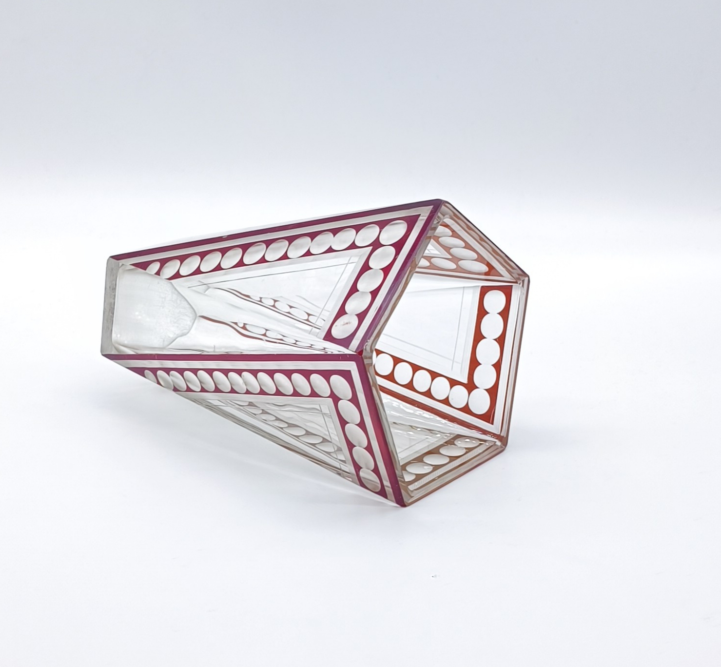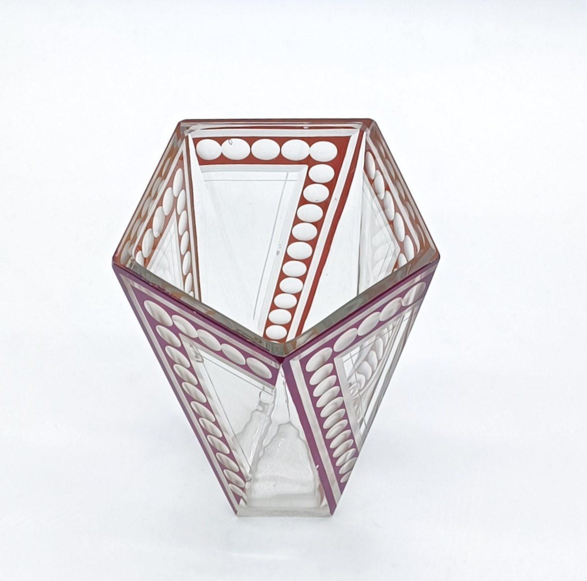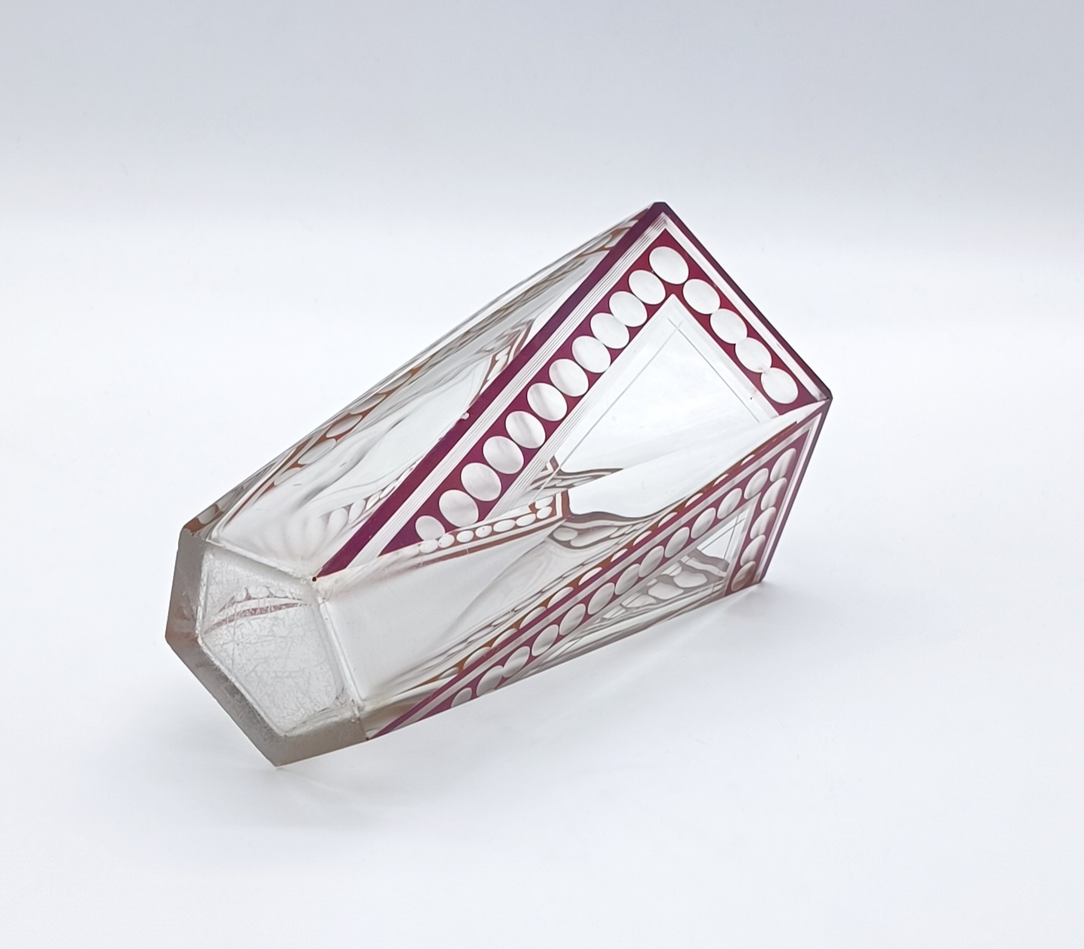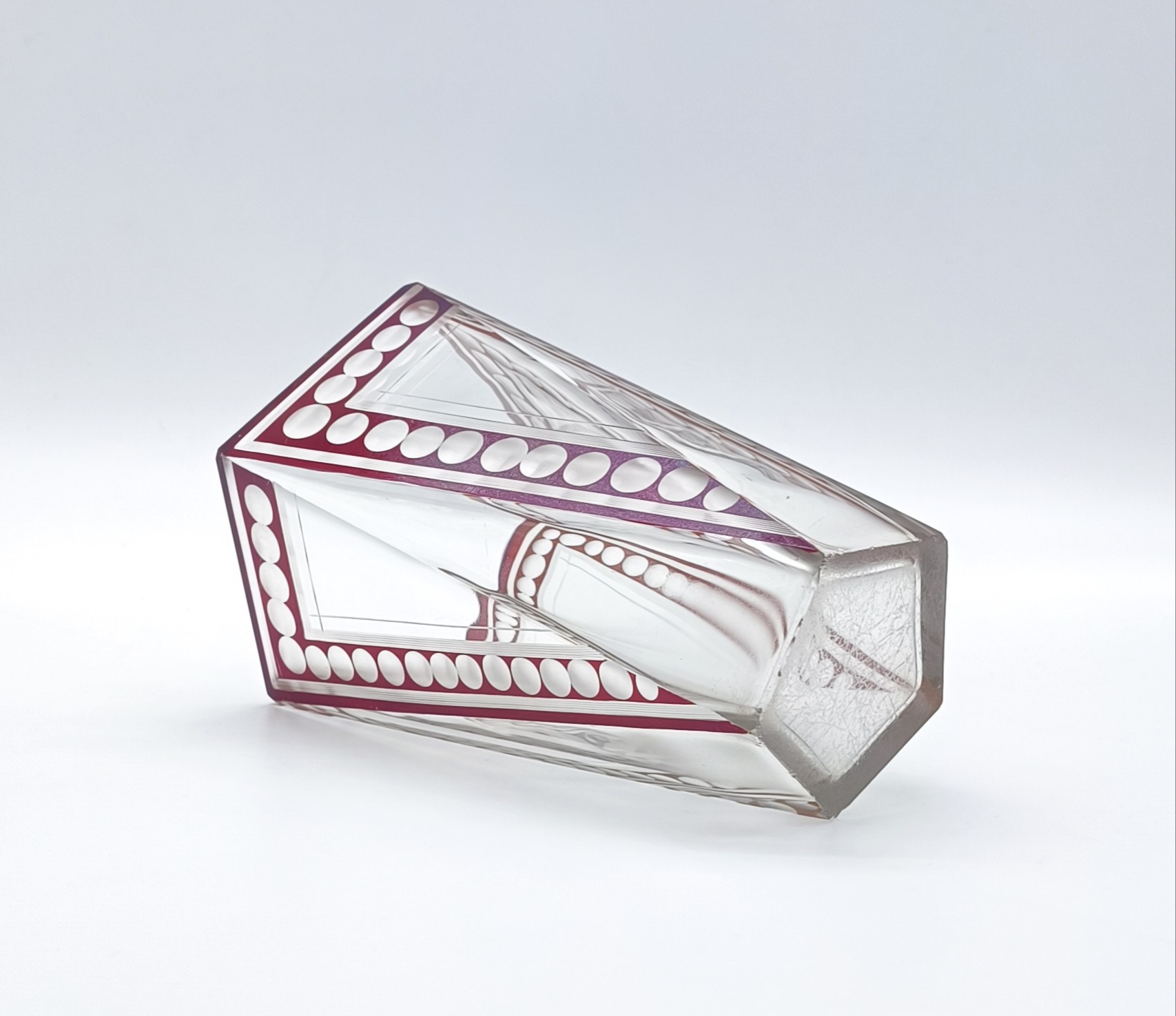 Art deco váza z broušeného a probrušovaného vrstveného skla, uvnitř zlacená lazura, na povrchu rubínová lazura s broušenými čočkami. Váza výjimečného tvaru z dílny Karla Paldy, Československo , Nový Bor, 20.-30. léta 20. století; výška 19,5 cm, průměr 13 cm