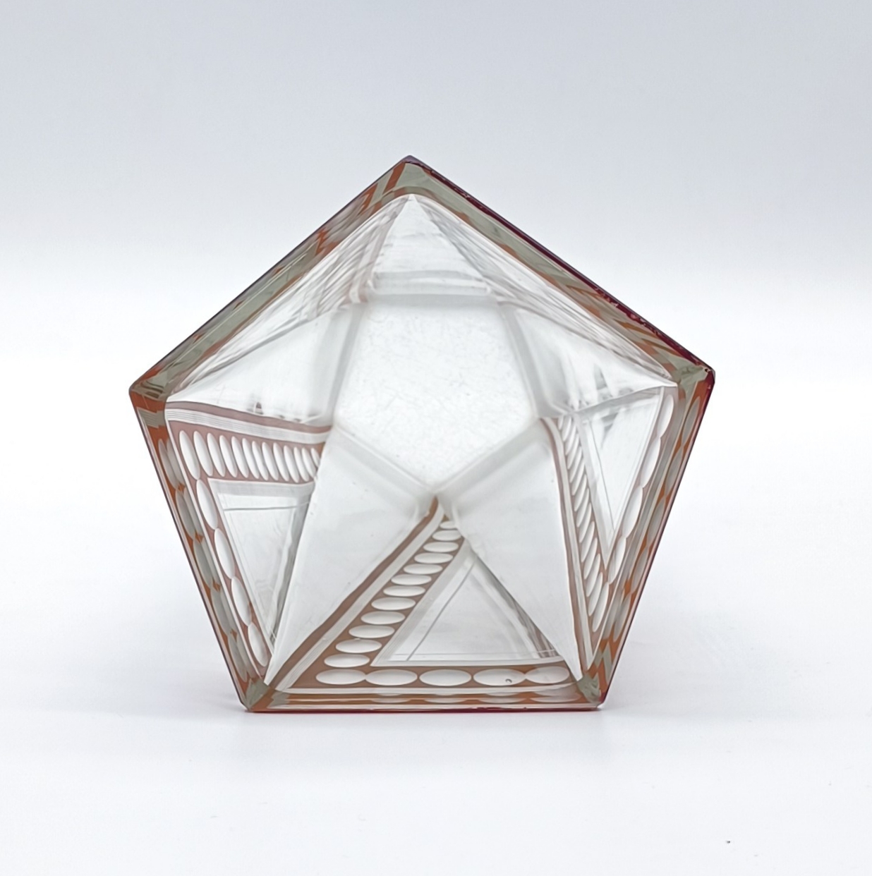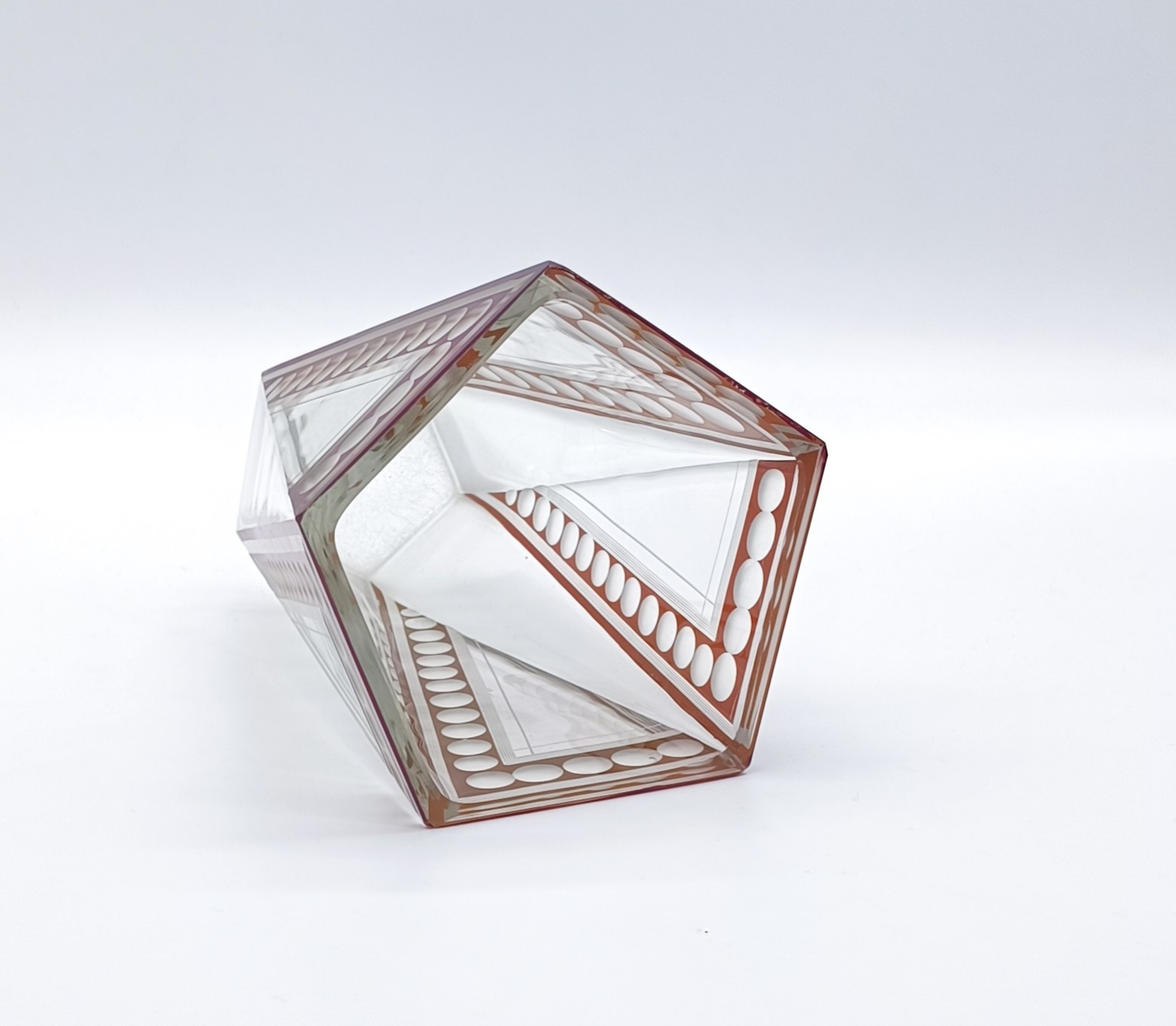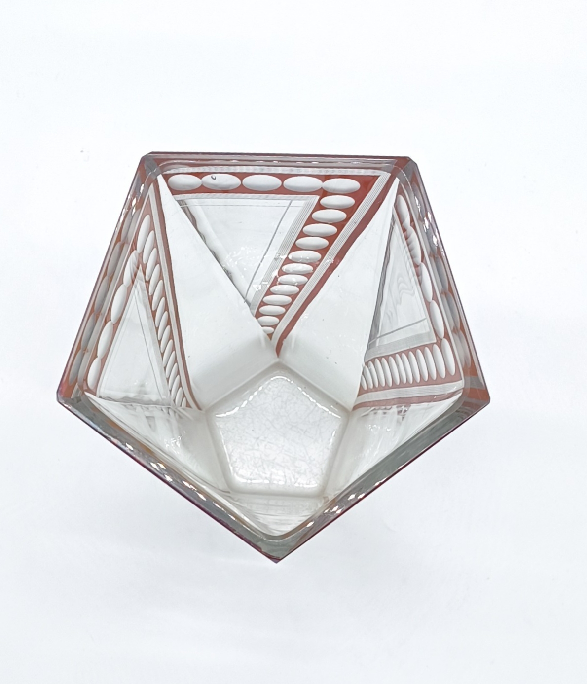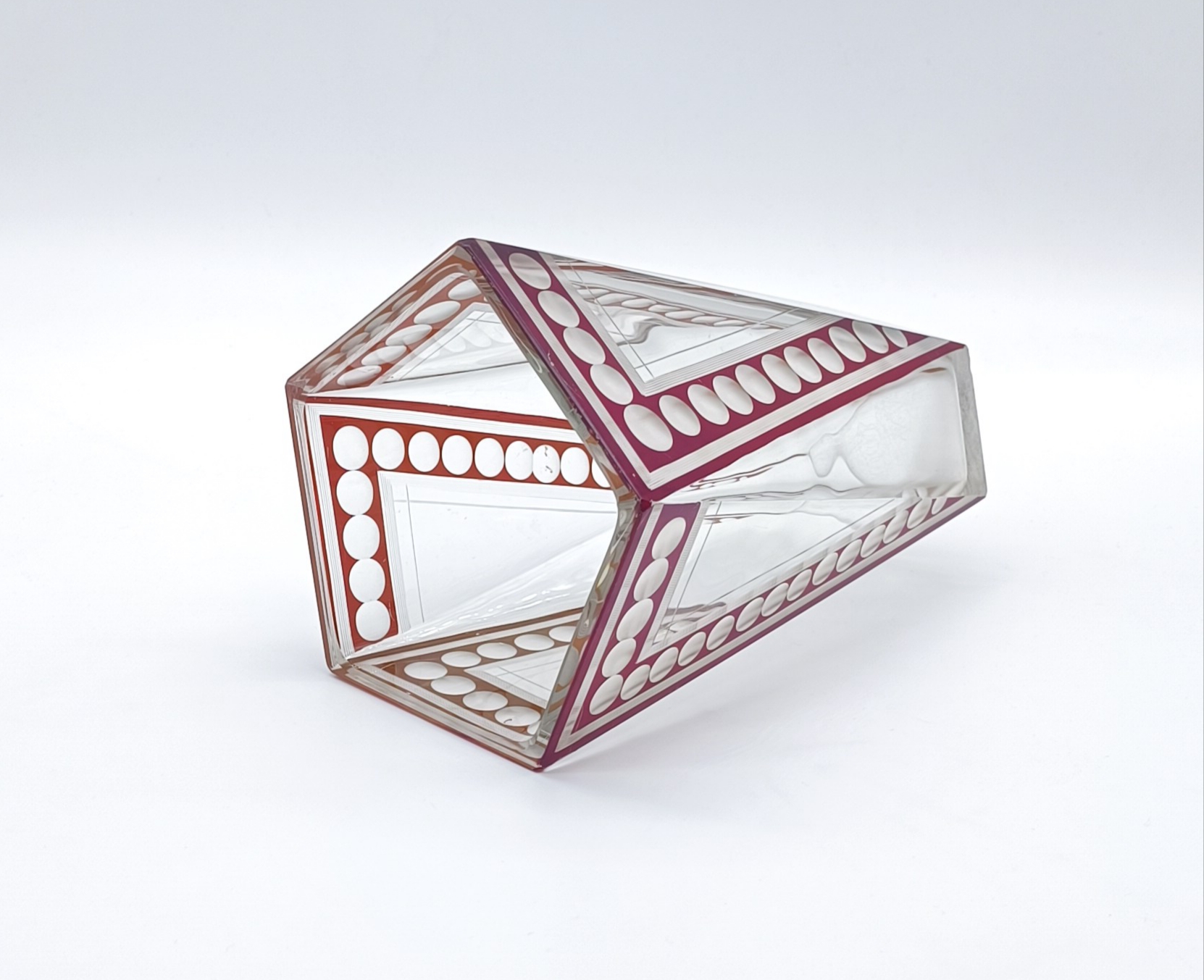 Art deco váza z broušeného a probrušovaného vrstveného skla, uvnitř zlacená lazura, na povrchu rubínová lazura s broušenými čočkami. Váza výjimečného tvaru z dílny Karla Paldy, Československo , Nový Bor, 20.-30. léta 20. století; výška 19,5 cm, průměr 13 cm