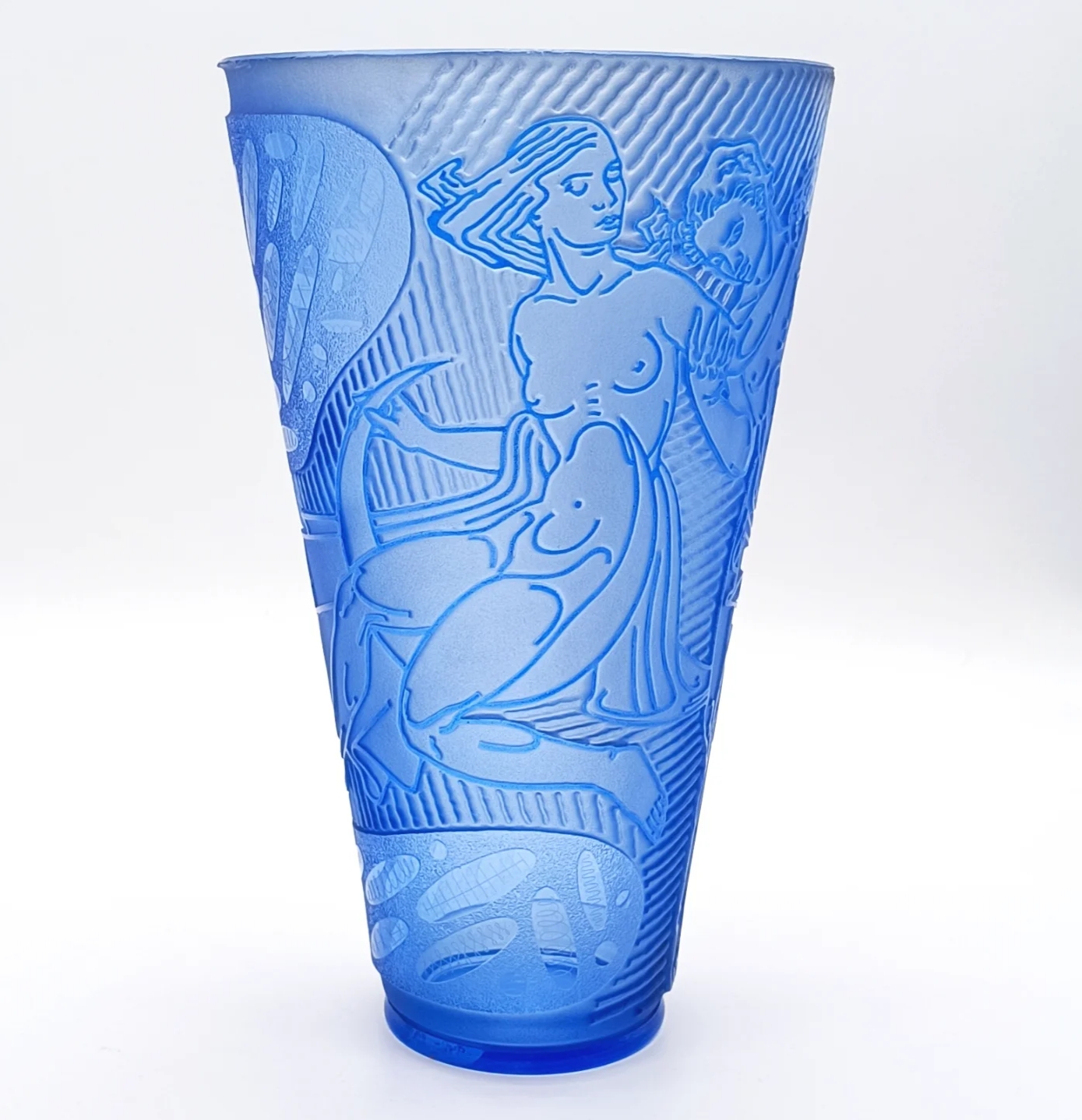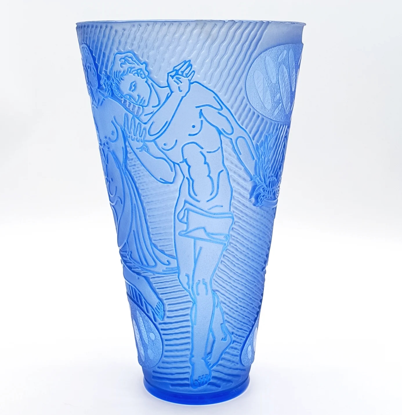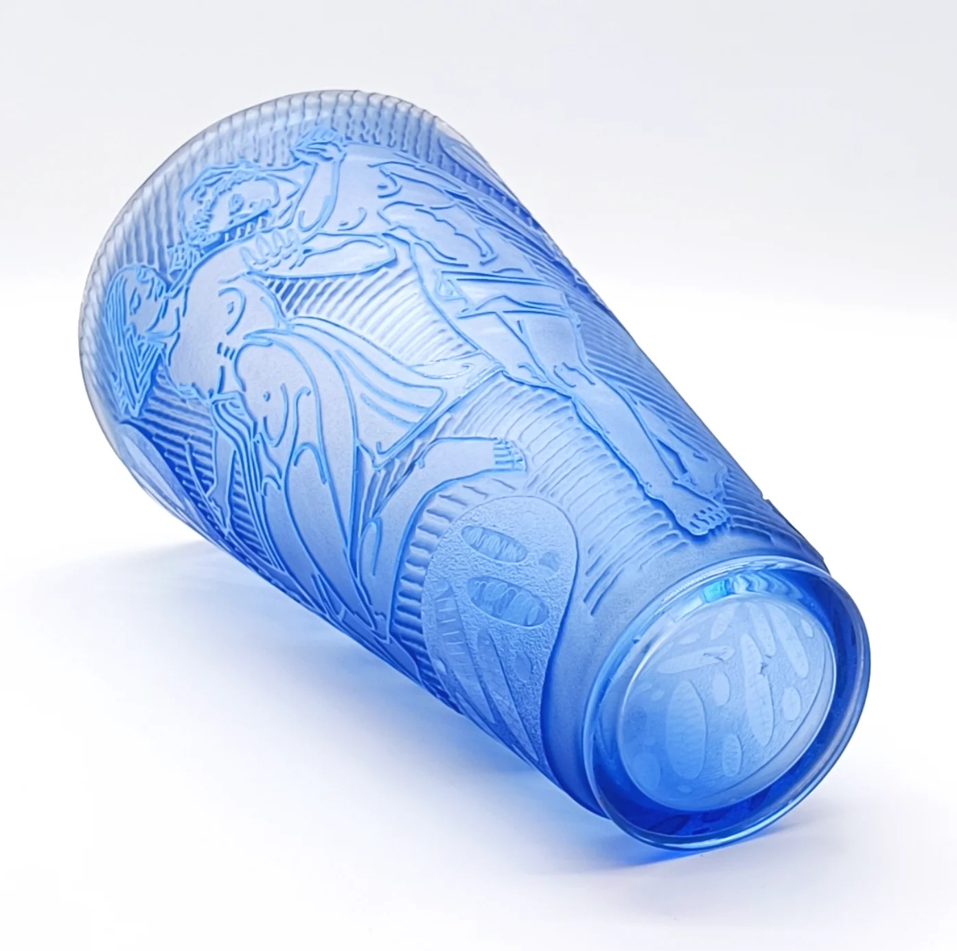 Krásná velká váza, detailně propracované broušení, s motivem Adam a Eva v ráji, na spodní straně je značena 175/36-SS-ZB, Železný Brod, Československo, rok 1936; výška 31 cm, šířka 19 cm