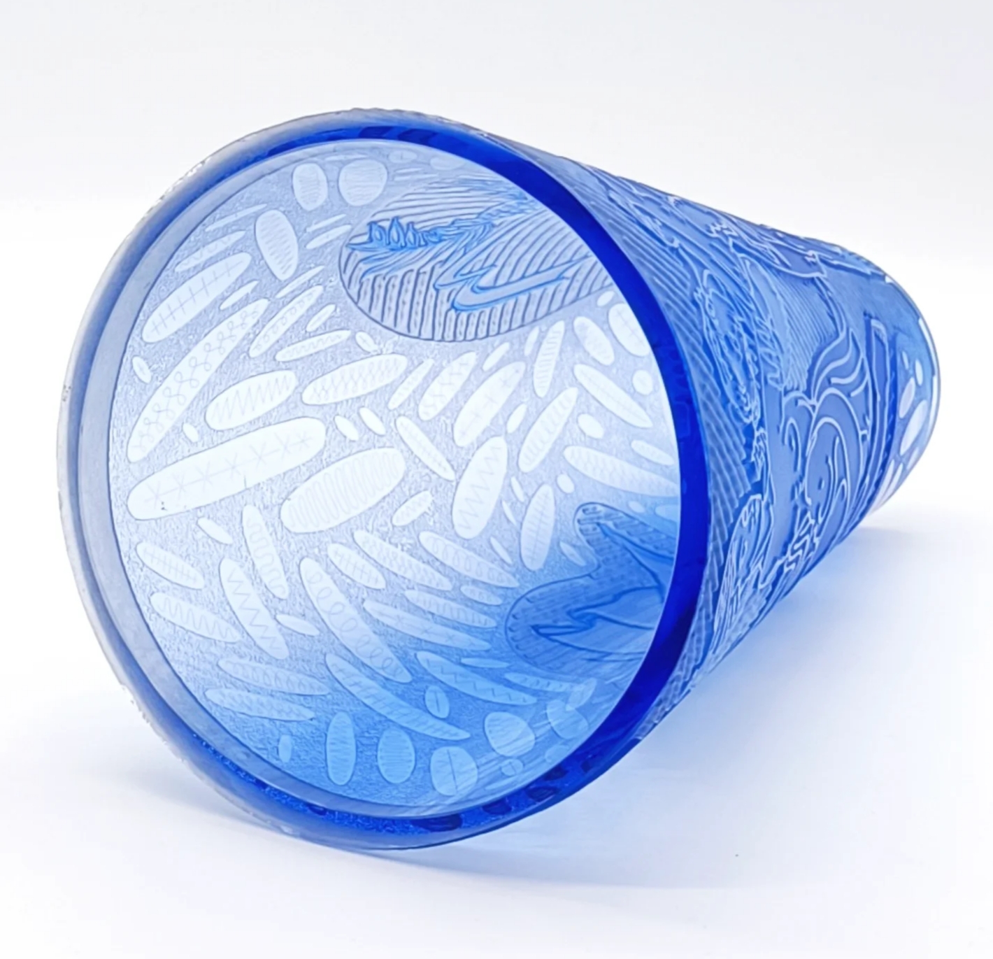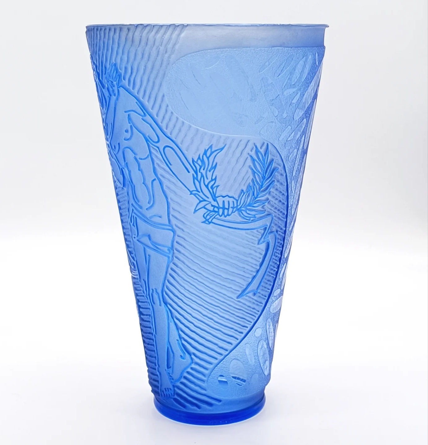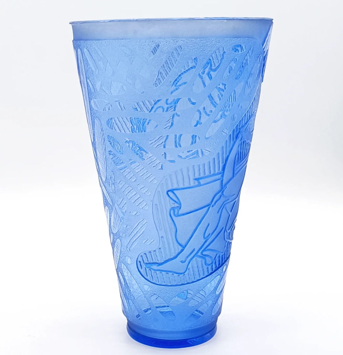 Krásná velká váza, detailně propracované broušení, s motivem Adam a Eva v ráji, na spodní straně je značena 175/36-SS-ZB, Železný Brod, Československo, rok 1936; výška 31 cm, šířka 19 cm