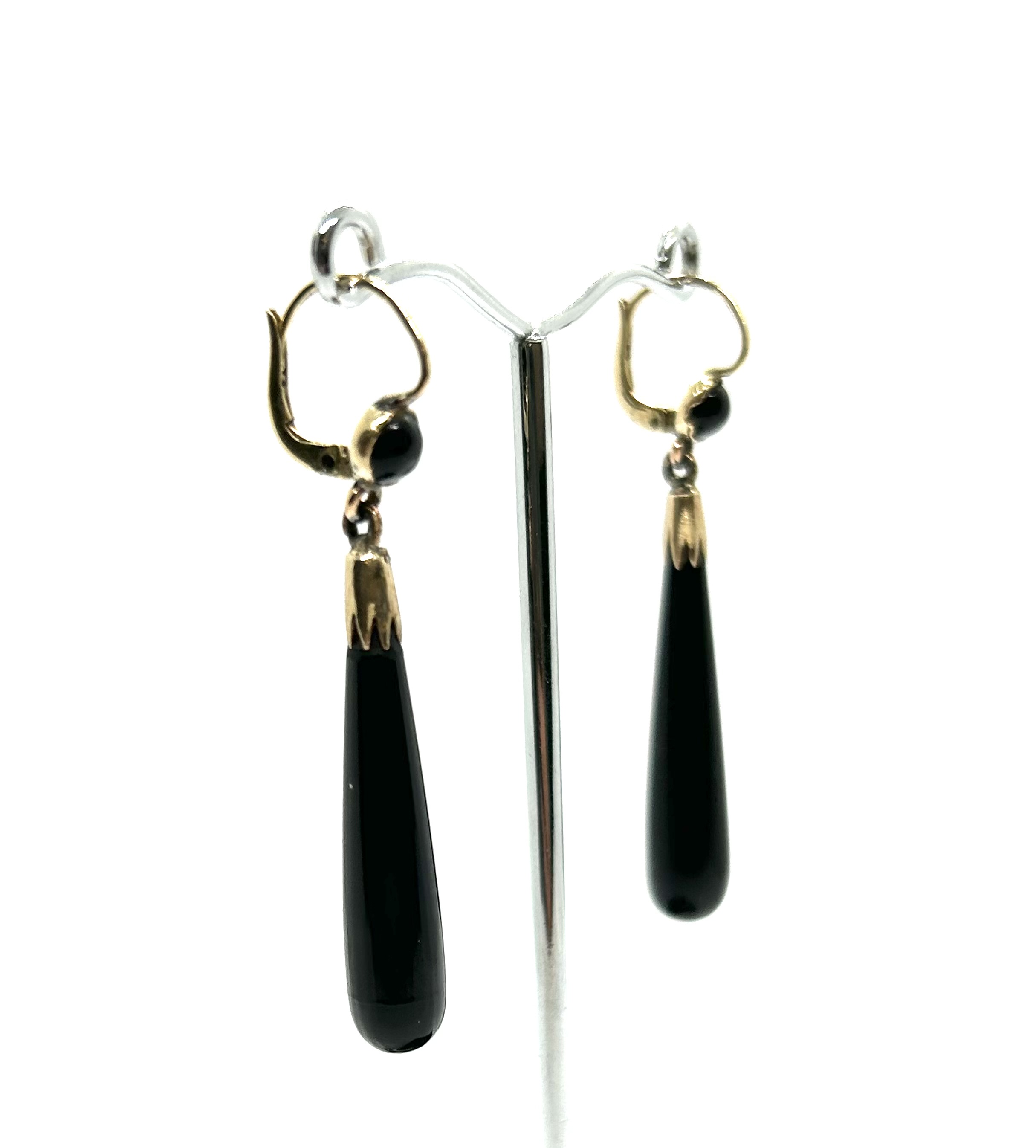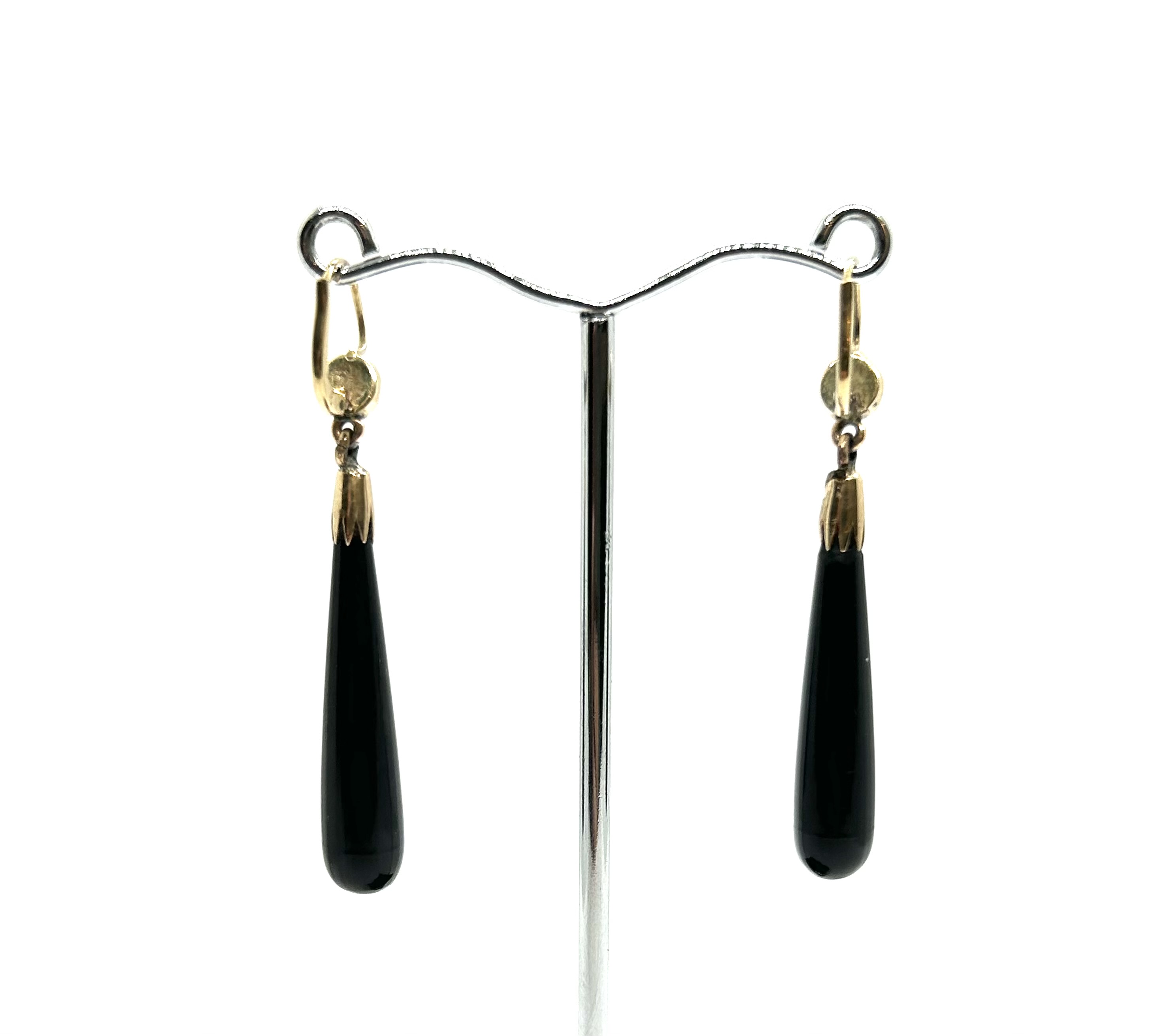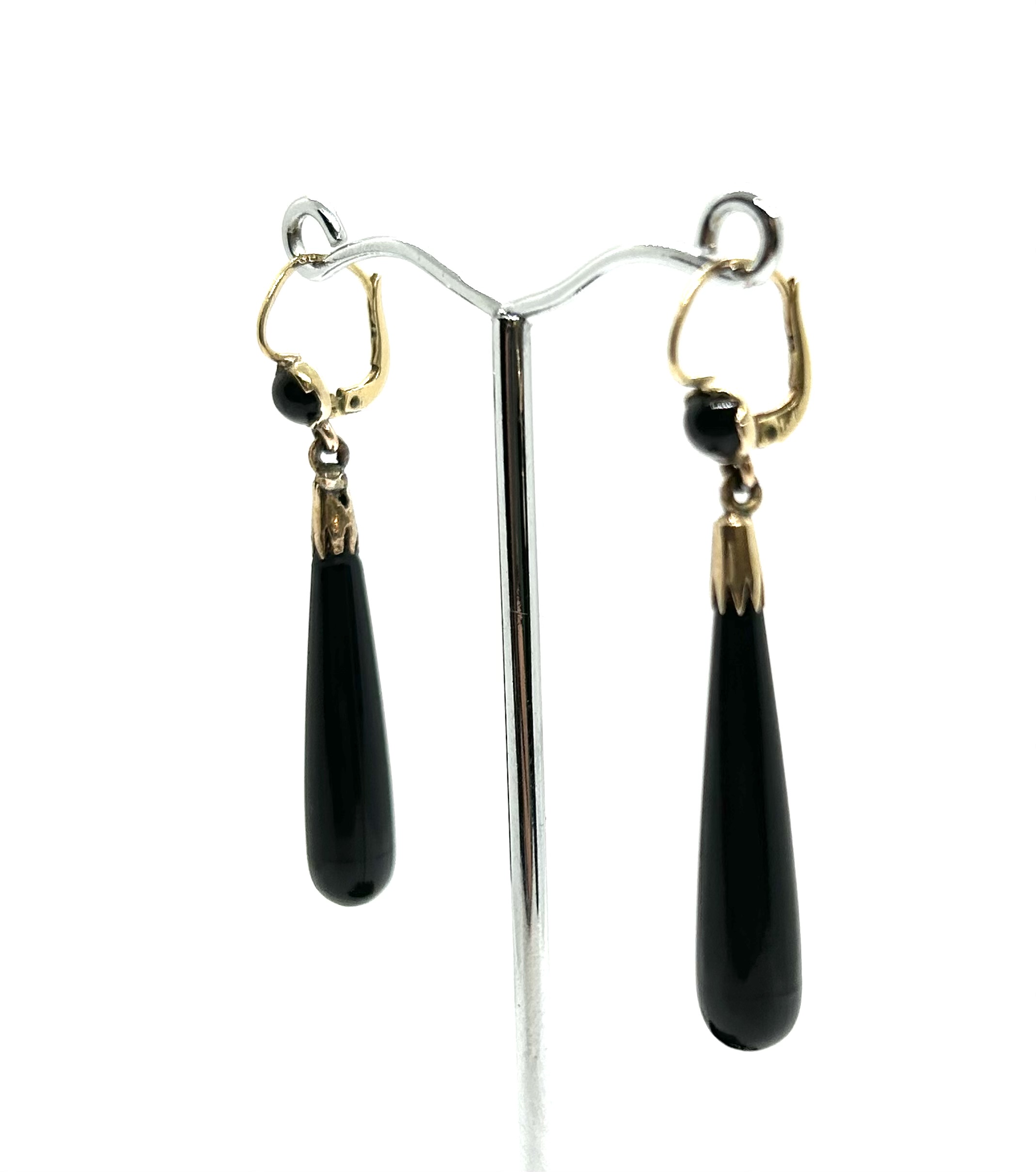 Art deco zlaté elegantní náušnice s přírodními leštěnými onyxy z 30. let minulého století, západní Evropa, Au btto 5,15 g, 500/1000 a 585/1000, kroužky u ověsu z obecného kovu; délka 5 cm. Náušnice jsou ve výborném stavu a je k nim přiložen atest Puncovního úřadu České republiky.