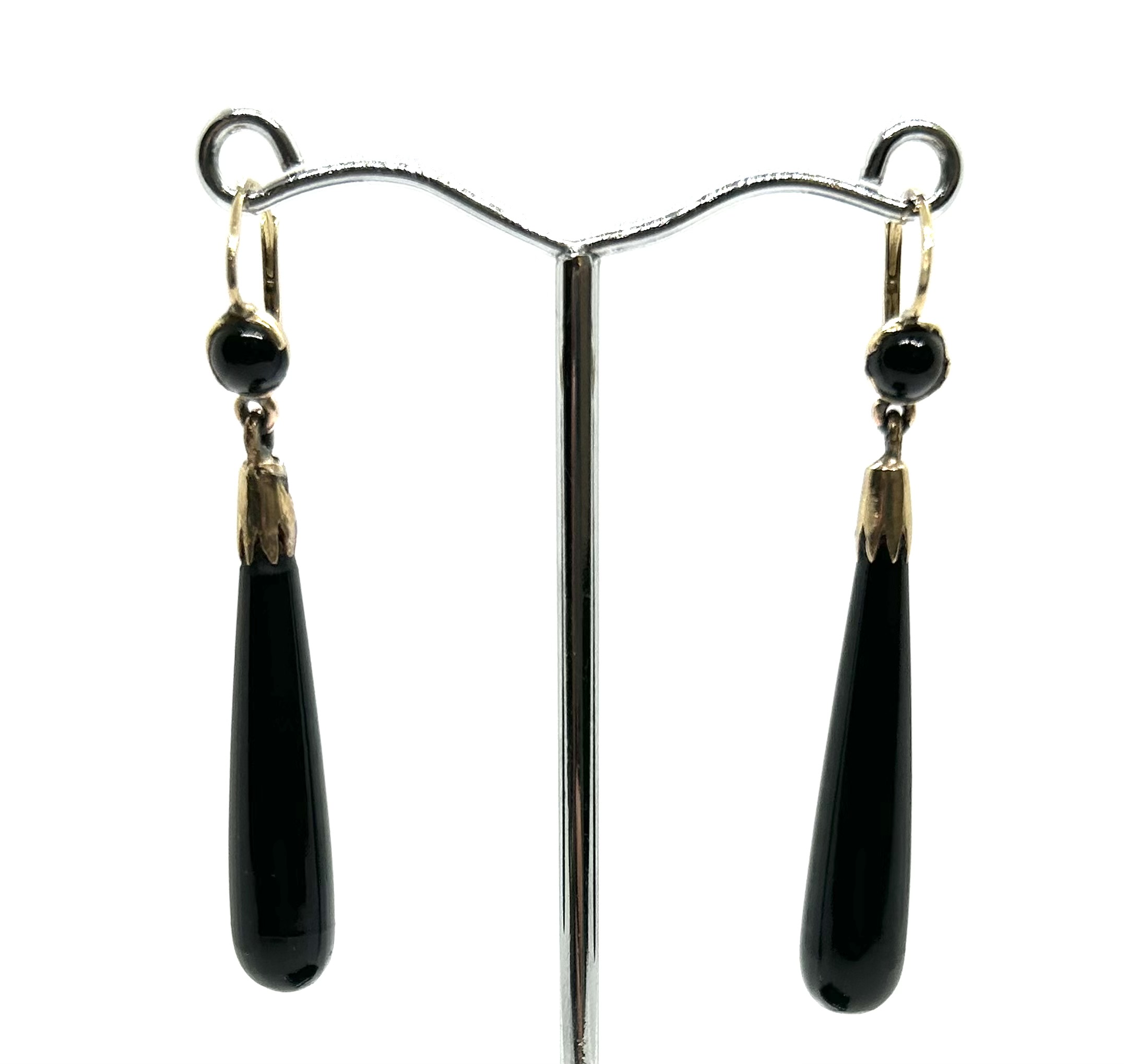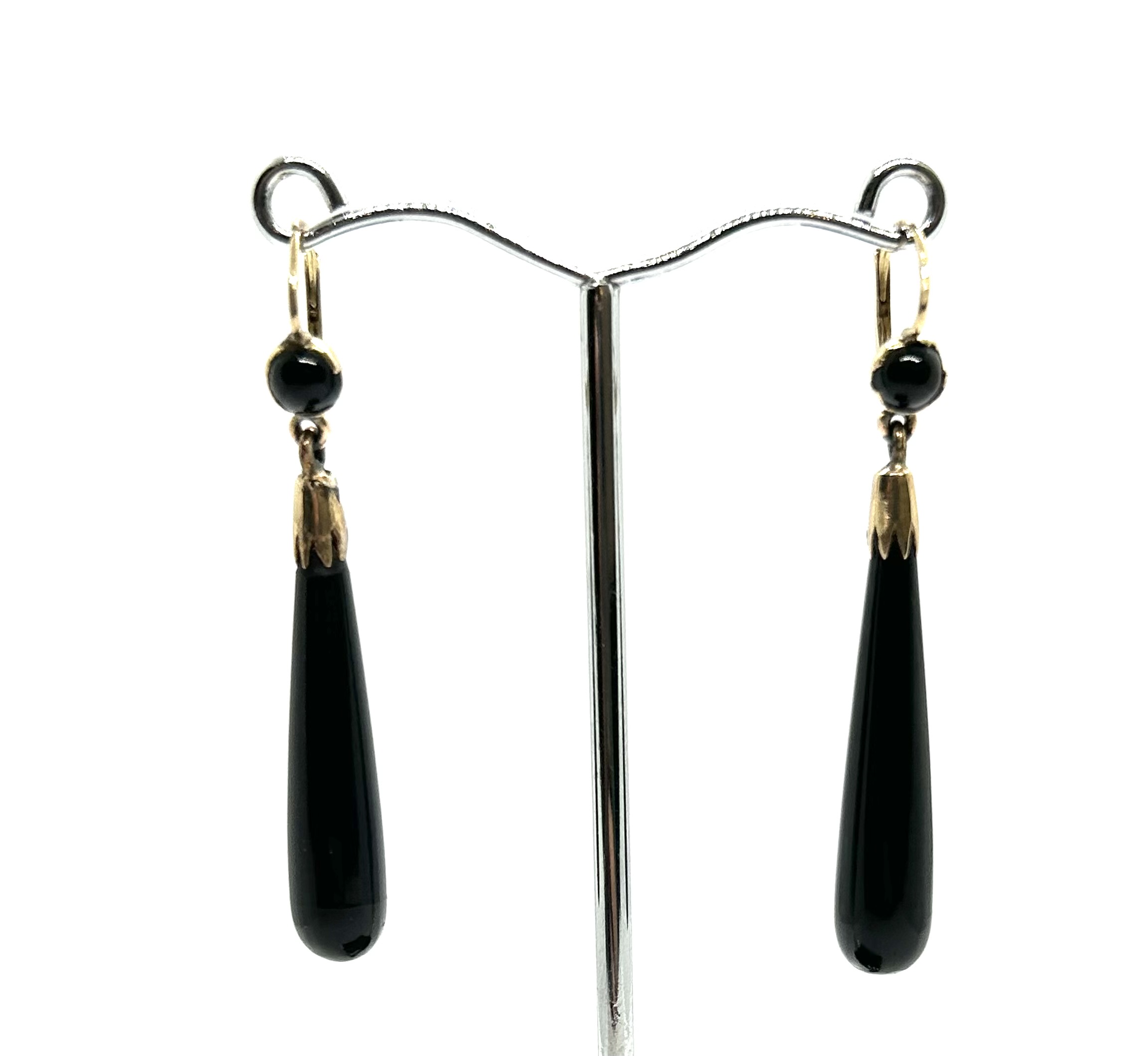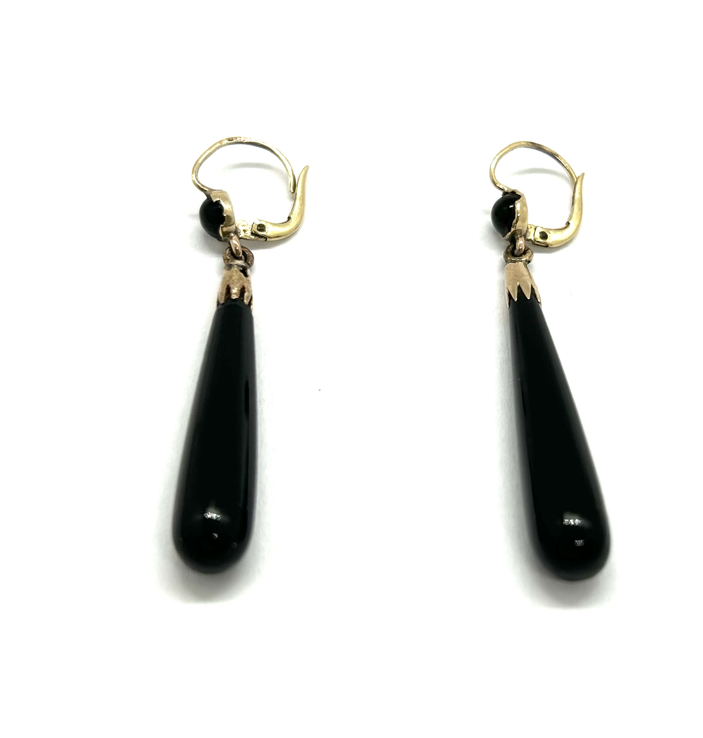 Art deco zlaté elegantní náušnice s přírodními leštěnými onyxy z 30. let minulého století, západní Evropa, Au btto 5,15 g, 500/1000 a 585/1000, kroužky u ověsu z obecného kovu; délka 5 cm. Náušnice jsou ve výborném stavu a je k nim přiložen atest Puncovního úřadu České republiky.