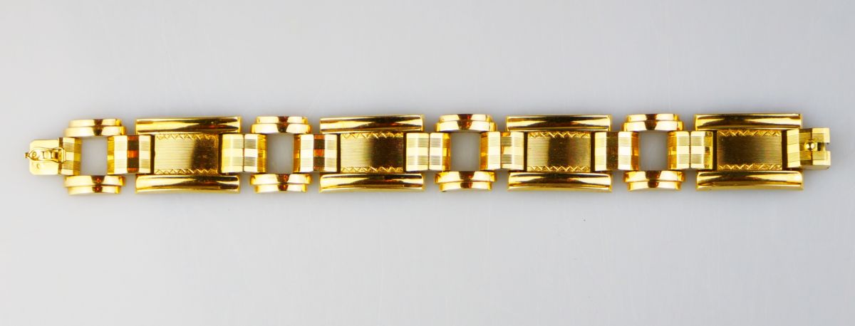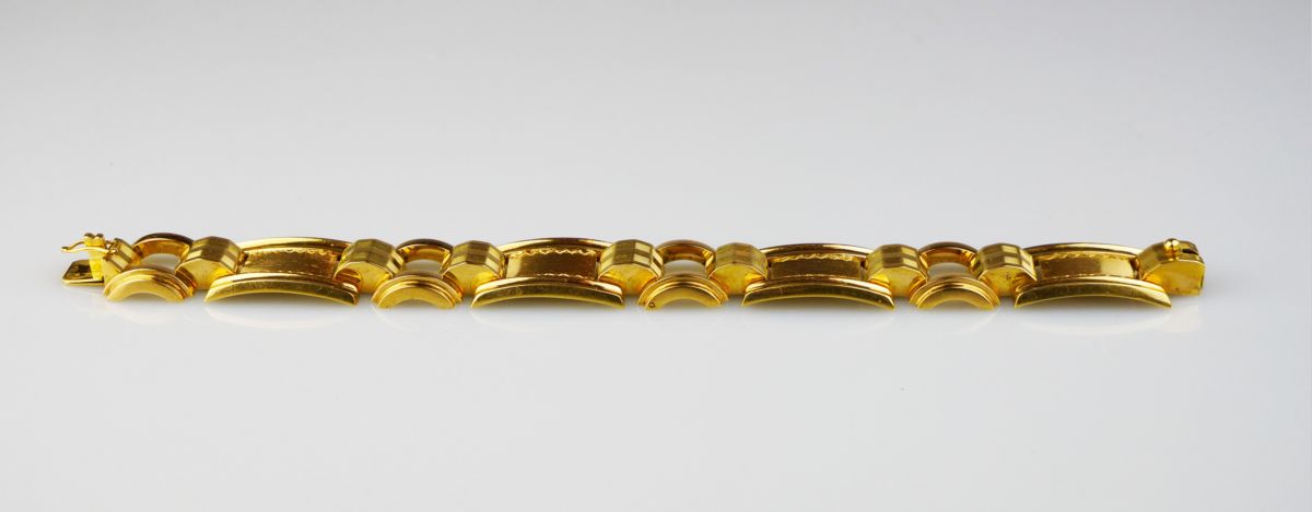 art deco zlatý článkový náramek zdobený gilošováním, Au 27,29 g/585/1000, Československo, kolem r. 1930, dobový punc (lvíček); délka 17,5 cm, šířka 1,8 cm