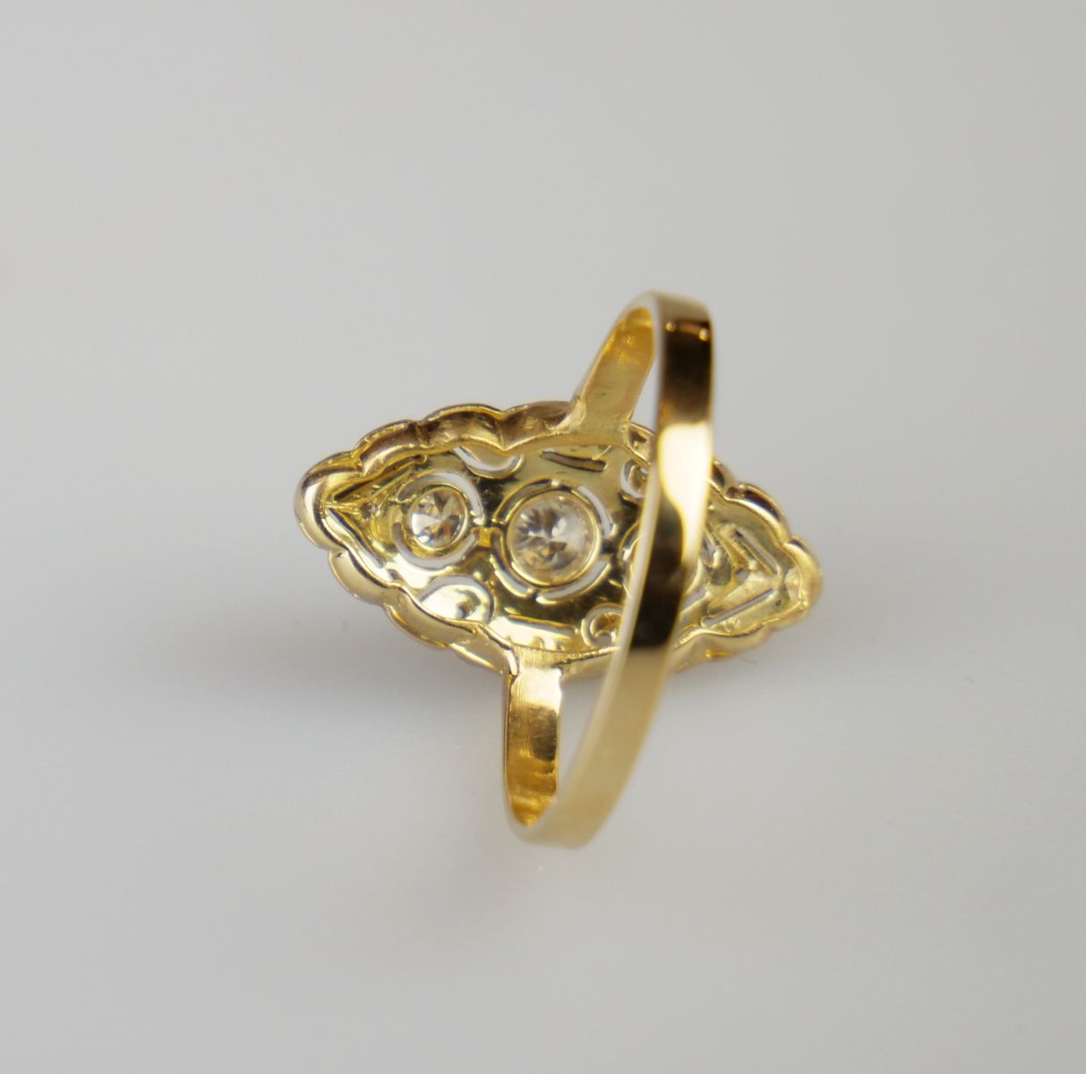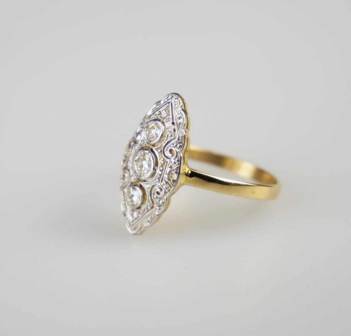art deco prsten ze žlutého (šína) a bílého zlata (hlava) se 3 diamanty kruhového briliantového brusu o celkové hmotnosti cca 0,22 ct a s několika diamantovými routami, Au 2,17 g/585/1000, západní Evropa, kolem r. 1935; rozměry hlavy 1,85 x 1 cm; atest Puncovního úřadu, znalecký posudek; velikost prstenu 50,5