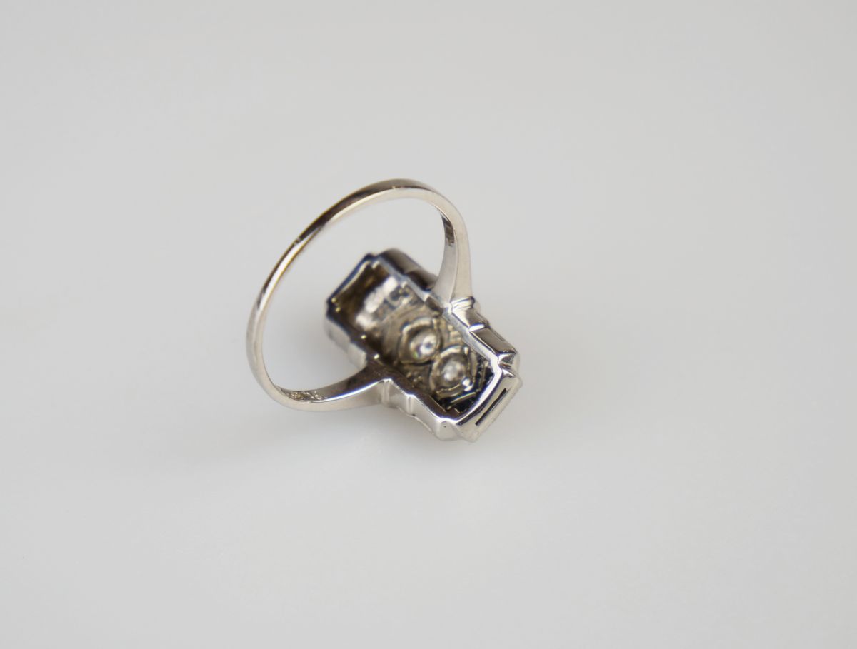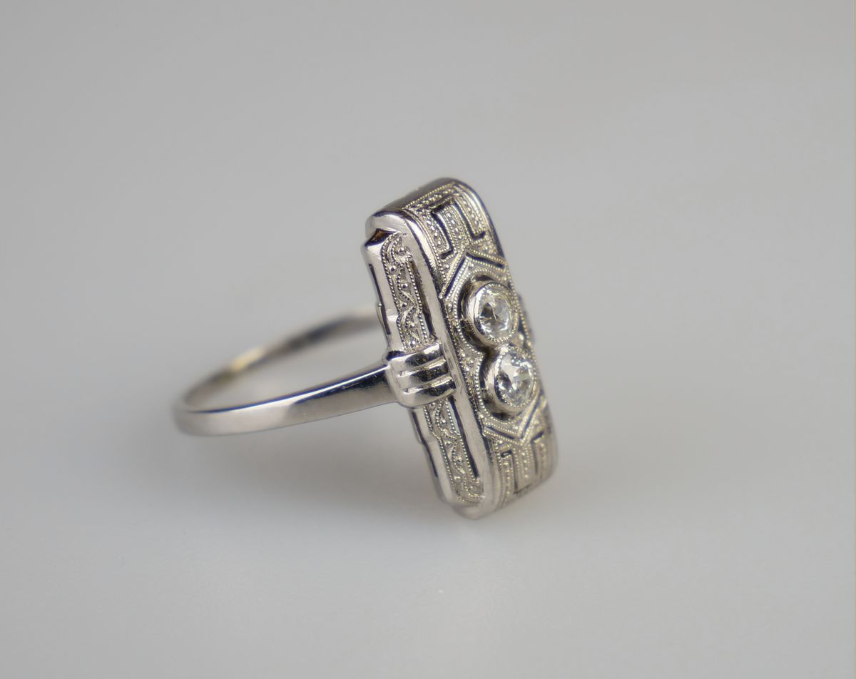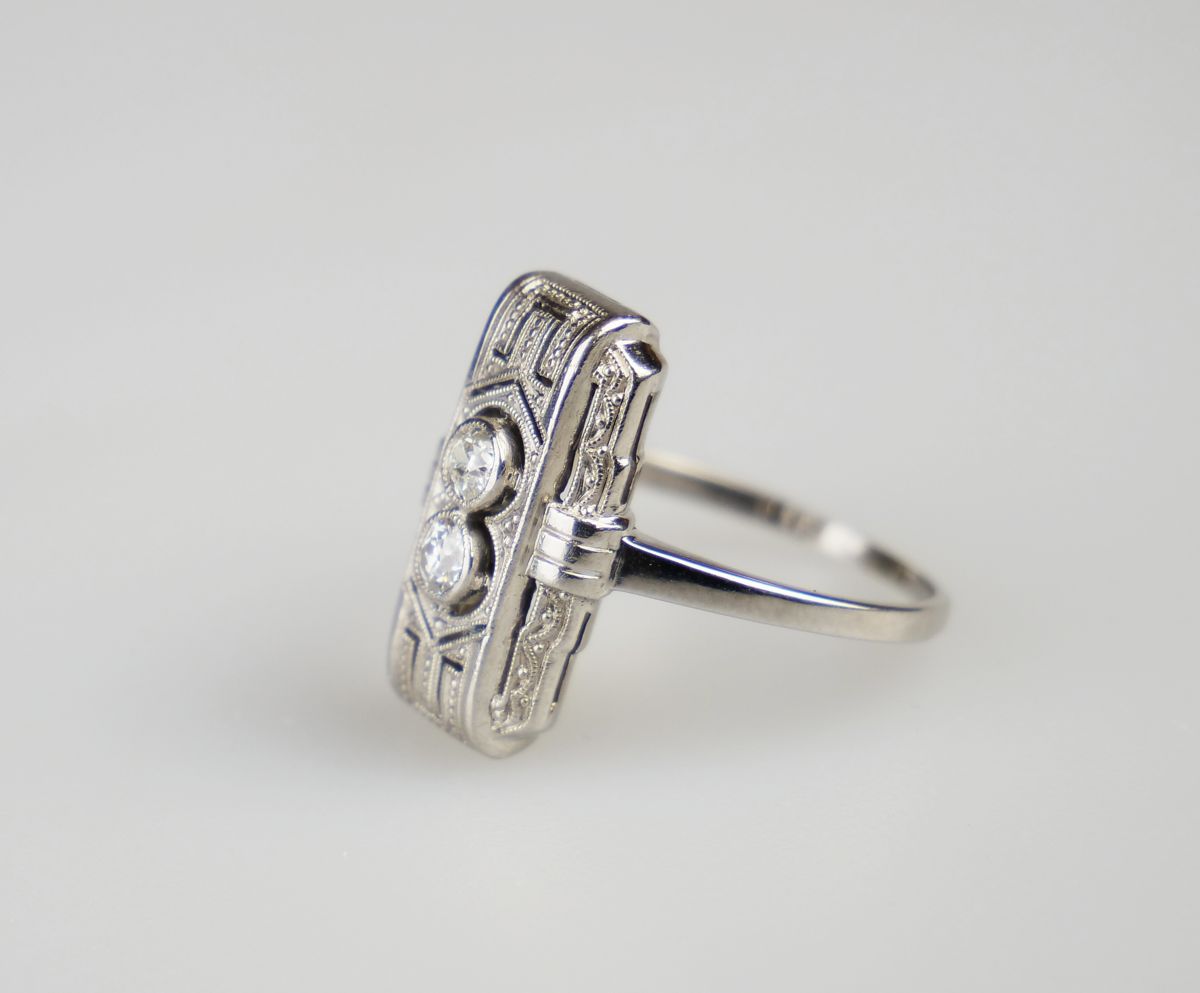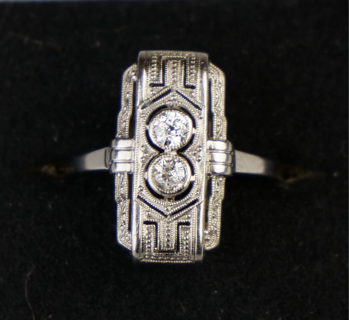 art deco zlatý prsten se dvěma diamanty briliantového brusu o celkové hmotnosti cca 0,2 ct, kameny vsazené v platině, Au+Pt 2,62 g/585+950/1000, střední Evropa, kolem r. 1935, rozměry hlavy 1,8 x 1 cm; atest Puncovního úřadu; velikost prstenu 52