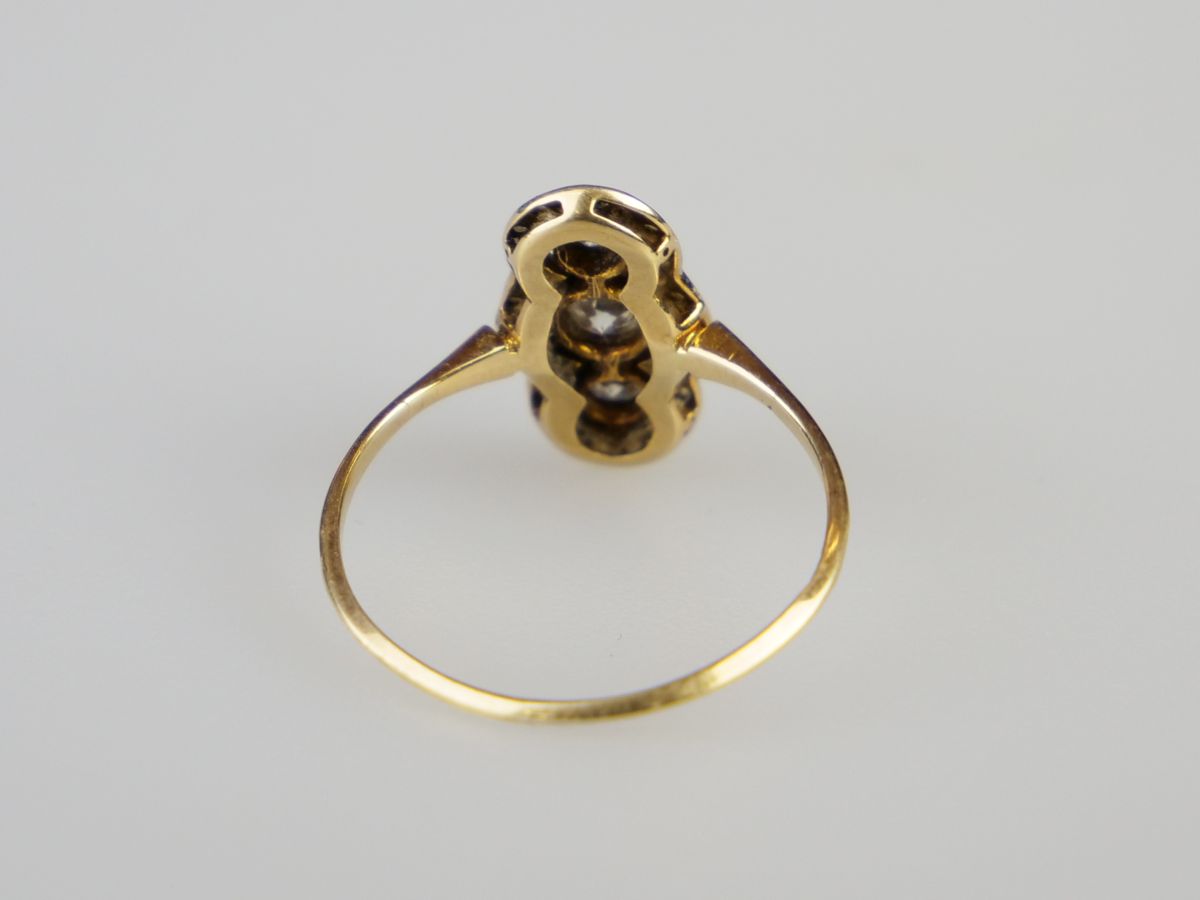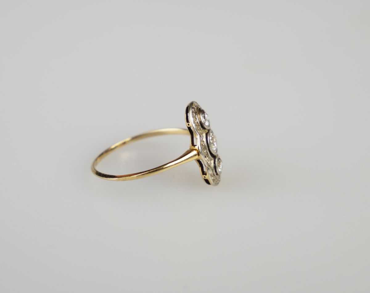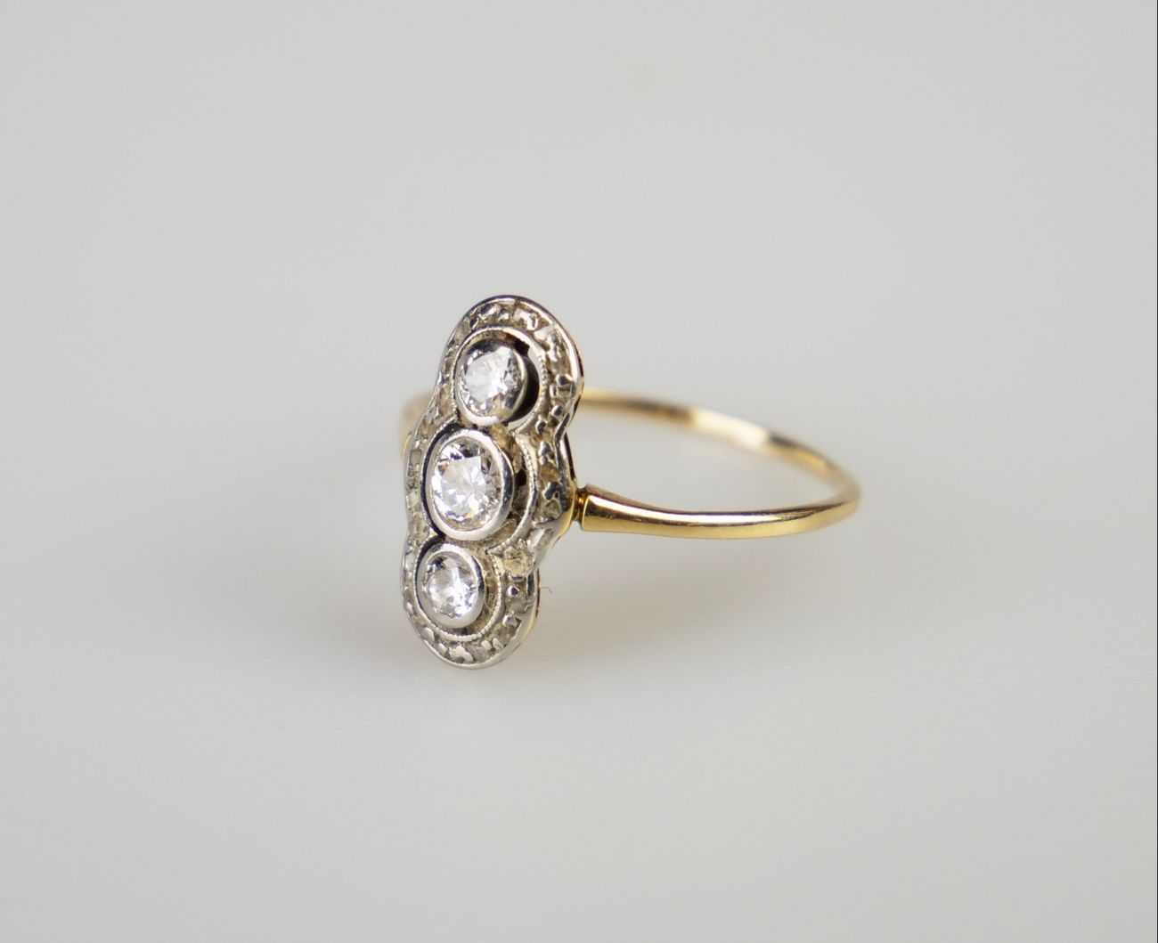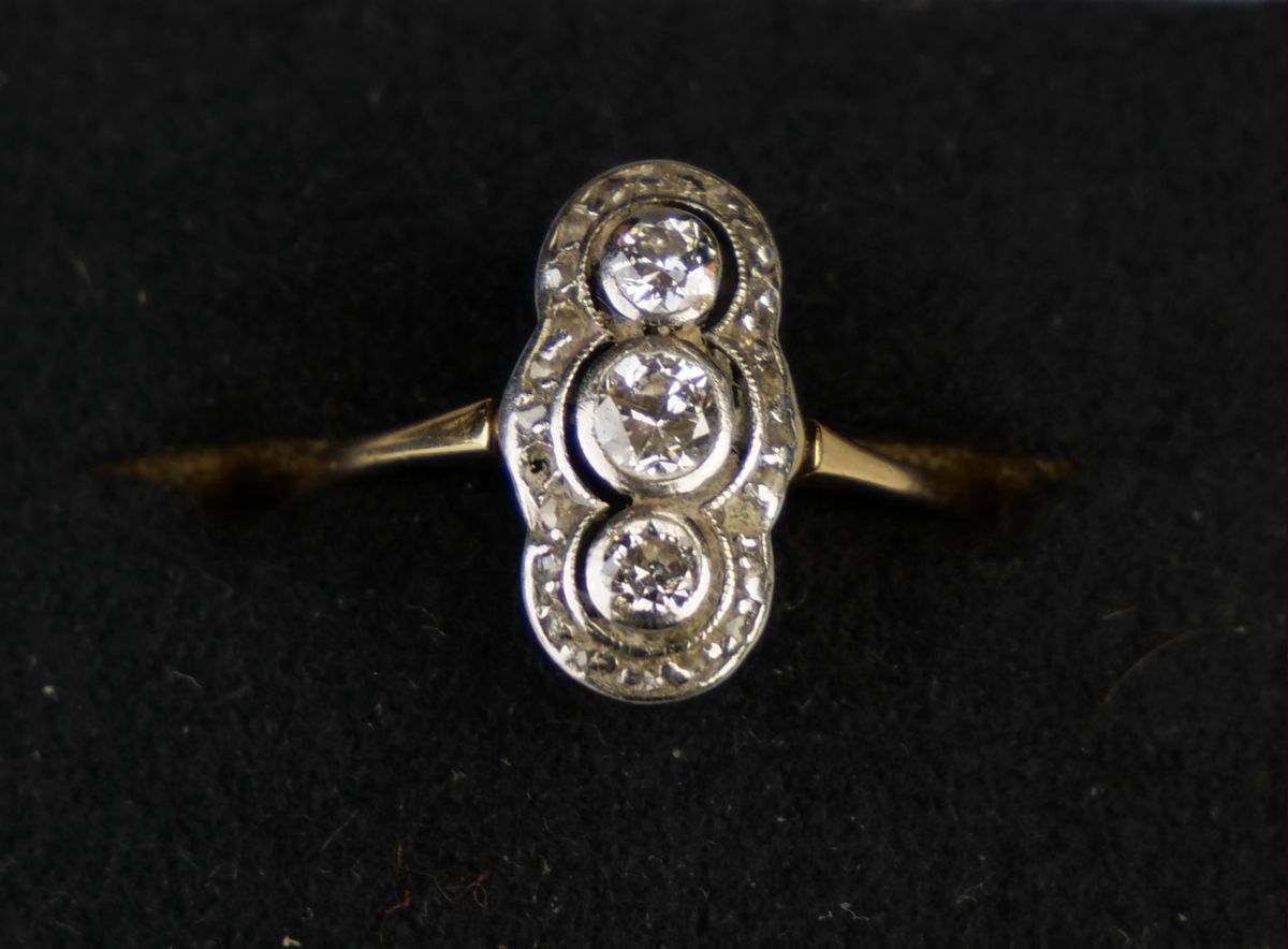 art deco zlatý prsten se třemi diamanty briliantového brusu o celkové hmotnosti cca 0,29 ct, kameny vsazené v platině, Au+Pt 1,30 g/540+950/1000, střední Evropa, kolem r. 1935, rozměry hlavy 0,7 x 1,4 cm; atest Puncovního úřadu; velikost prstenu 50