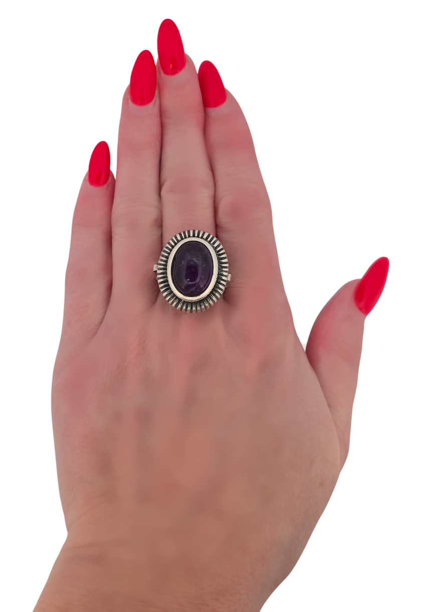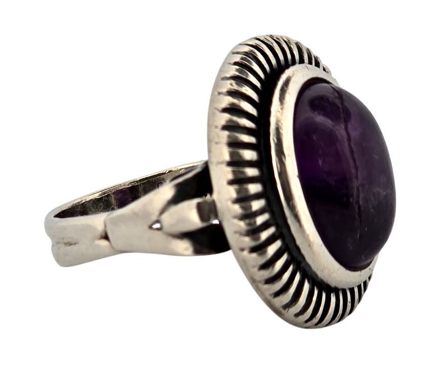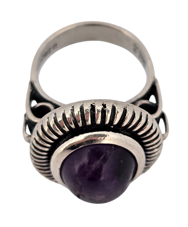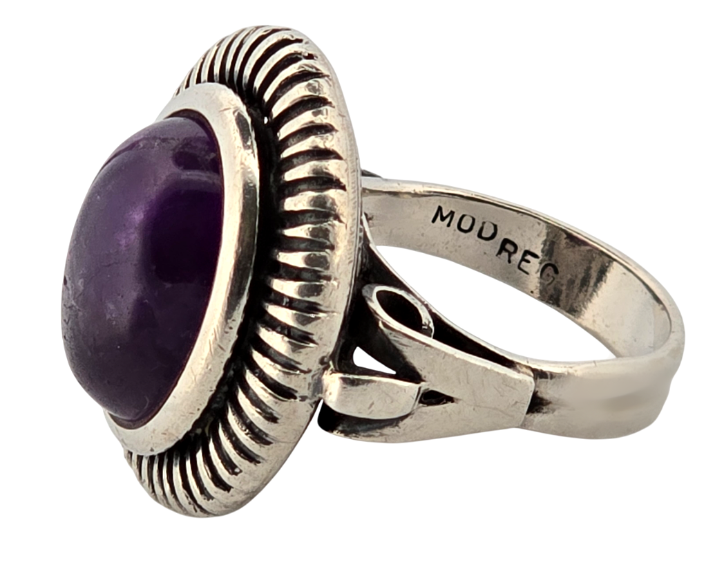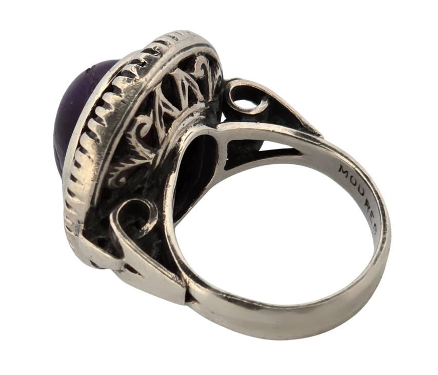 Popis: Stříbrný starožitný Art Deco prsten s přírodním kabošonem sytě fialového ametystu. Zdvojená obruba, ozdobné prořezávání. Zdobení i ze spodní strany. Na vnitřní straně označení \“MOD REG\“, tedy Model Registered, což znamená registrovaný model. Tedy design prstenu byl oficiálně zaregistrován u příslušného úřadu pro ochranu duševního vlastnictví (patentový úřad). Nádherný masivní Art Deco šperk.