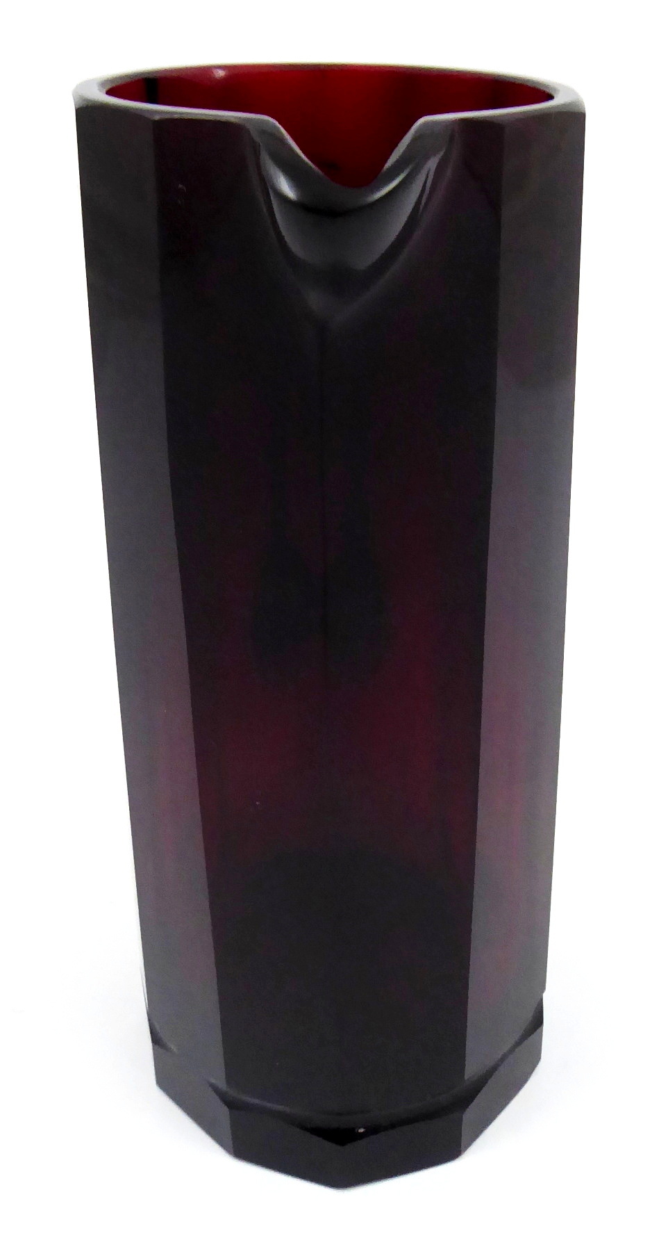 Rubínové ručně broušené sklo (zlatý rubín). Období a styl: biedermeier. Vysoce elegantní džbánek z rubínového skla krásné barevnosti ručně broušený do svislých fazet. Ve výborném stavu. Zajímavý sběratelský i dekorativní kousek. Čechy 1830 – 1840. Výška 15 cm.