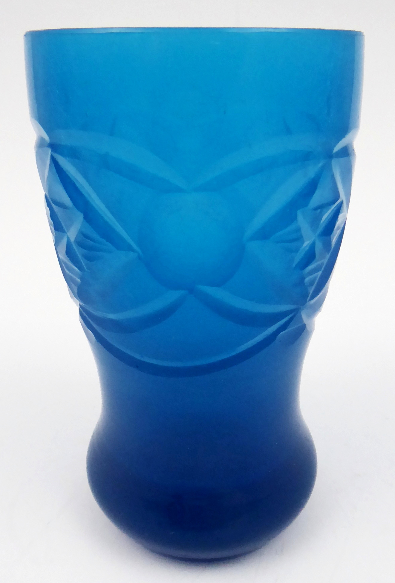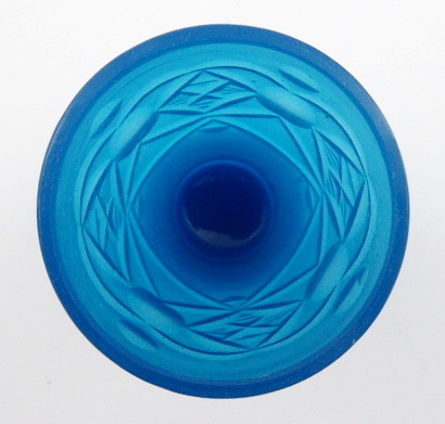 Světle modré opálové ručně broušené sklo. Období a styl: biedermeier. Biedermeierová číše ze světle modrého opálového skla zdobená ručně broušenými reliéfními medailony se stylizovanými čtyřlístky a čočkami různých velikostí. Čechy 1840 – 1870. Výška 11,5 cm.