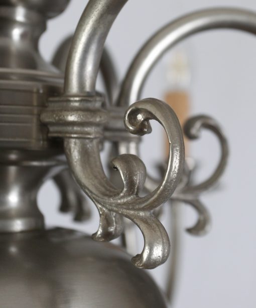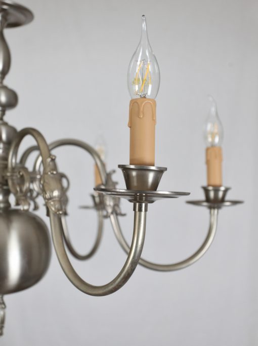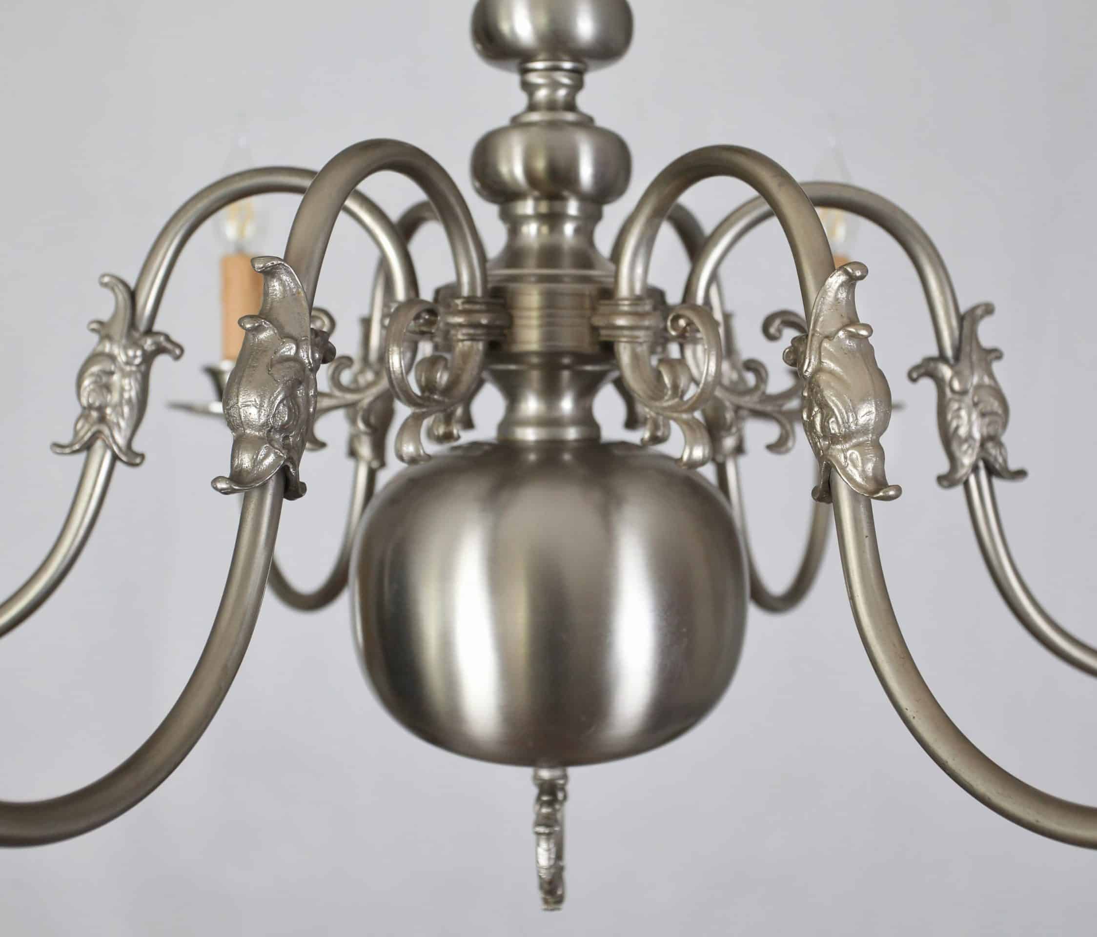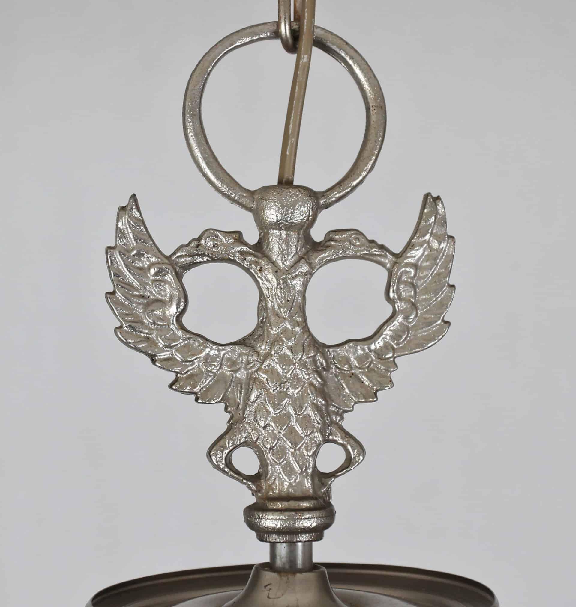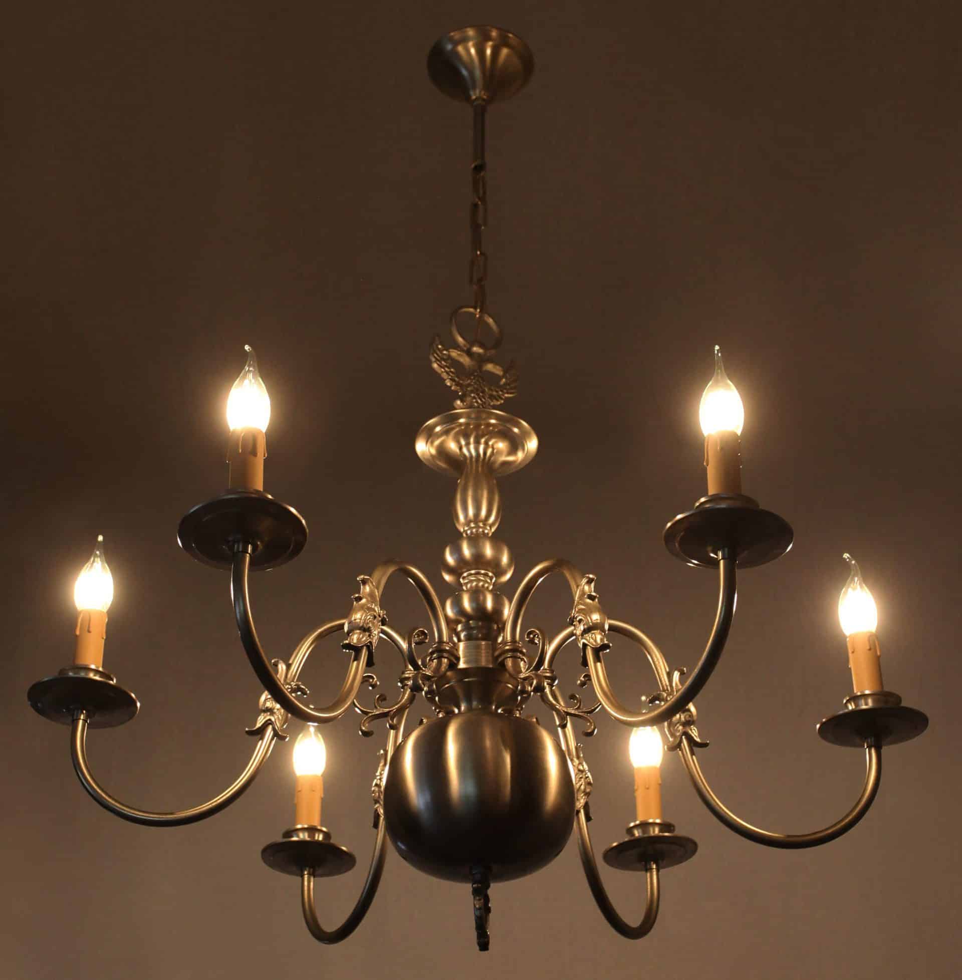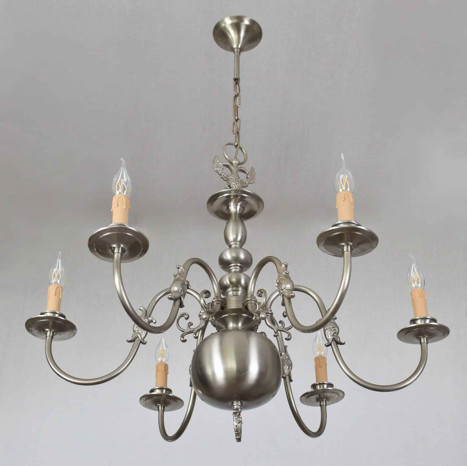 Šestiramenný lustr zdobený rybami a orlicí. Lustr je vyroben z bílé mosazi. Zrestaurovaná elektroinstalace: nové kabely, objímky i krytky – ihned k užívání. Žárovky s klasickým svíčkovým závitem E14 do 60W (vhodné jsou klasické i led žárovky).