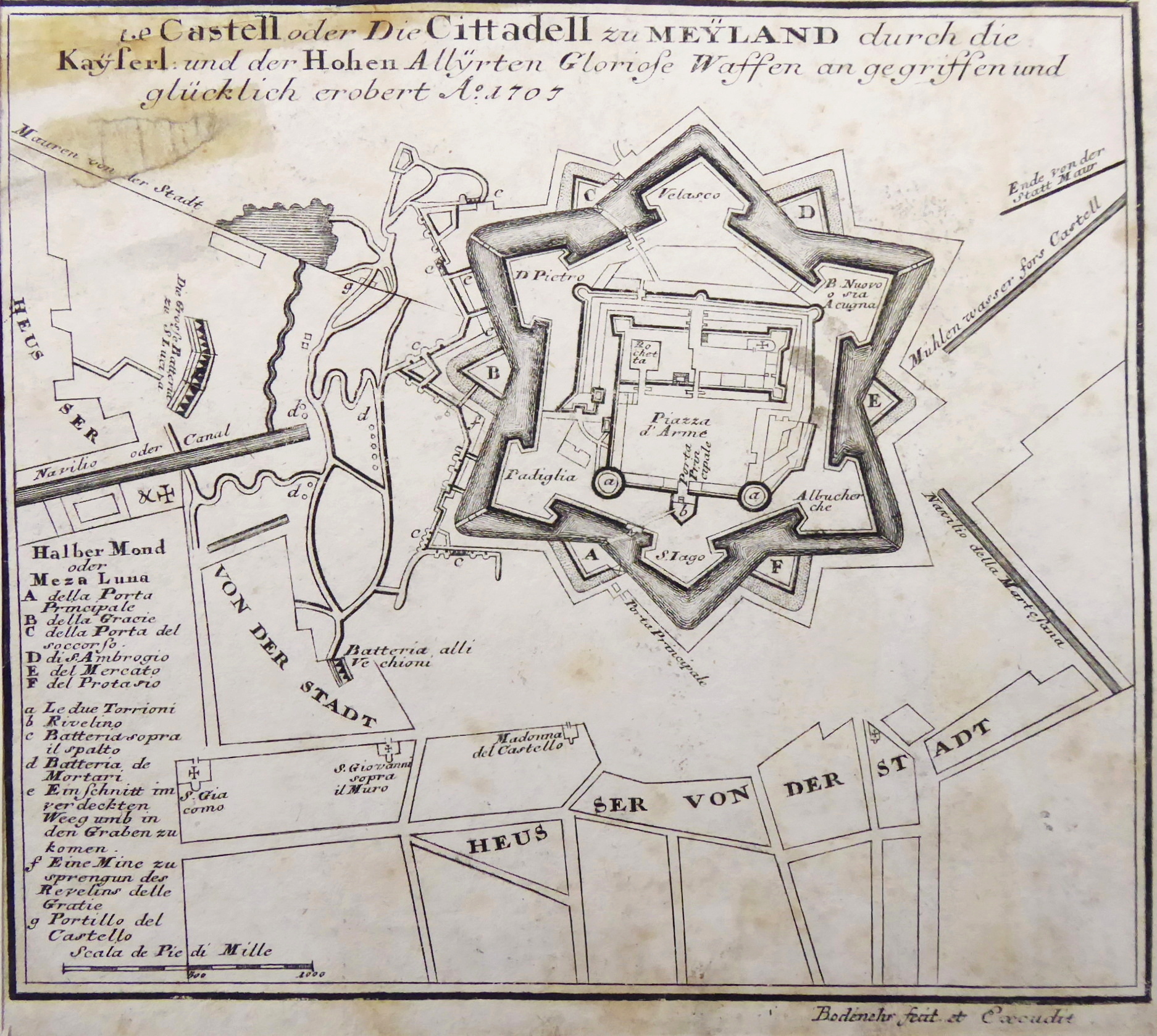 Německo, Augsburg 1704-1720. Mědirytina na papíru 16,4 cm x 18,3 cm. Značeno vpravo dole: Bodenehr, fecit et Excudit. V. Nahoře nápis: Die Cittadel zu Meyland s doplňujícím textem. Ze slavné knihy Gabriel Bodenehr – Europeans Macht und Pracht, ze série rytin zobrazujících pohledy na evropská města, jejich plány, pevnosti a hrady. Autor: Gabriel Bodenehr starší (1664-1758) byl německý kartograf a člen slavné rytecké a vydavatelské rodiny z Augsburgu. Jeho hlavním dílem byl \“Atlas Curieux oder neuer und compendieuser Atlas\“ vydaný poprvé roku 1704. Celkový rozměr s paspartou 30 cm x 33 cm. Nerámováno. Z umělecké sbírky Ladislava Šalouna.
