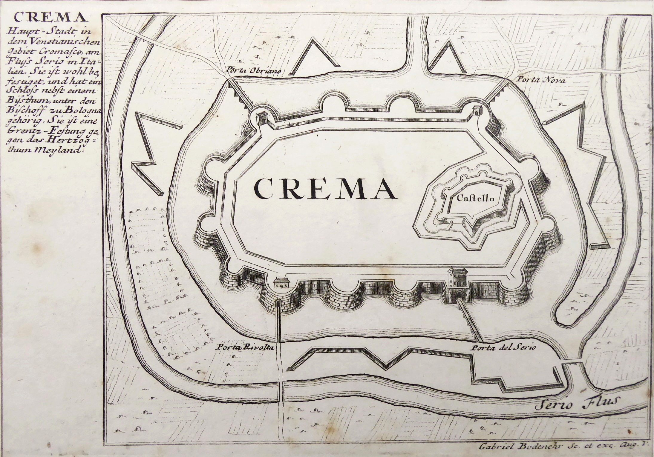 Německo, Augsburg 1704-1720. Mědirytina na papíru 14,8 cm x 22 cm. Značeno vpravo dole: Gabriel Bodenehr, Sc. et exc. Aug. V. Vlevo nahoře nápis: CREMA a popis architektonických objektů, geografických míst a pamětihodností města. Ze slavné knihy Gabriel Bodenehr – Europeans Macht und Pracht, ze série rytin zobrazujících pohledy na evropská města, jejich plány, pevnosti a hrady. Autor: Gabriel Bodenehr starší (1664-1758) byl německý kartograf a člen slavné rytecké a vydavatelské rodiny z Augsburgu. Jeho hlavním dílem byl \\\“Atlas Curieux oder neuer und compendieuser Atlas\\\“ vydaný poprvé roku 1704. Rytec: August Vind. Celkový rozměr s paspartou 30 cm x 33 cm. Nerámováno. Z umělecké sbírky Ladislava Šalouna.