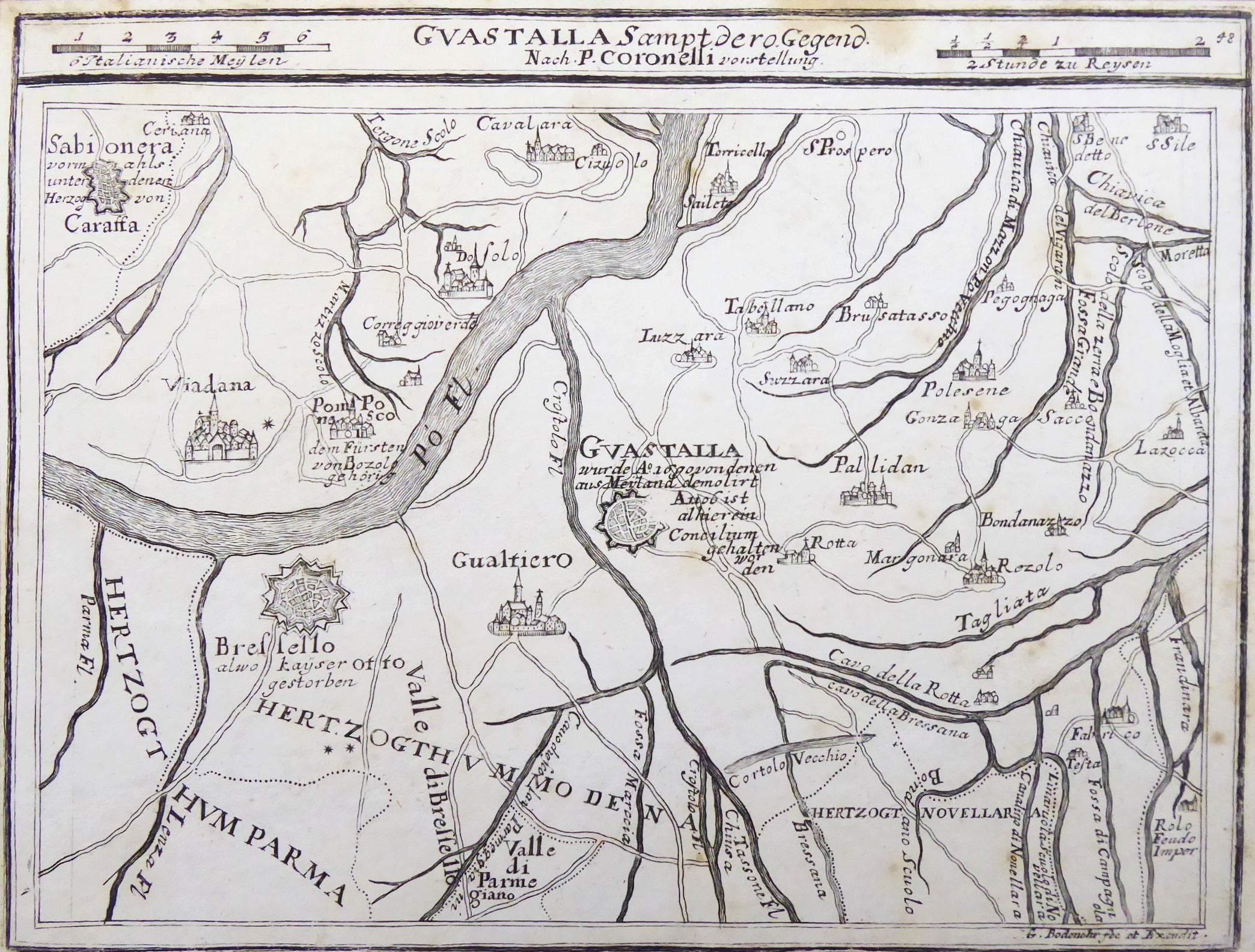 Německo, Augsburg 1704-1720. Mědirytina na papíru 17,5 cm x 23,3 cm. Značeno vpravo dole: G. Bodenehr, fec et Excudit. Nahoře nápis: GUASTALLA s doplňujícími údaji. Ze slavné knihy Gabriel Bodenehr – Europeans Macht und Pracht, ze série rytin zobrazujících pohledy na evropská města, jejich plány, pevnosti a hrady. Autor: Gabriel Bodenehr starší (1664-1758) byl německý kartograf a člen slavné rytecké a vydavatelské rodiny z Augsburgu. Jeho hlavním dílem byl \“Atlas Curieux oder neuer und compendieuser Atlas\“ vydaný poprvé roku 1704. Celkový rozměr s paspartou 30 cm x 33 cm. Nerámováno. Z umělecké sbírky Ladislava Šalouna.