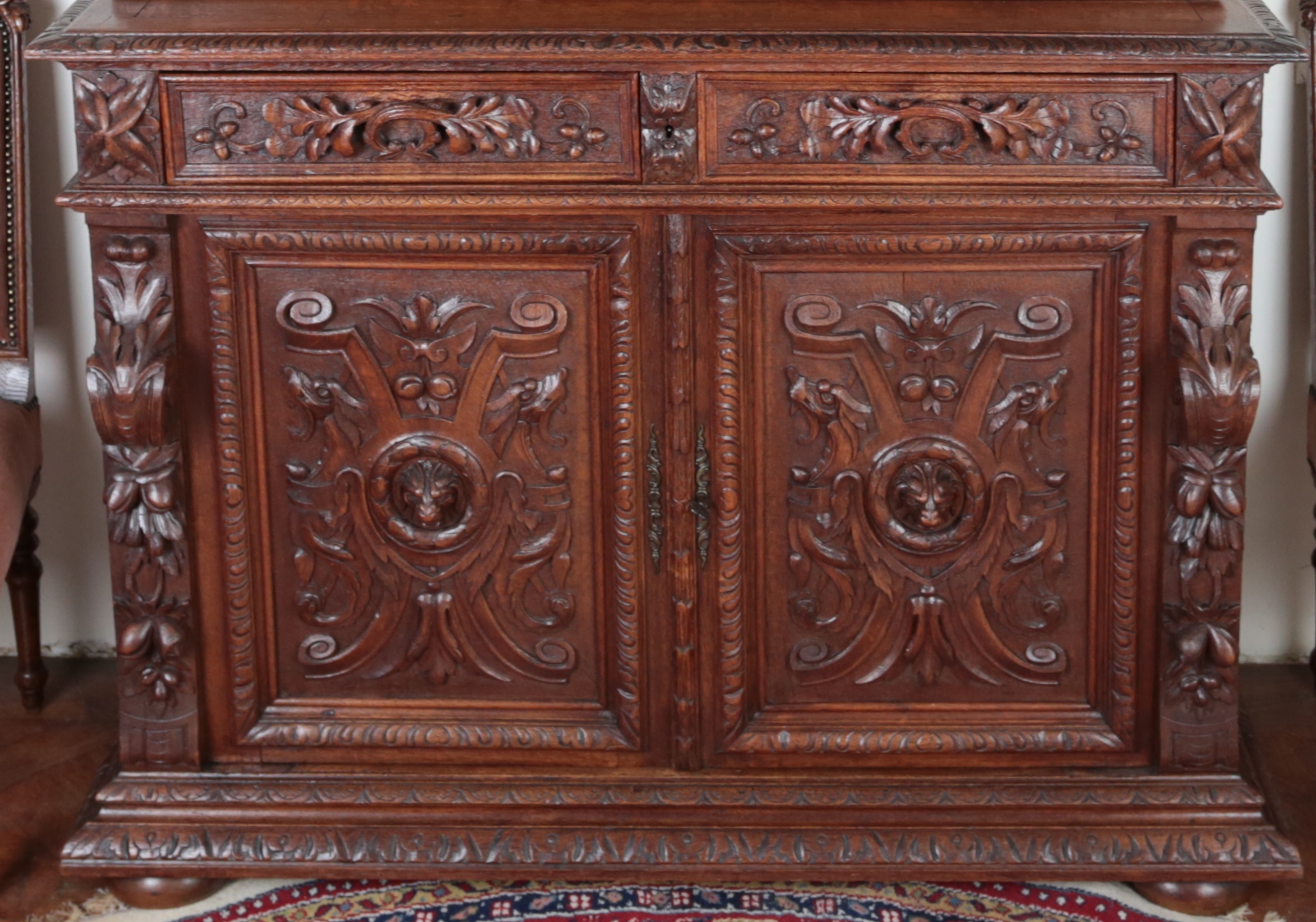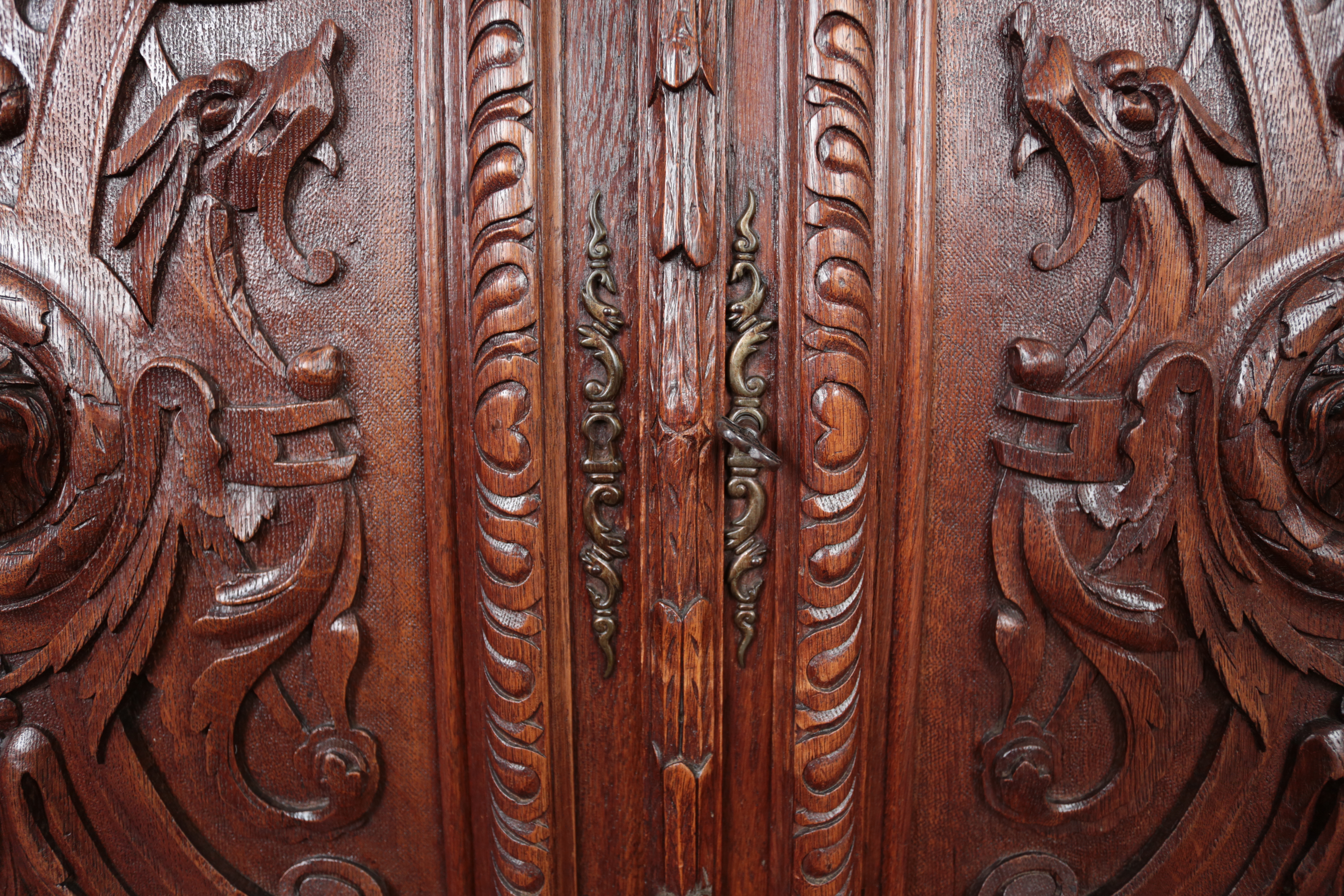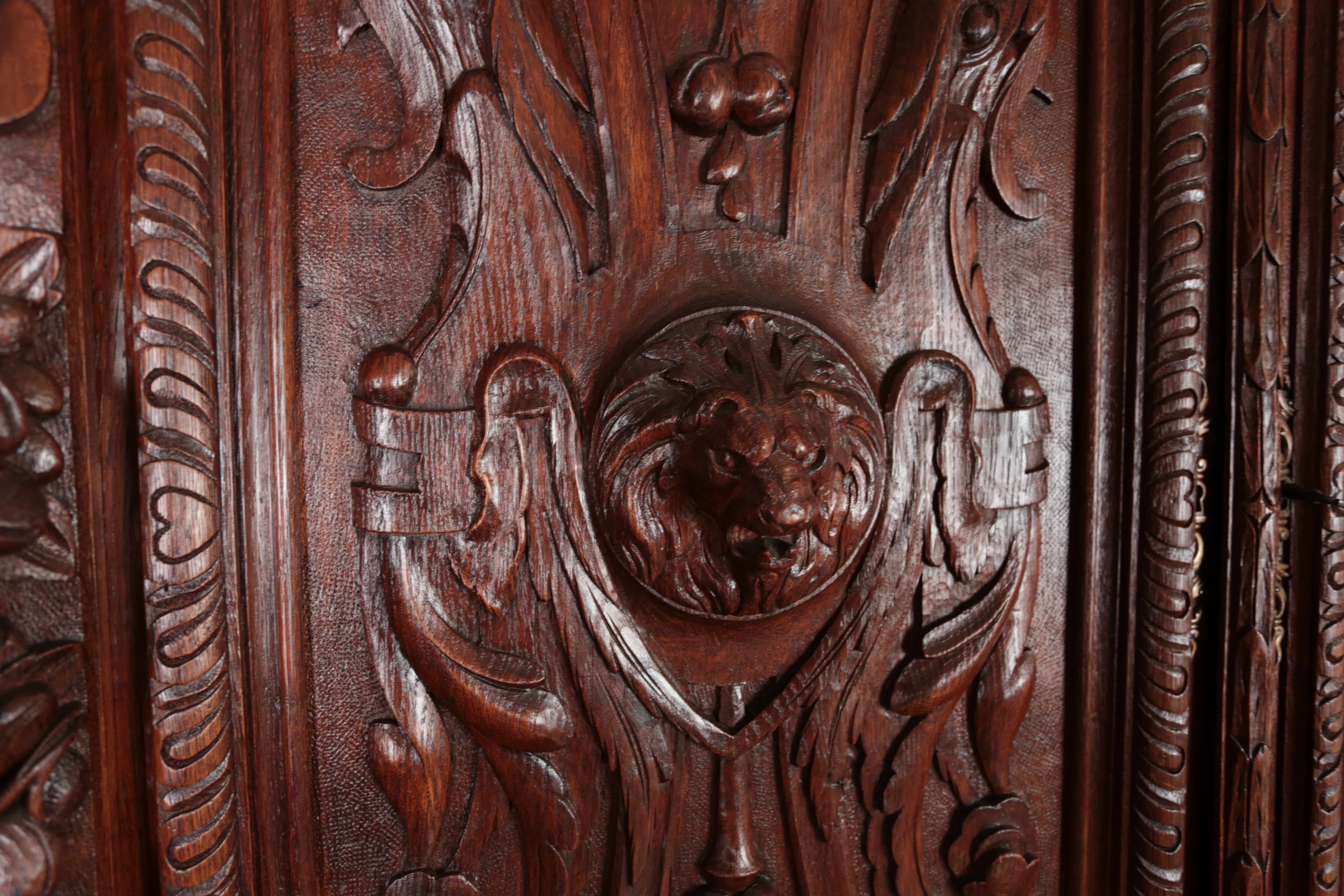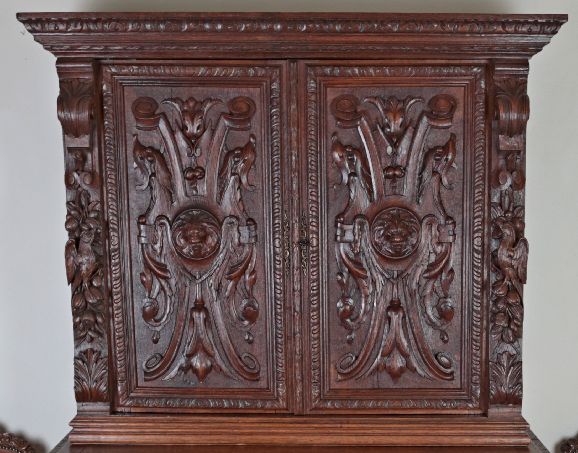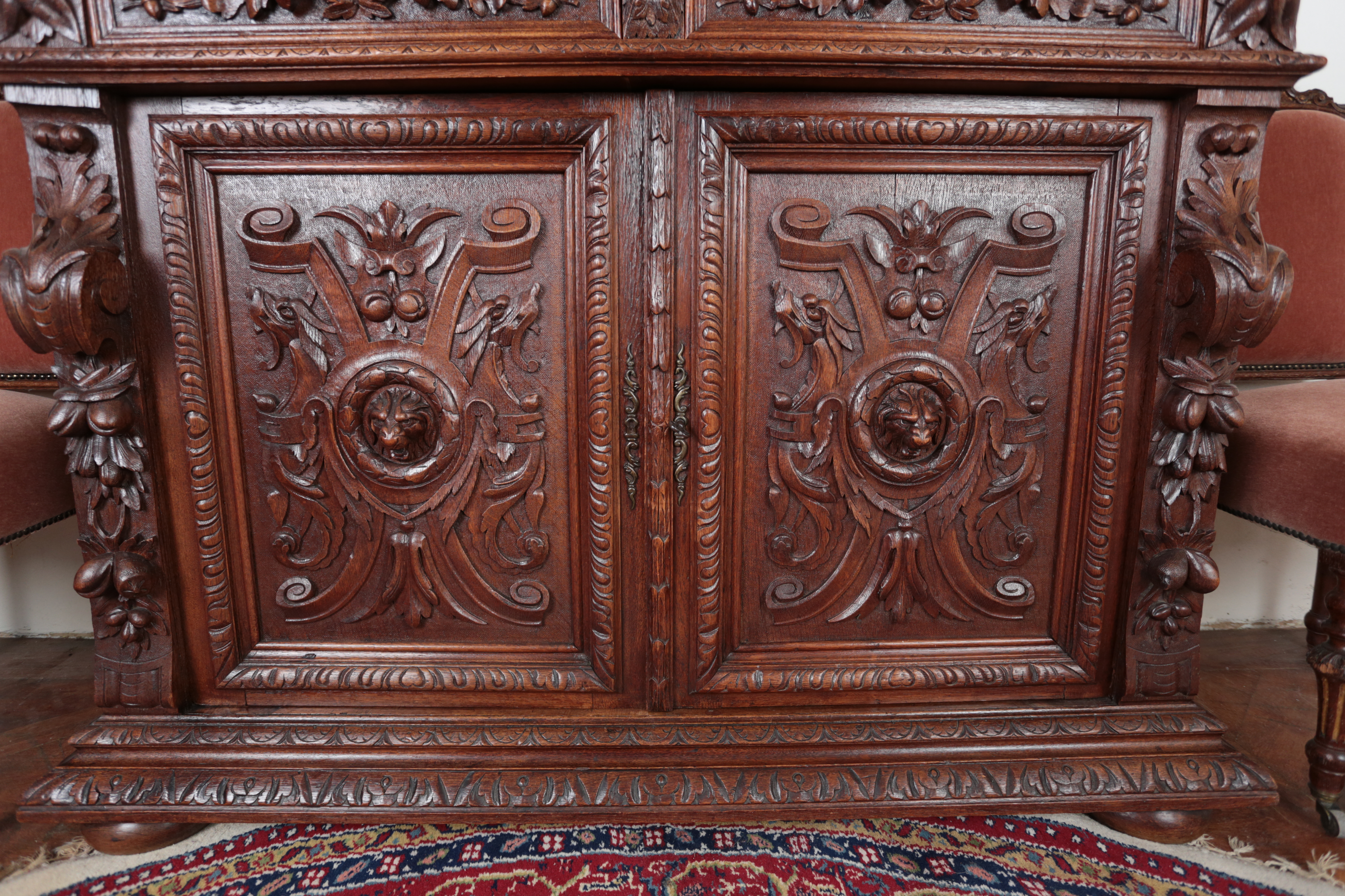 Precizní řezbářská práce z 19. století v renesančním stylu. Dvoudílné provedení, kdy vrchní dvoudvéřová část je s vnitřními policemi a spodní část se dvěma šuplíky na horní straně a dvěma plnými dvířky a policí uvnitř. Původní zámky jsou funkční. Neorenesančního nábytku z masivního dubu se v západní Evropě ve druhé polovině 19. století vyrábělo hodně, ale jen málo kousků v této kvalitě. Pro převoz a stěhování je možné skříň rozdělit na vrchní a spodní díl. Stav: velmi dobrý, bez červotoče. Datace: kolem roku 1880. Provenience: Francie.