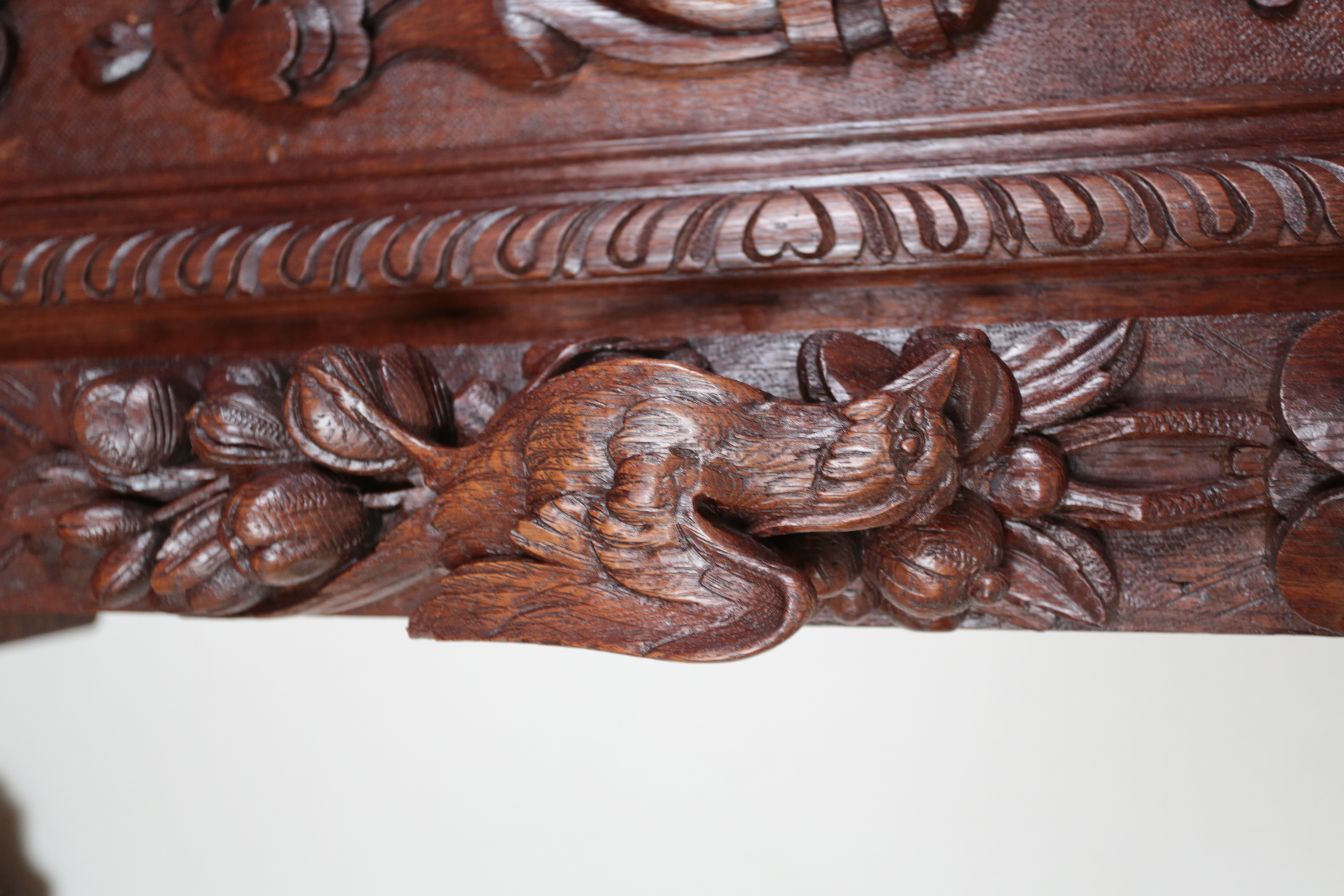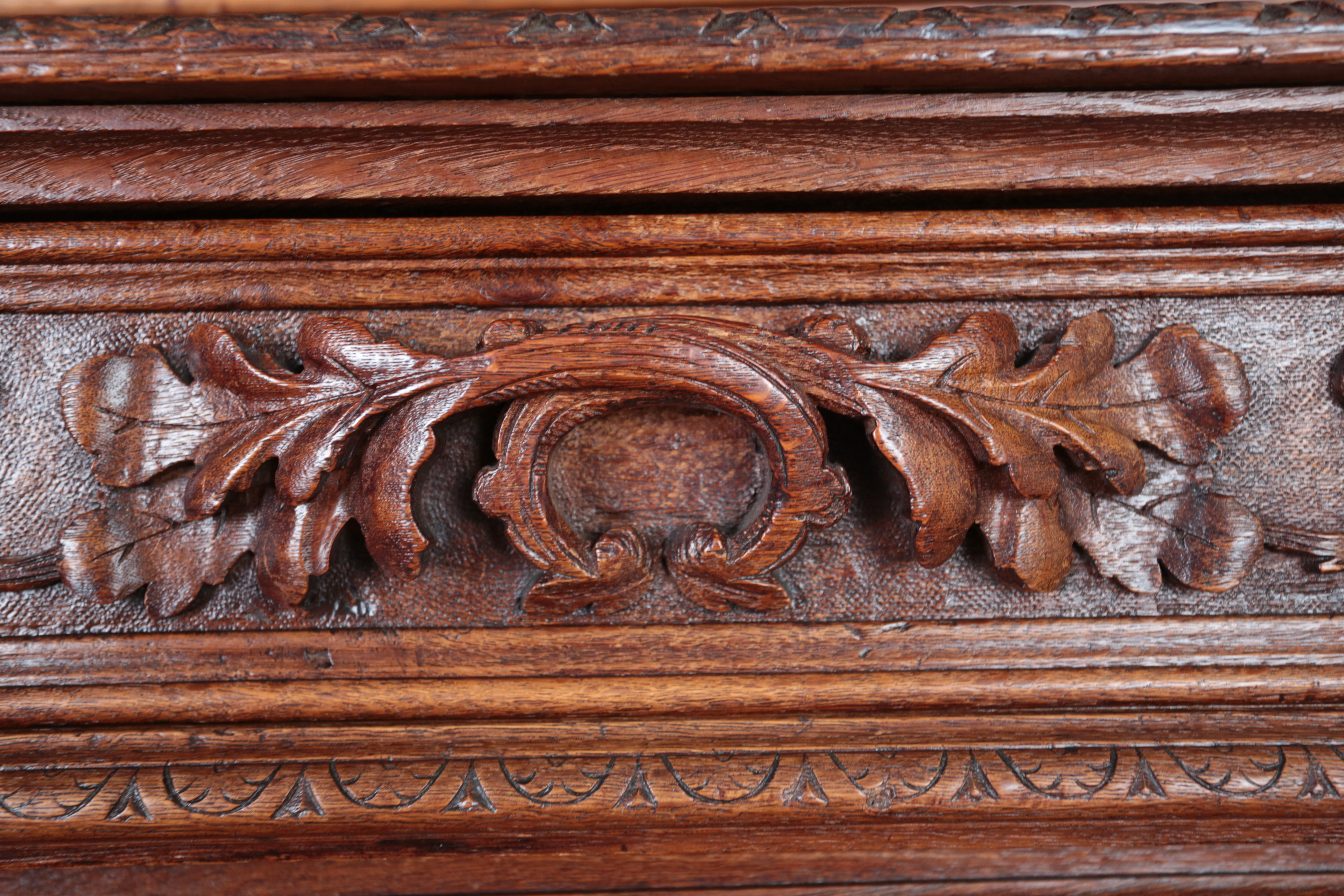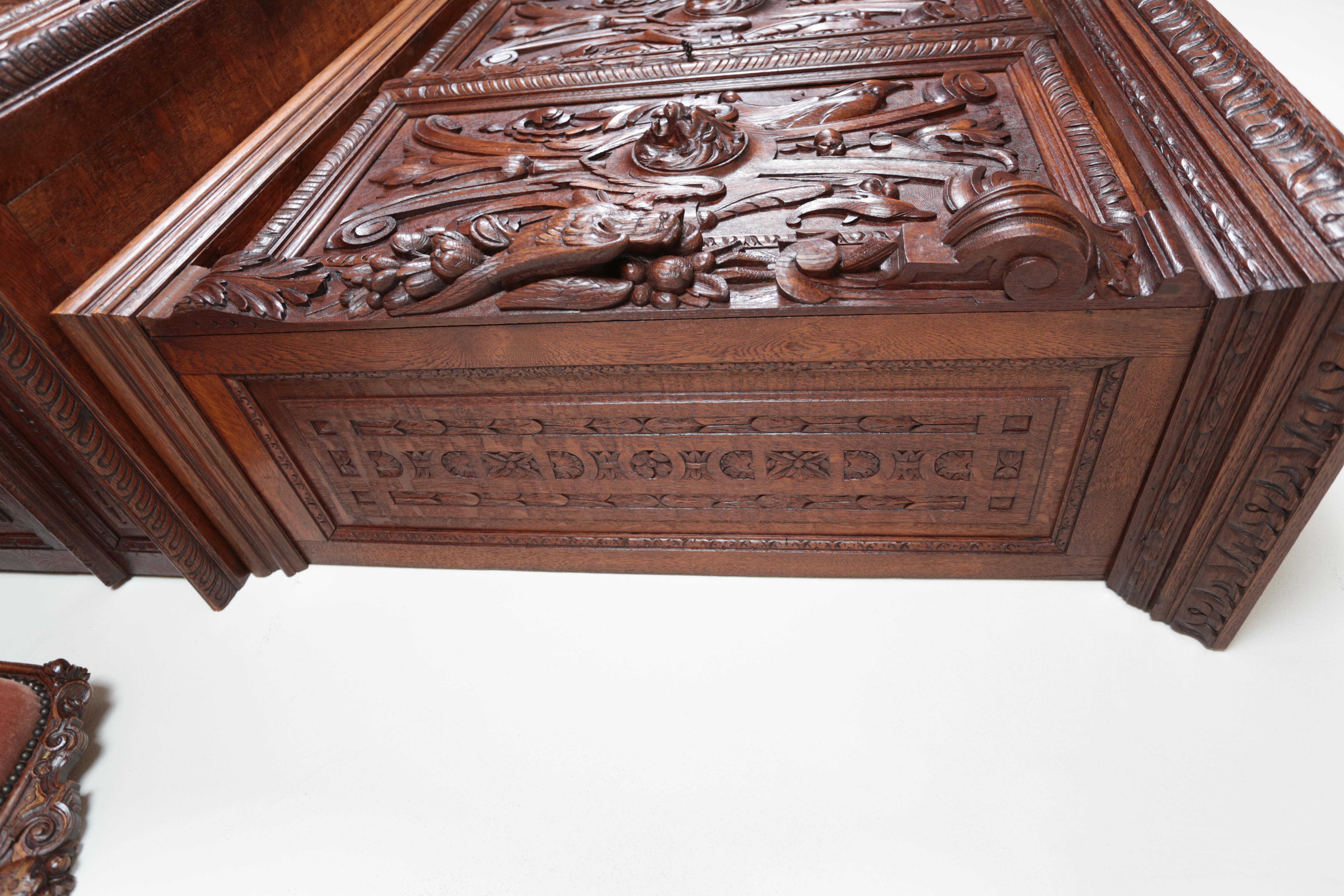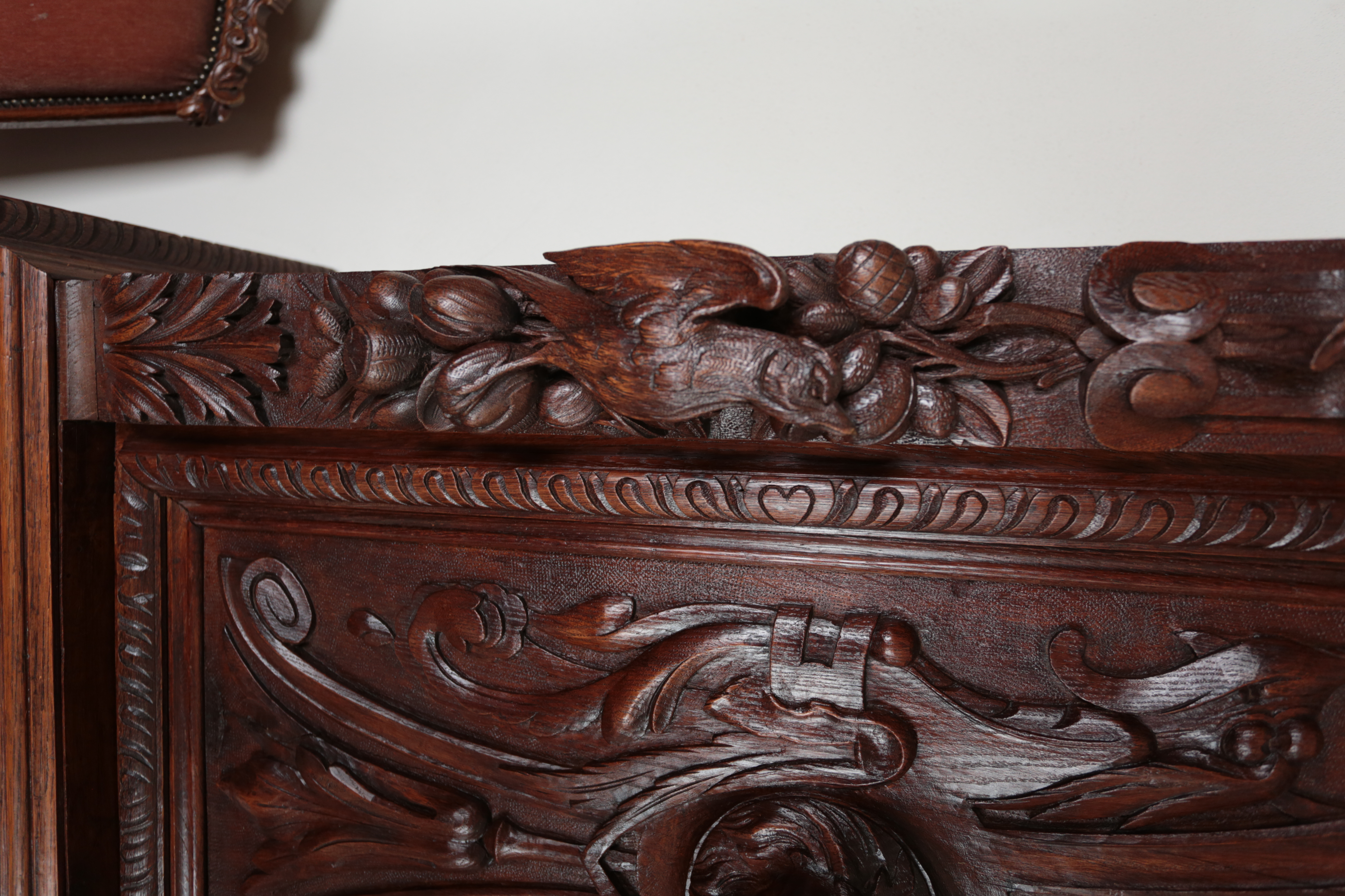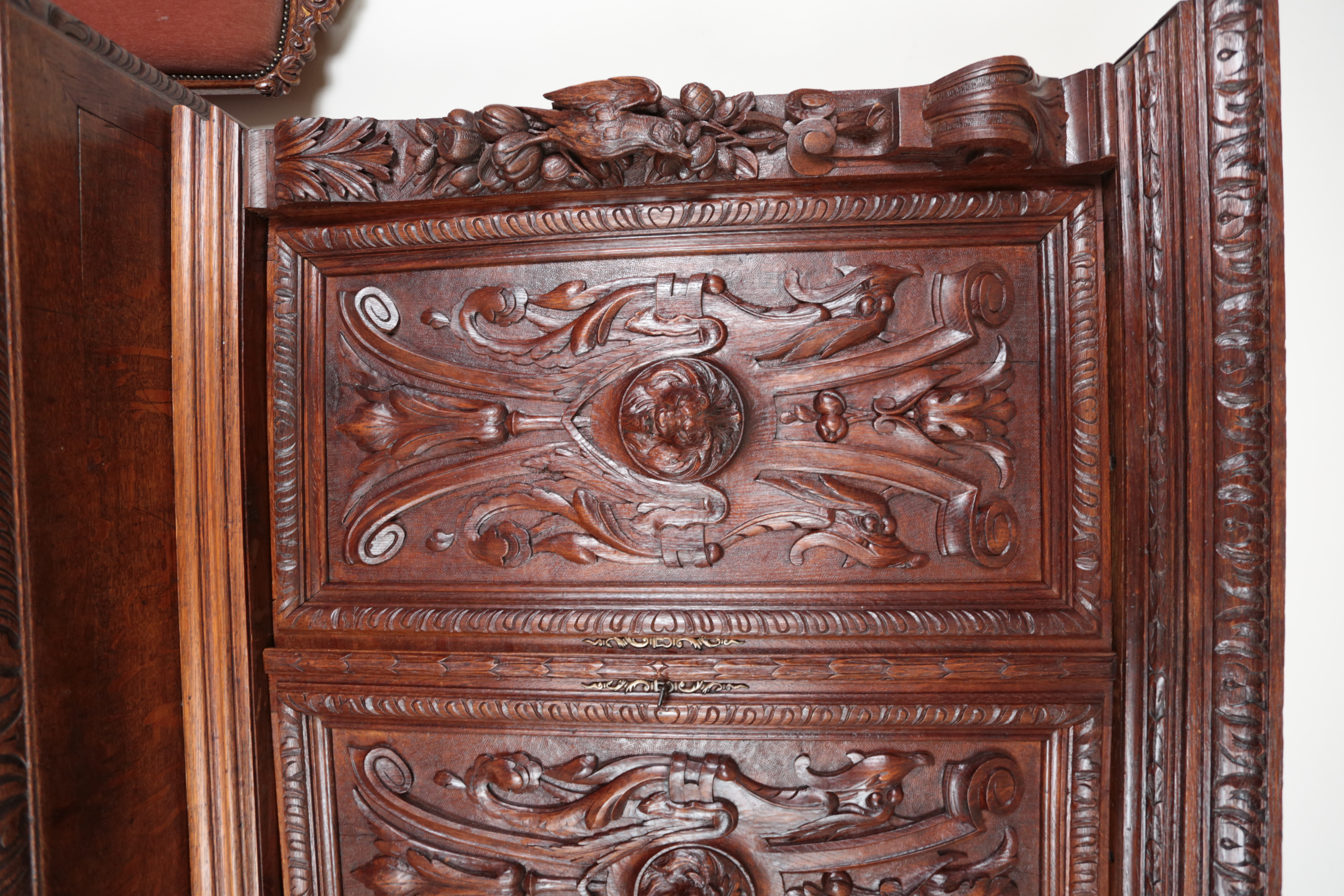 Precizní řezbářská práce z 19. století v renesančním stylu. Dvoudílné provedení, kdy vrchní dvoudvéřová část je s vnitřními policemi a spodní část se dvěma šuplíky na horní straně a dvěma plnými dvířky a policí uvnitř. Původní zámky jsou funkční. Neorenesančního nábytku z masivního dubu se v západní Evropě ve druhé polovině 19. století vyrábělo hodně, ale jen málo kousků v této kvalitě. Pro převoz a stěhování je možné skříň rozdělit na vrchní a spodní díl. Stav: velmi dobrý, bez červotoče. Datace: kolem roku 1880. Provenience: Francie.