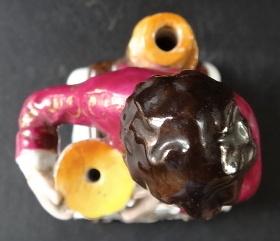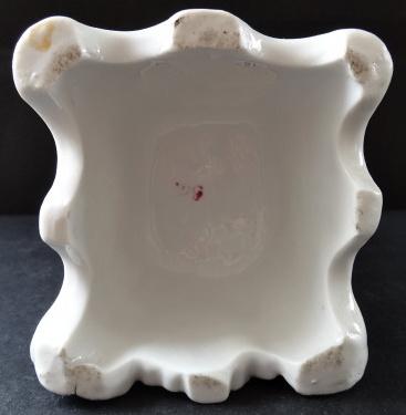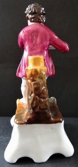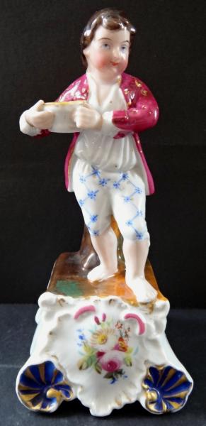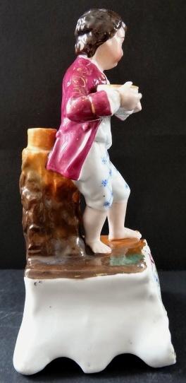 Porcelán bílý, malovaný, glazovaný, zlacený. Soška stojícího mládence držícího v rukou bílou misku s medem. V zadní části stojánek ve tvaru kmene. Vysoký bílý podstavec, rokokově tvarovaný. Na čelní straně s reliéfními modrými, zlacenými mušlemi a malovanými květinami v kartuši. Neznačeno. Čechy 1840 – 1860. Výška 17,5 cm, šířka 8 cm.