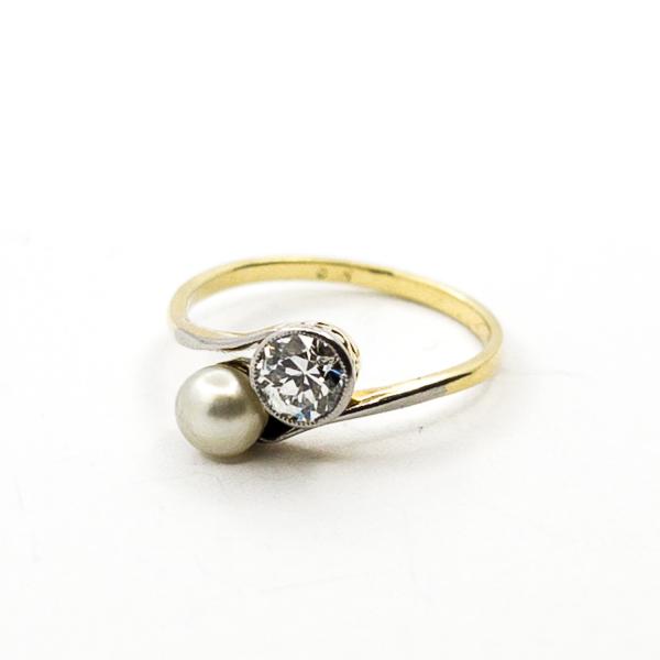 Zlatý prsten osazený přírodním diamantem starého briliantového brusu 0,54 ct a perlou,