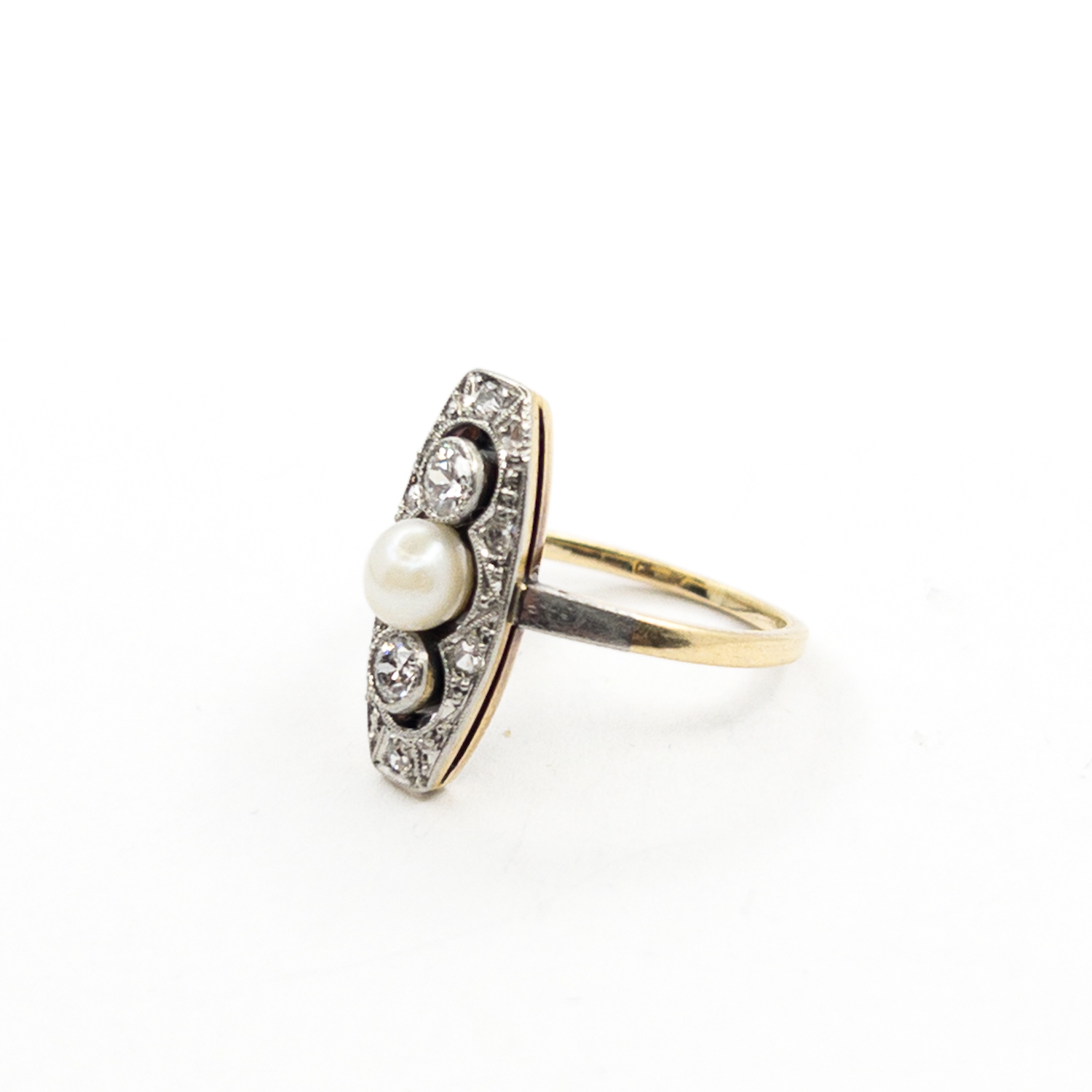 Půvabný starožitný zlatý prsten je osazený přírodními diamanty briliantového brusu o celkové hmotnosti 0,26 ct a perlou,