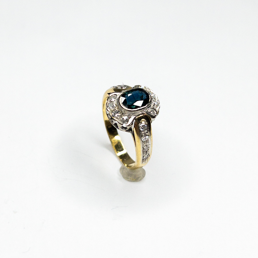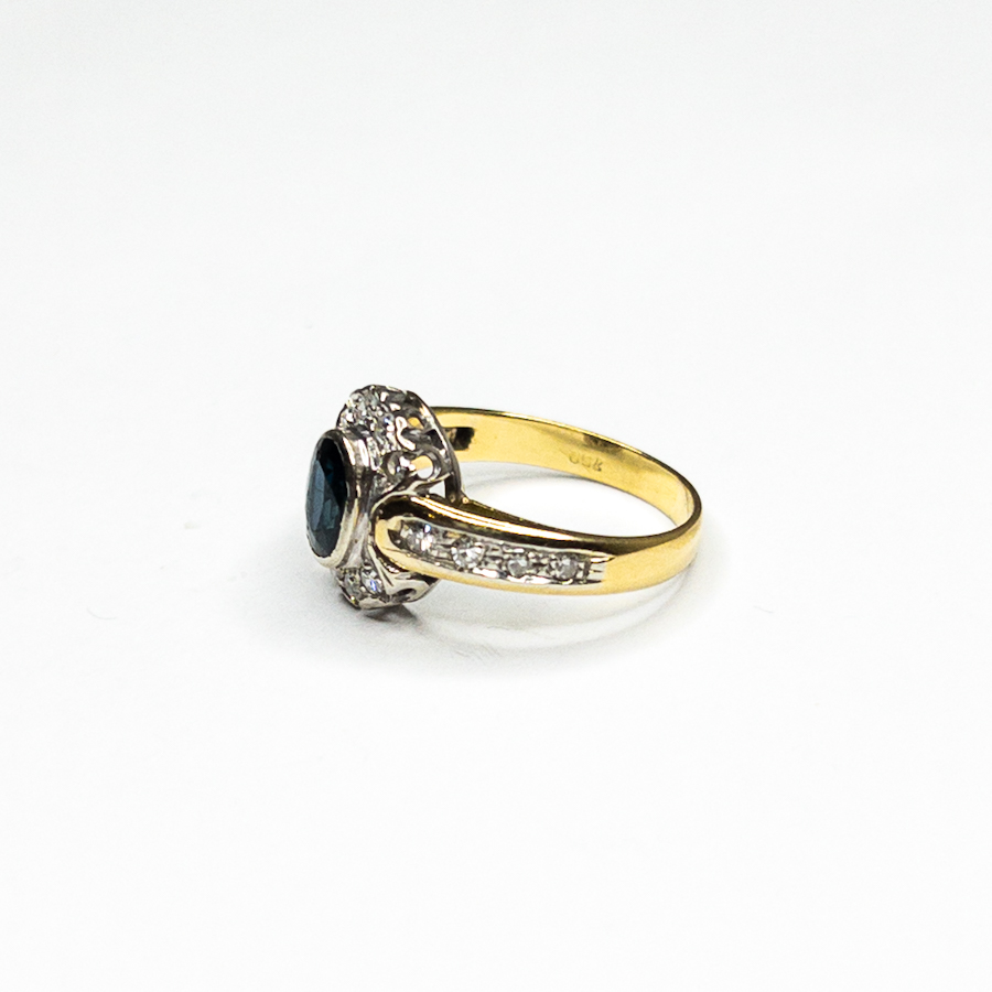 Zlatý prsten osazený safírem a přírodními brilianty oktagonového brusu 0,32 ct,