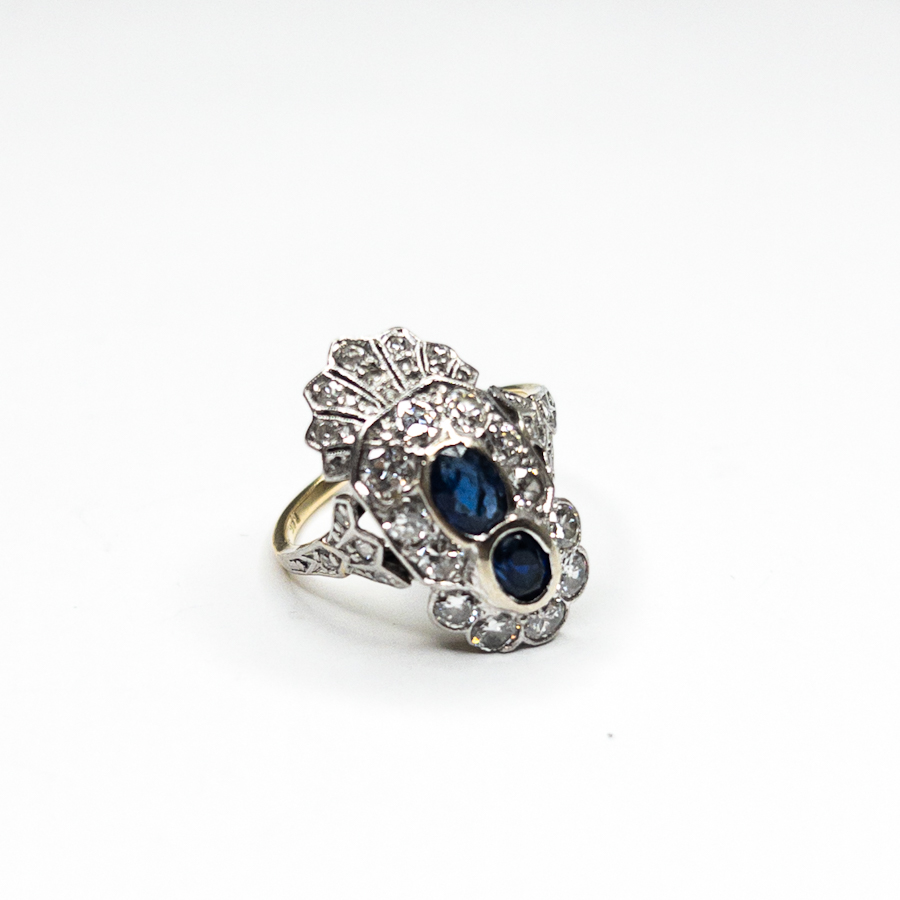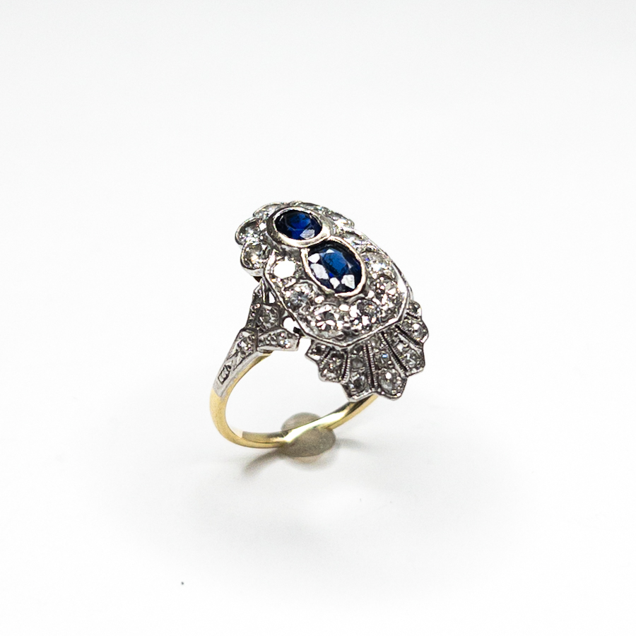 Výrazný, asymetrický prsten se safíry