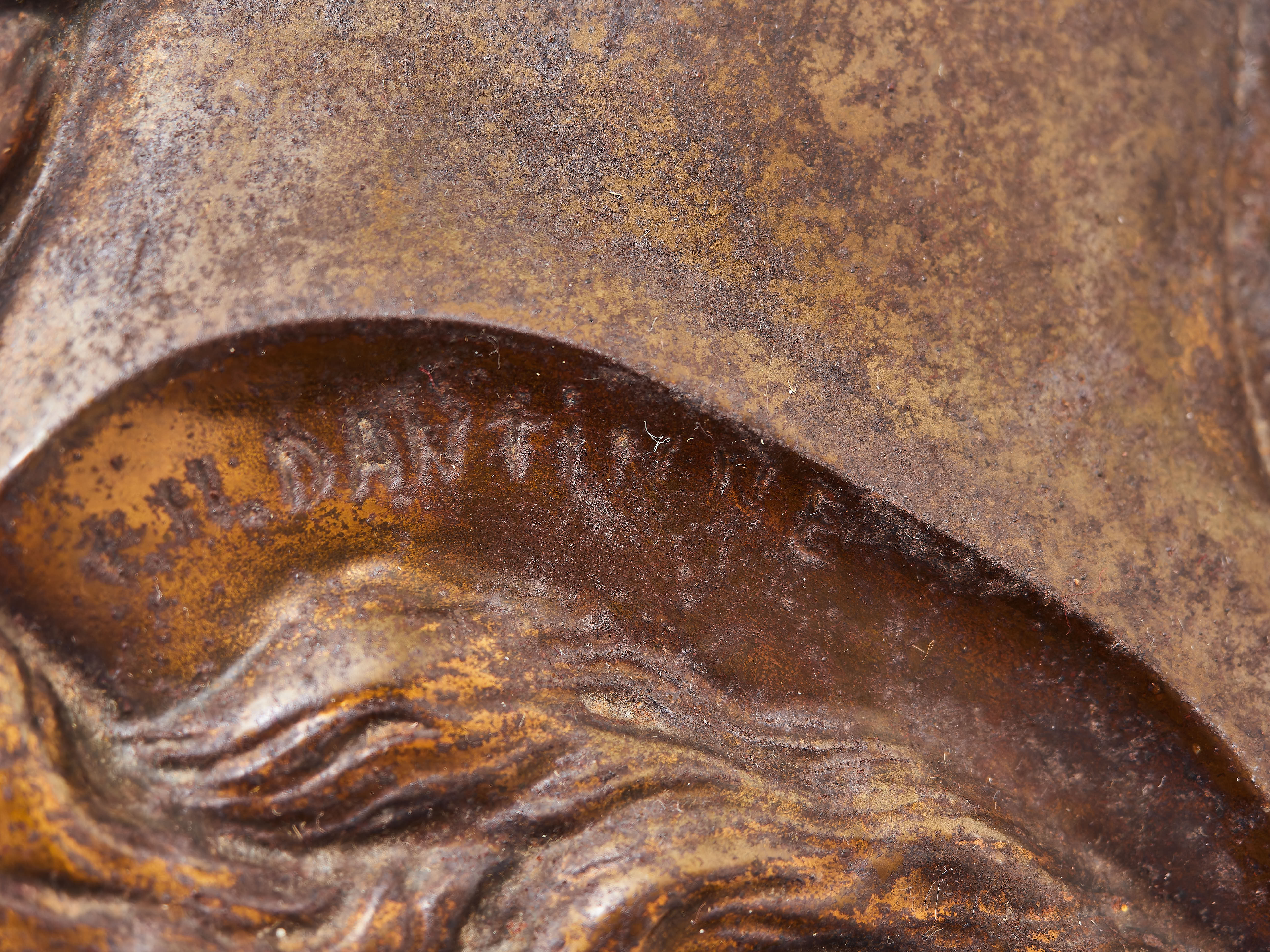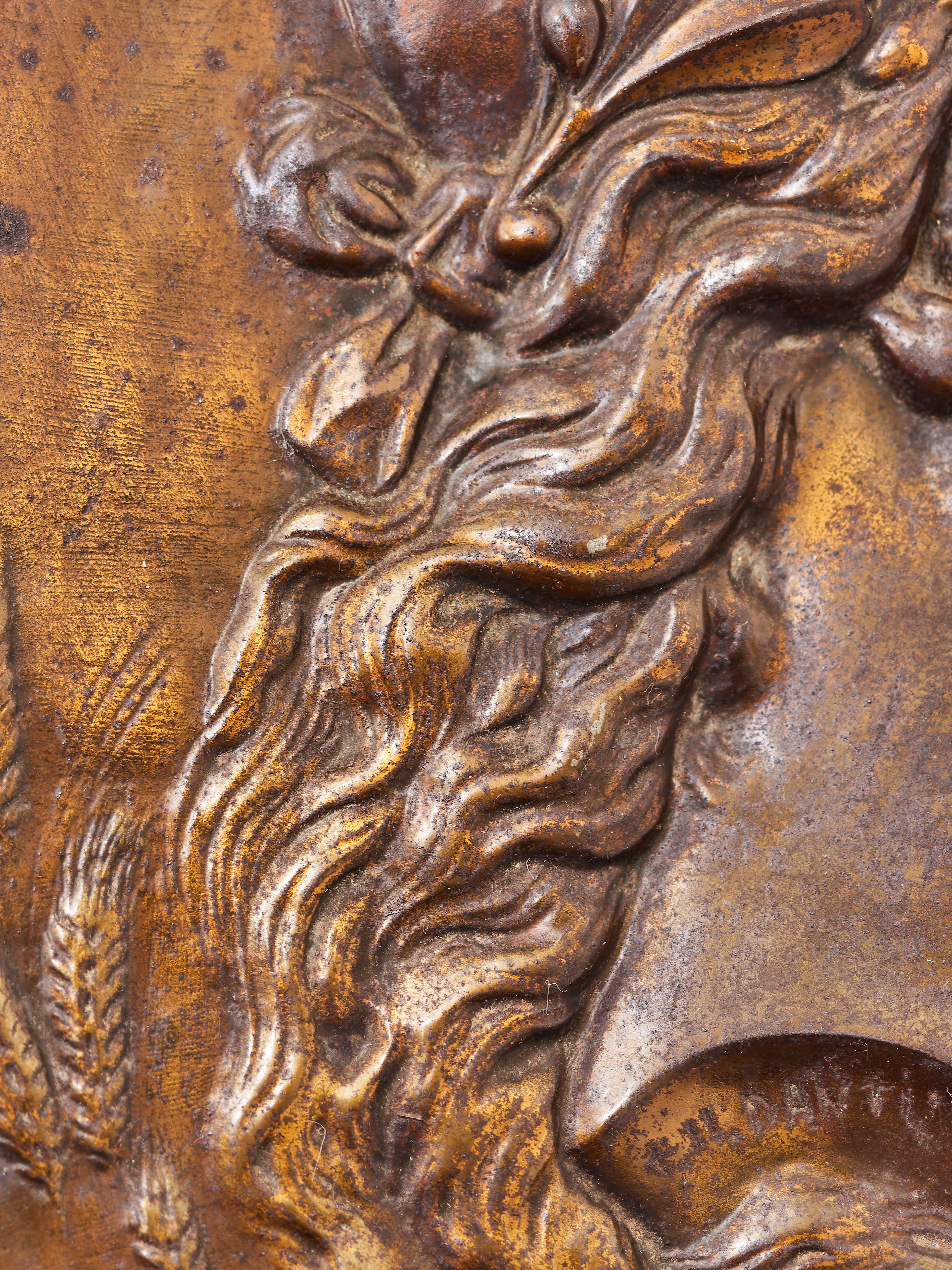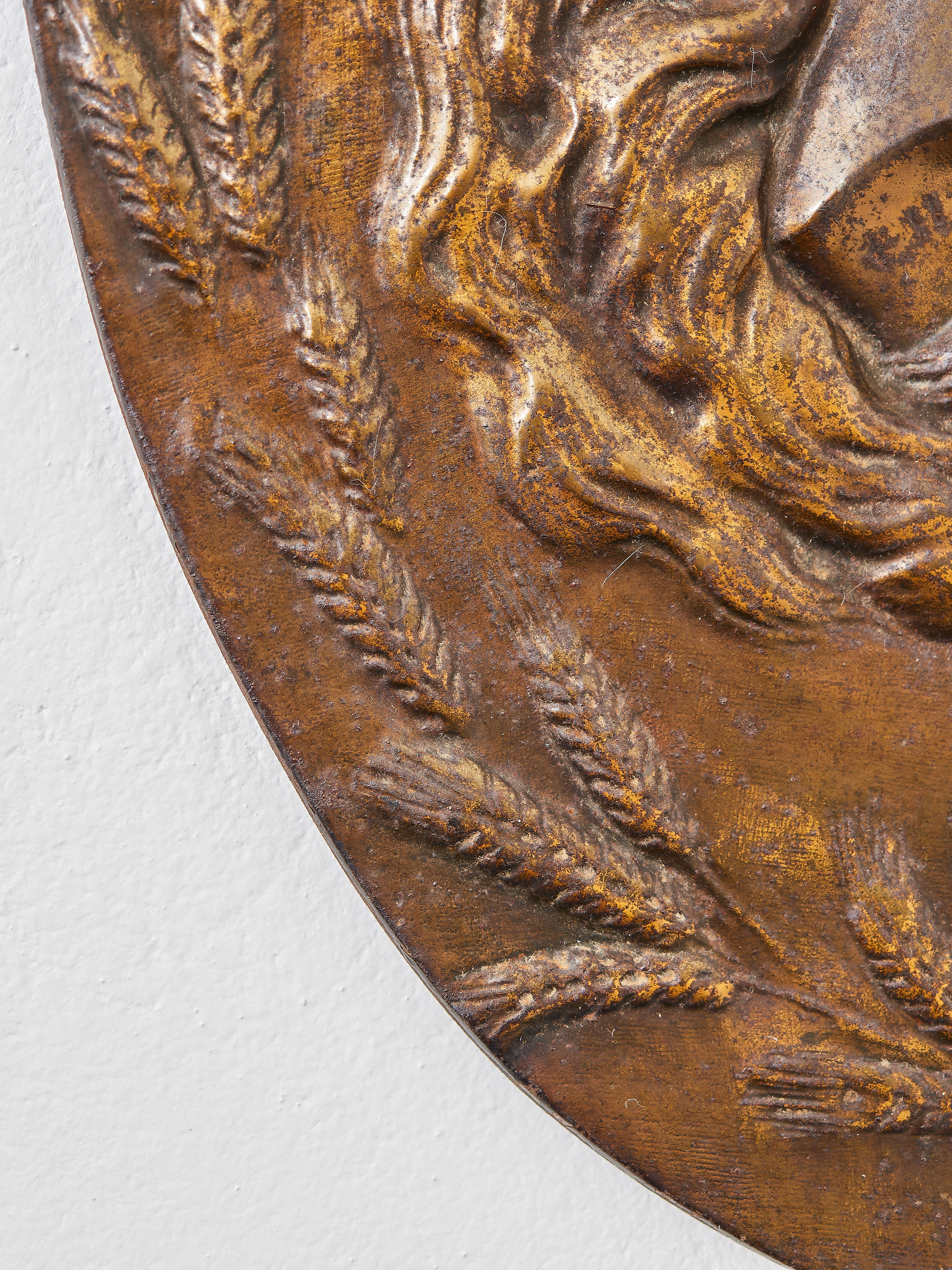 Popis: Oválná bronzová plaketa s pravotočivým profilem ženské hlavy, ozdobené vavřínovým věncem a výraznou frygickou čapkou – tradičním symbolem svobody. Detaily vlasů a rostlinných motivů (vavřín, obilné klasy) jsou plasticky propracované. Kompozice evokuje alegorii republikánských hodnot, s vysokou pravděpodobností zobrazuje postavu Marianne – symbol Francouzské republiky. V horní části je plastická mašle s otvorem pro zavěšení. Na spodním okraji vlasů je vyrytá signatura „CH. DANTINNE“. Zadní strana nese otisk odlévací formy.
