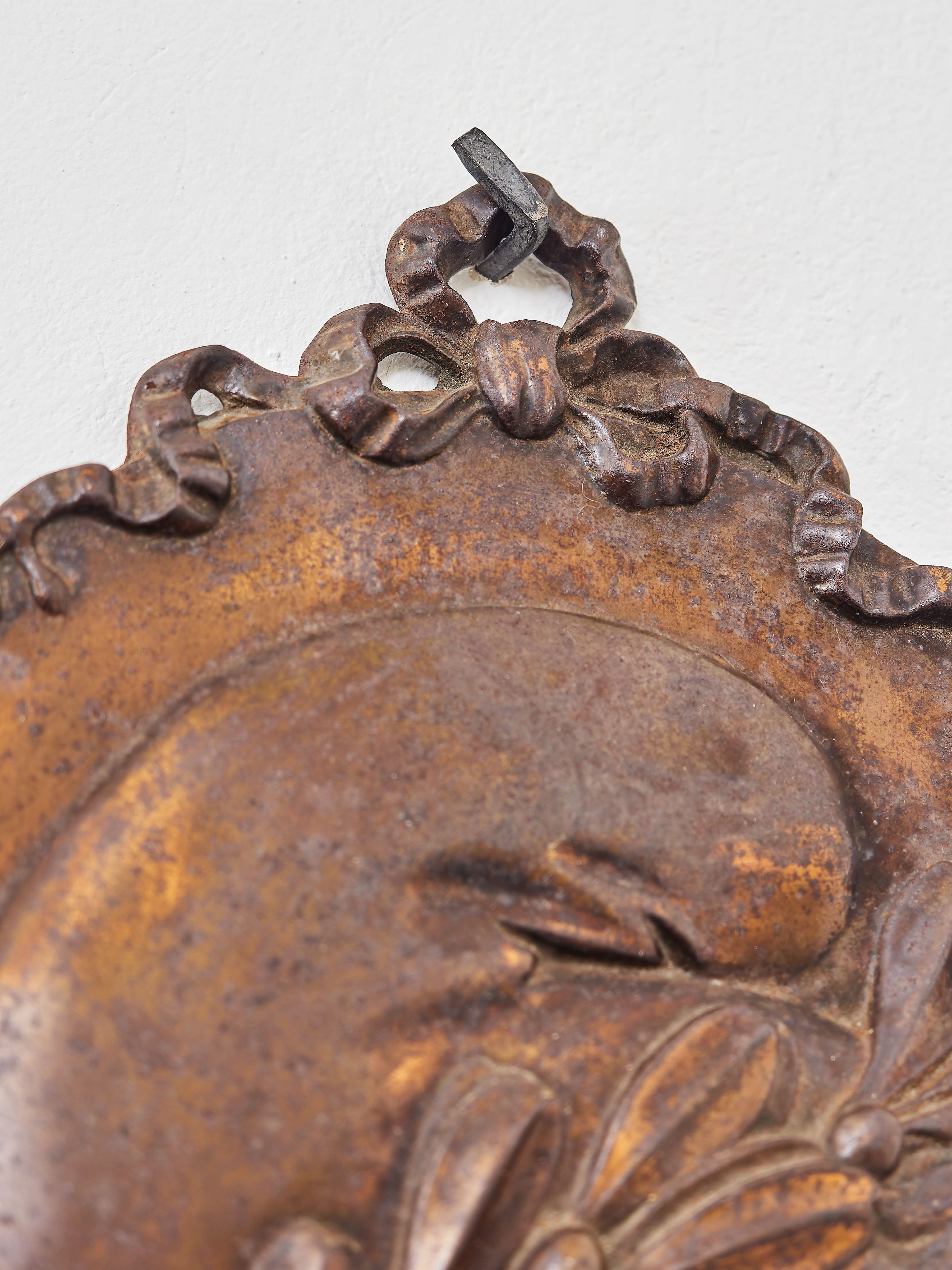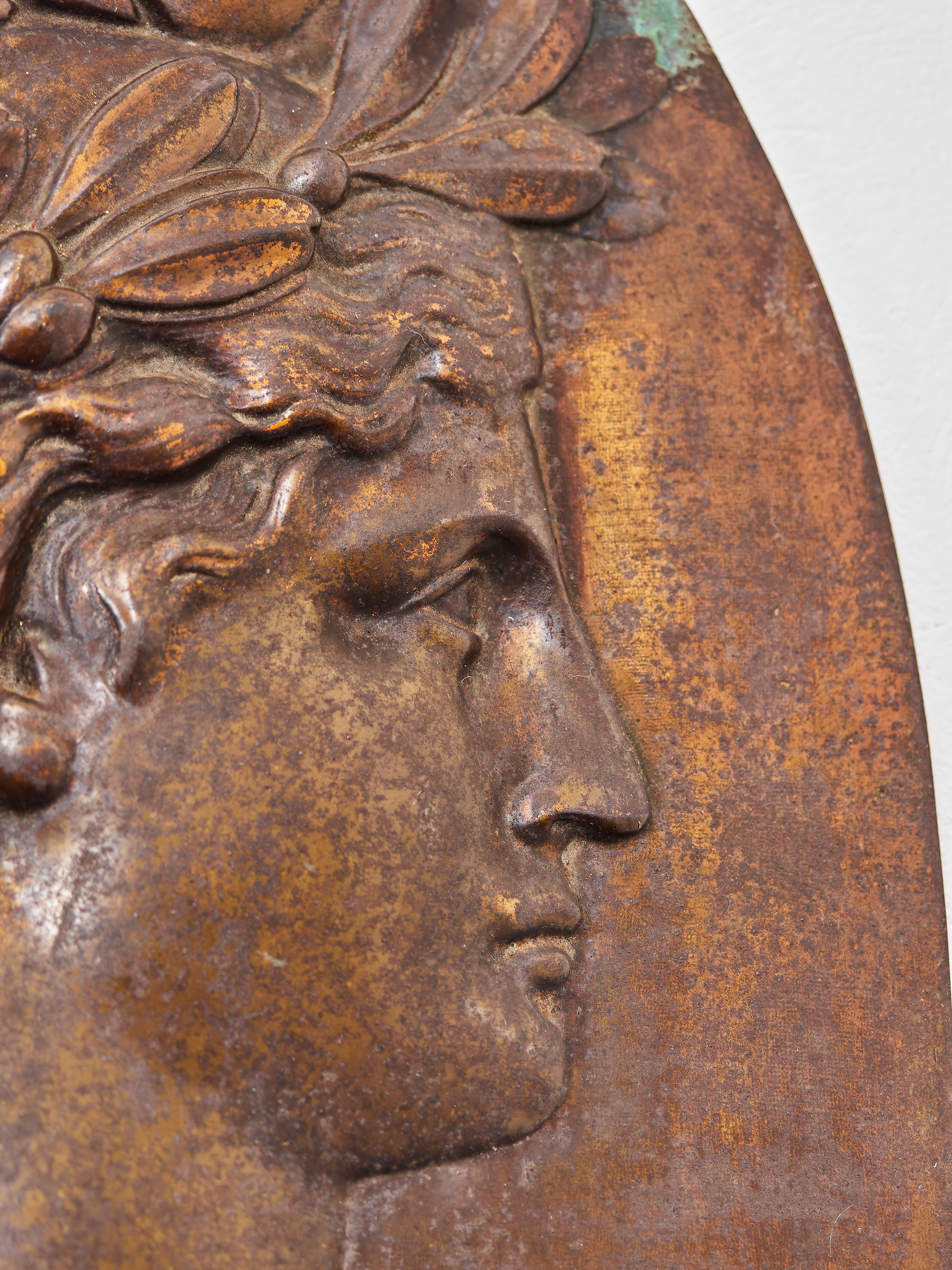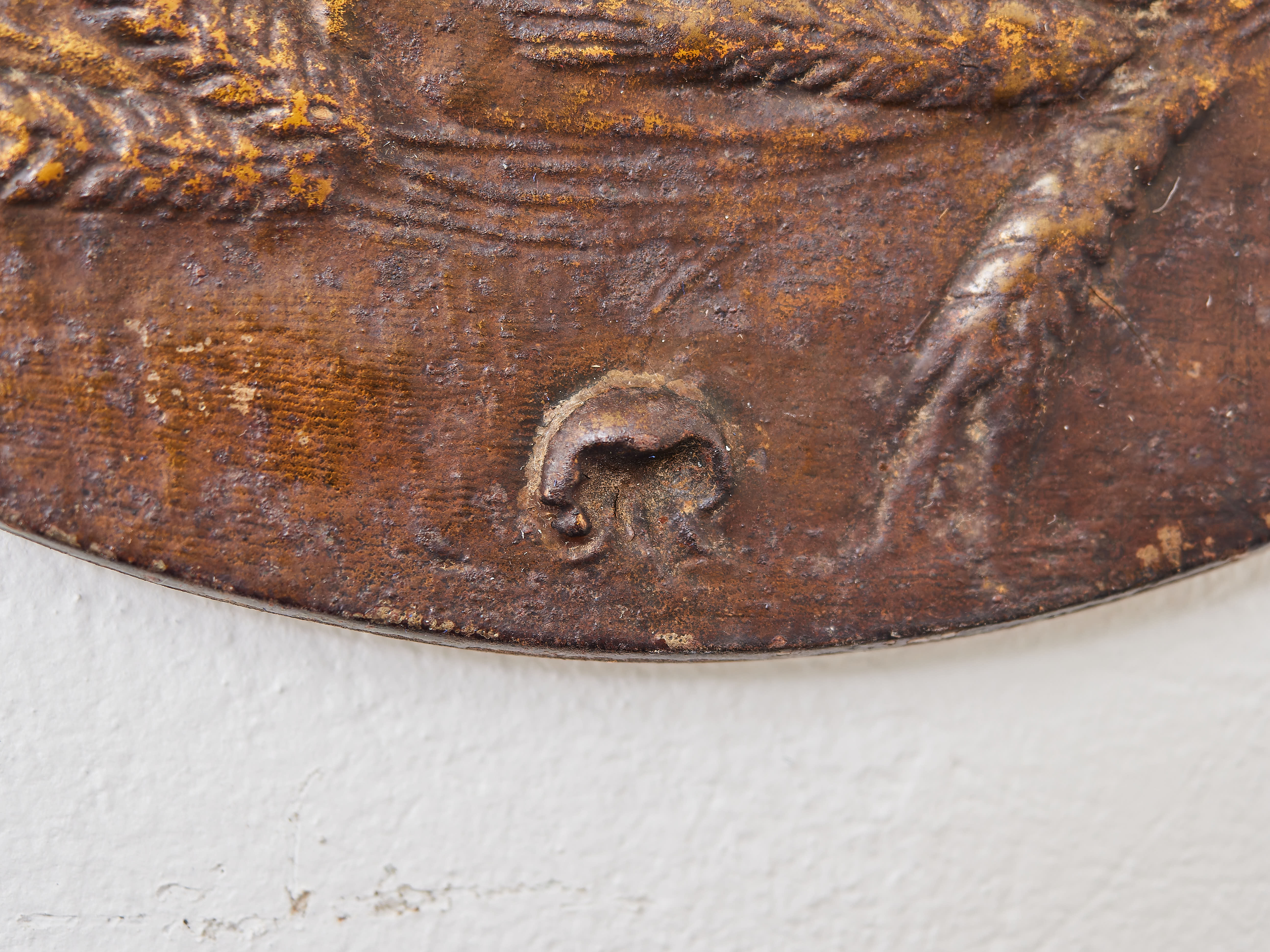 Popis: Oválná bronzová plaketa s pravotočivým profilem ženské hlavy, ozdobené vavřínovým věncem a výraznou frygickou čapkou – tradičním symbolem svobody. Detaily vlasů a rostlinných motivů (vavřín, obilné klasy) jsou plasticky propracované. Kompozice evokuje alegorii republikánských hodnot, s vysokou pravděpodobností zobrazuje postavu Marianne – symbol Francouzské republiky. V horní části je plastická mašle s otvorem pro zavěšení. Na spodním okraji vlasů je vyrytá signatura „CH. DANTINNE“. Zadní strana nese otisk odlévací formy.