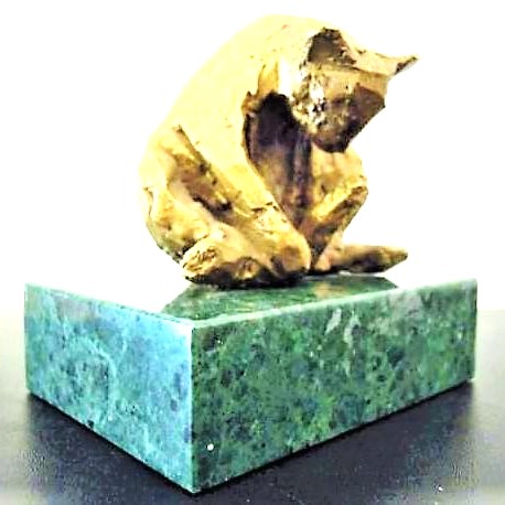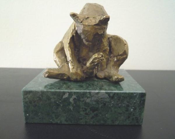 Autorská bronzová plastika Medvěd. Plastika je na mramorovém podstavci. Práce Jany Paroubkové, narozené v Praze 1940, kde i studovala na Akademii výtvarných umění u profesova Laudy, Pokorného a Hladíka, Následně žila v Holandsku. Výška plastiky cca 12 cm. Kolem roku 1975. Úmrtí autorky 1987.