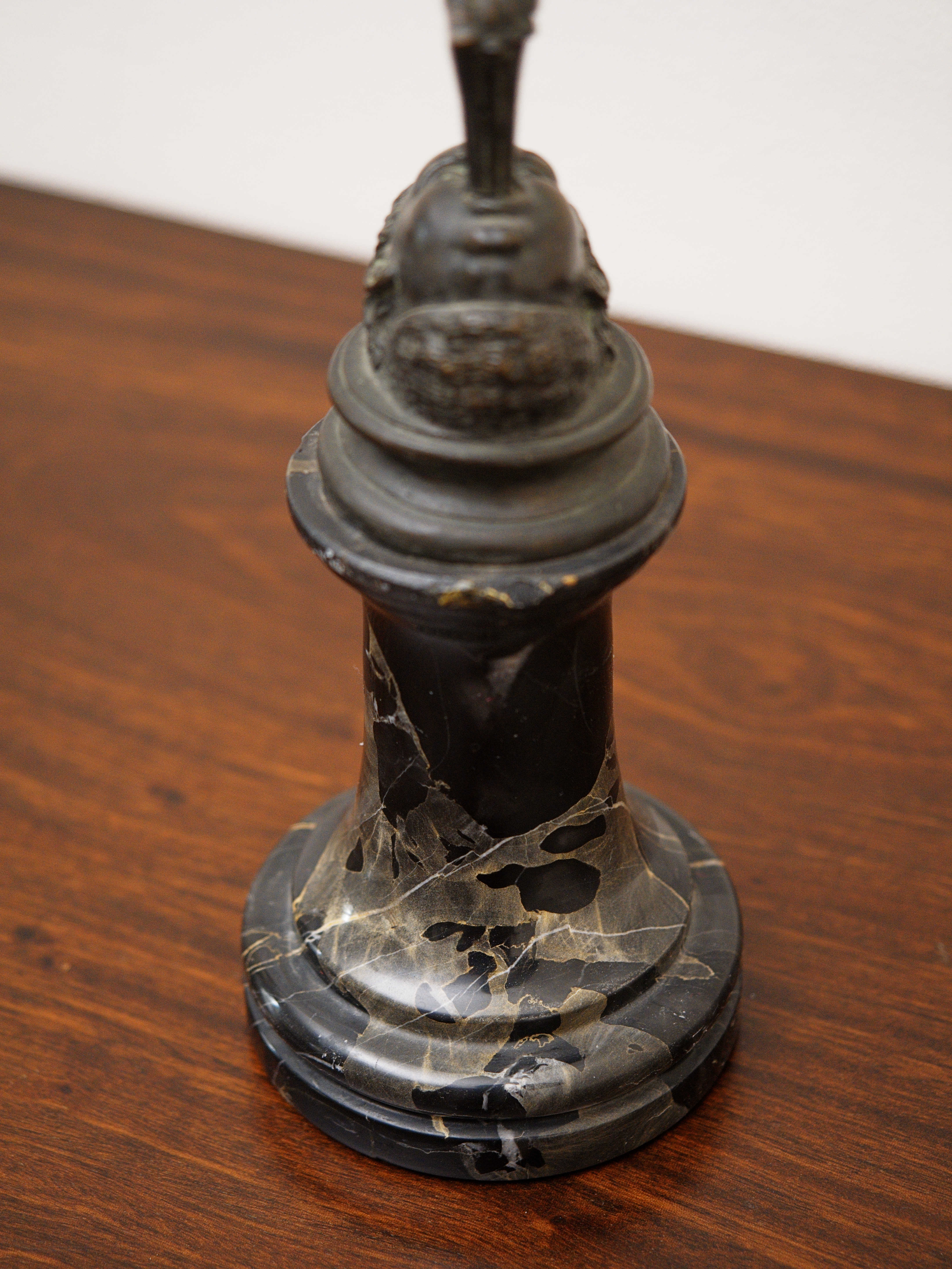 Socha stojí na kvalitním podstavci z luxusního italského mramoru Portoro Nero, ceněného pro svou hlubokou černou barvu a výraznou zlatavou kresbu. Spojení tmavě patinovaného bronzu a dekorativního mramoru dodává celku velmi reprezentativní a sběratelsky atraktivní charakter.