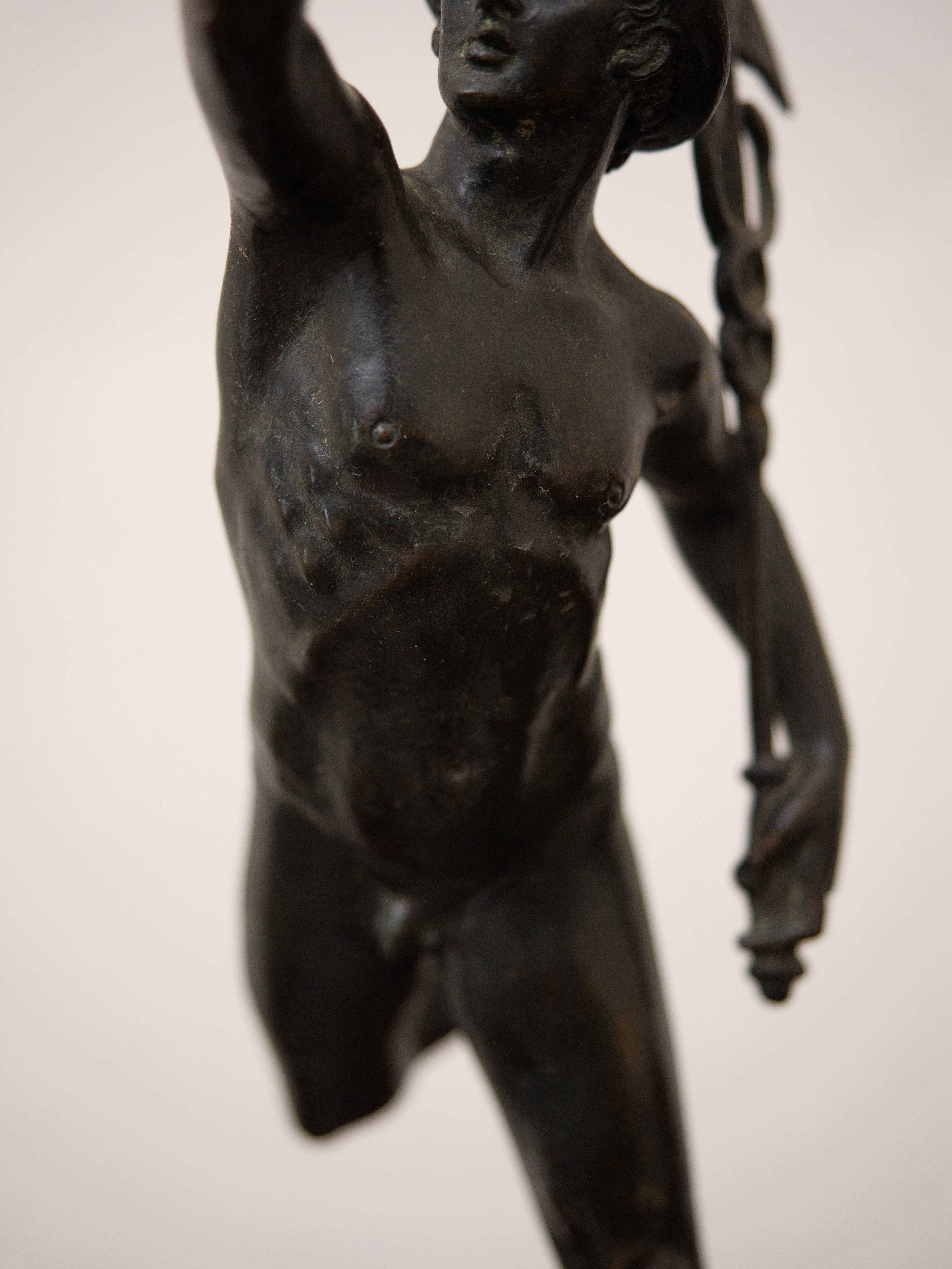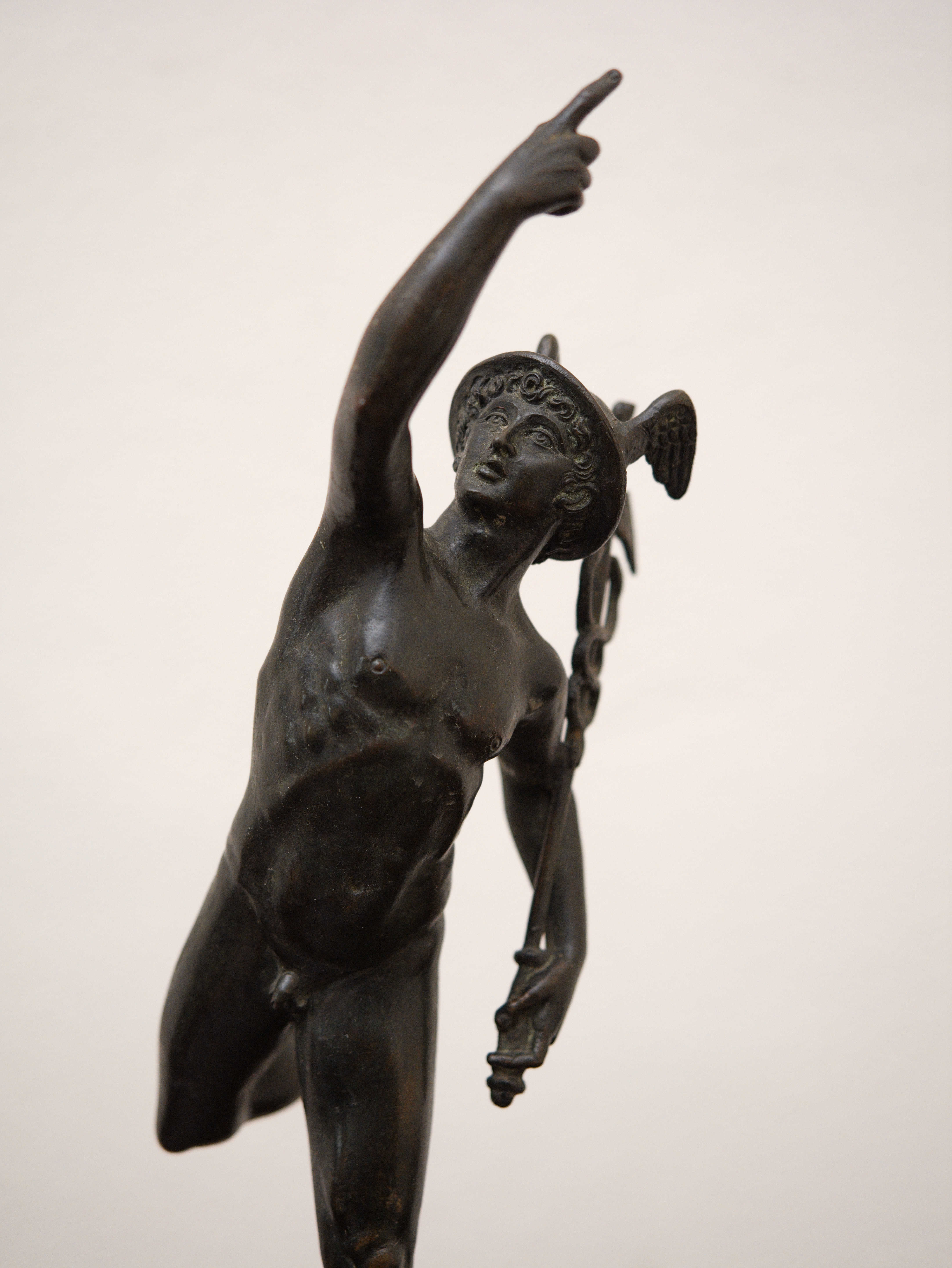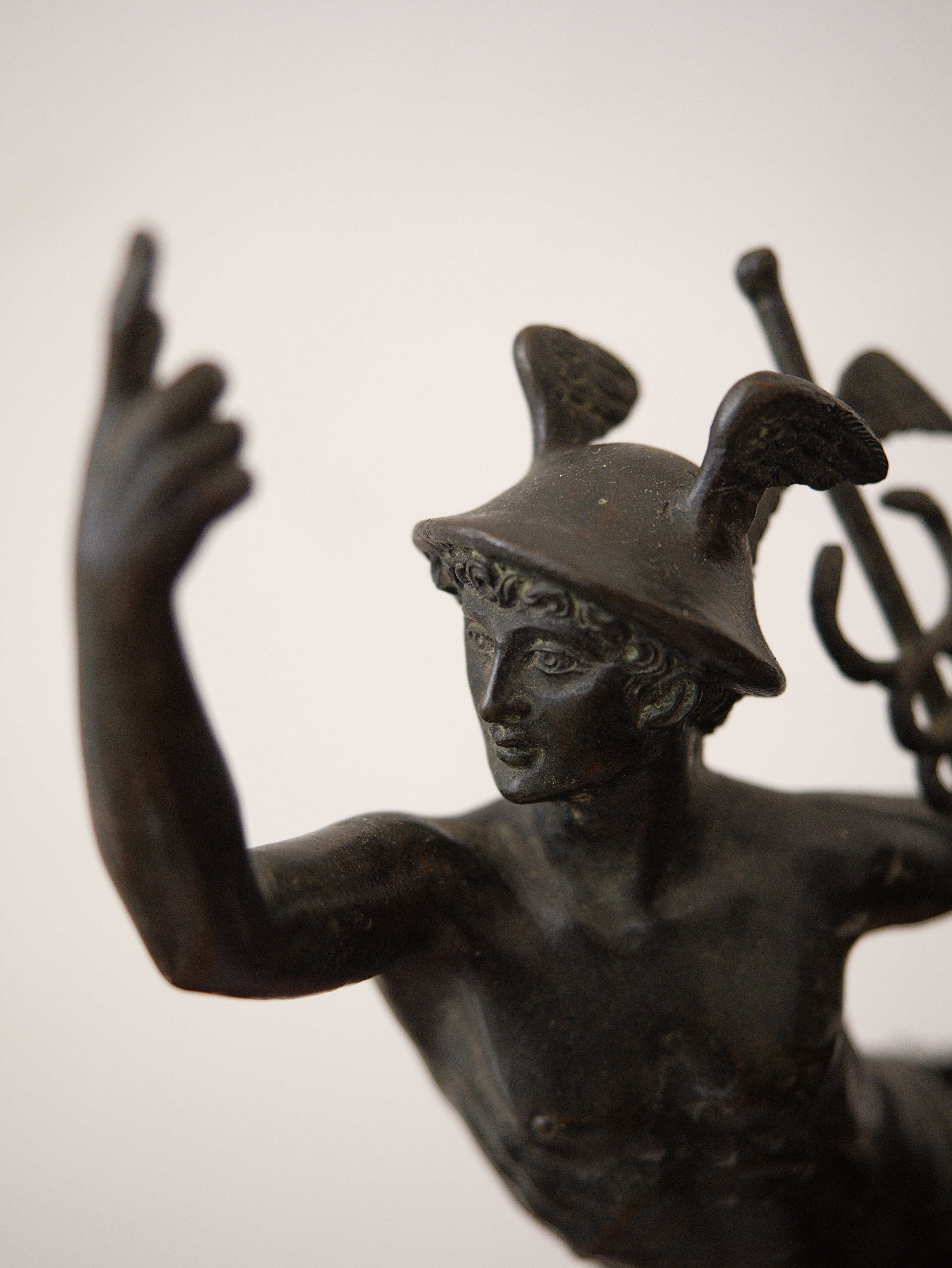 Elegantní bronzová socha Merkura z 19. století, vytvořená po vzoru slavného modelu Giambologna, představuje boha v dynamickém pohybu s typickými atributy antické mytologie. Postava je zpracována s důrazem na anatomii, lehkost a výraznou siluetu, která patří k nejoblíbenějším sochařským motivům inspirovaným renesančním uměním.
