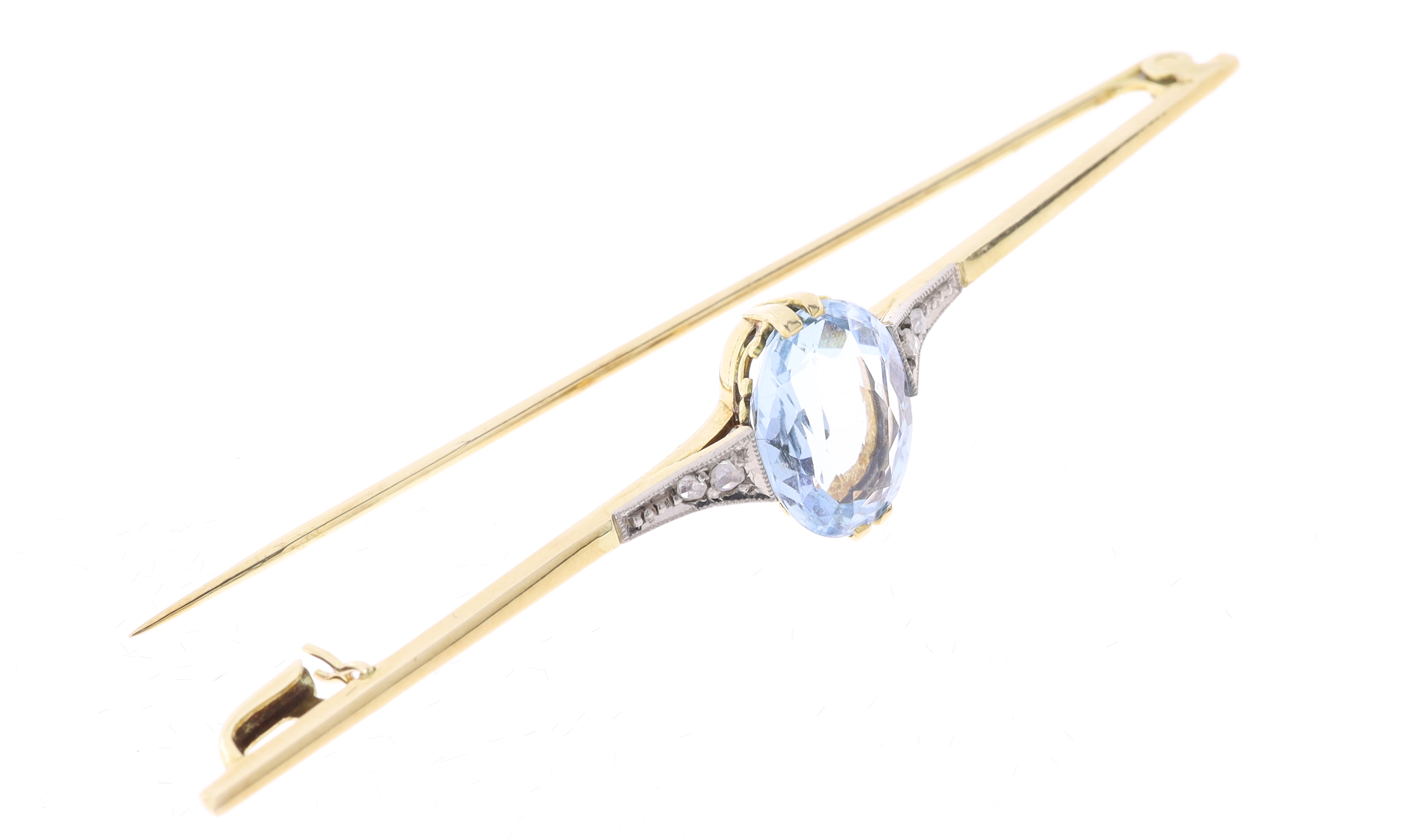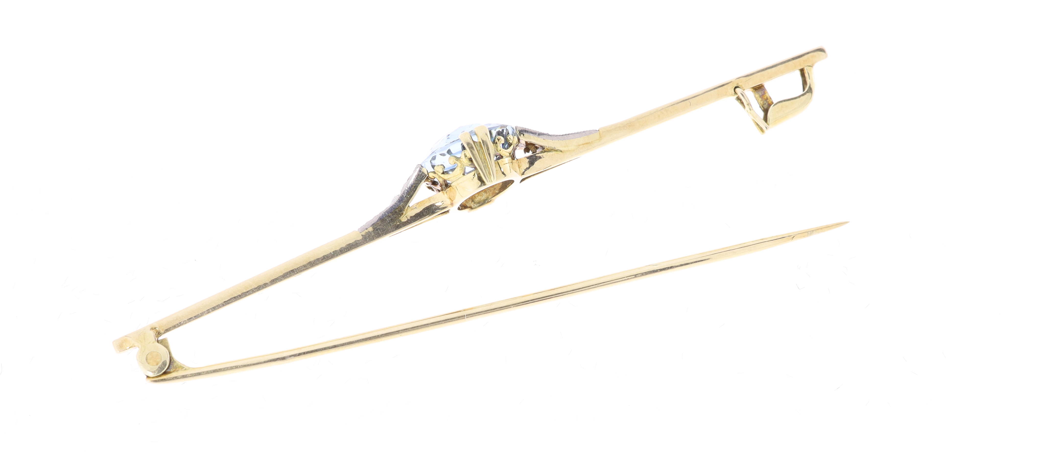 Elegantní vintage brož ze žlutého zlata 585, zdobená centrálně zasazeným oválným fasetovaným akvamarínem, uchyceným čtyřmi jemnými krapnami. Rám je jemně prolamovaný a po stranách doplněný dvojicí drobných diamantových růží různé velikosti. Brož má decentní tvar s mírným rozšířením směrem ke středu a nese jen nepatrné známky nošení.
