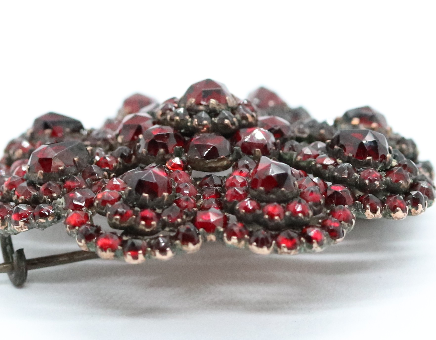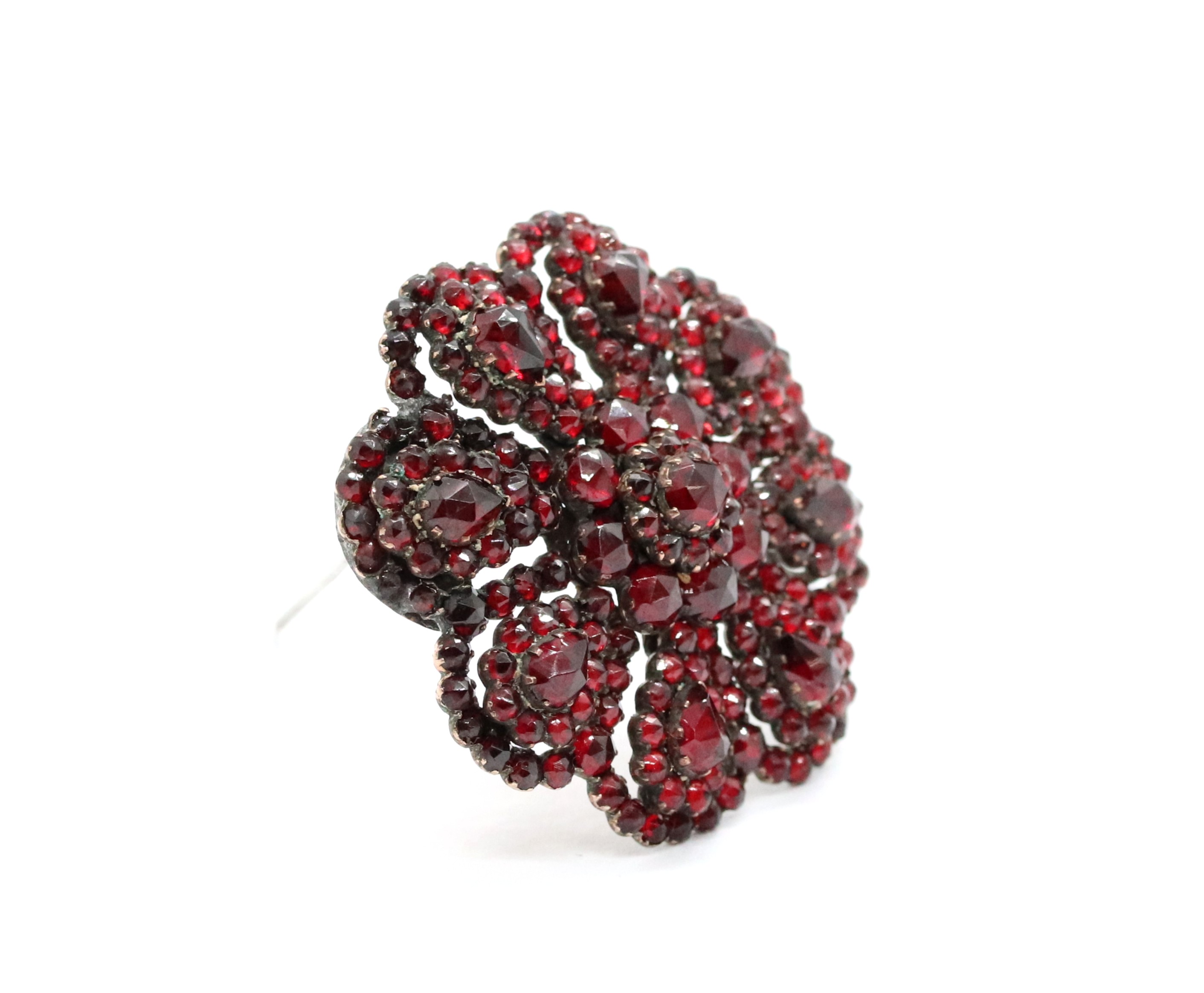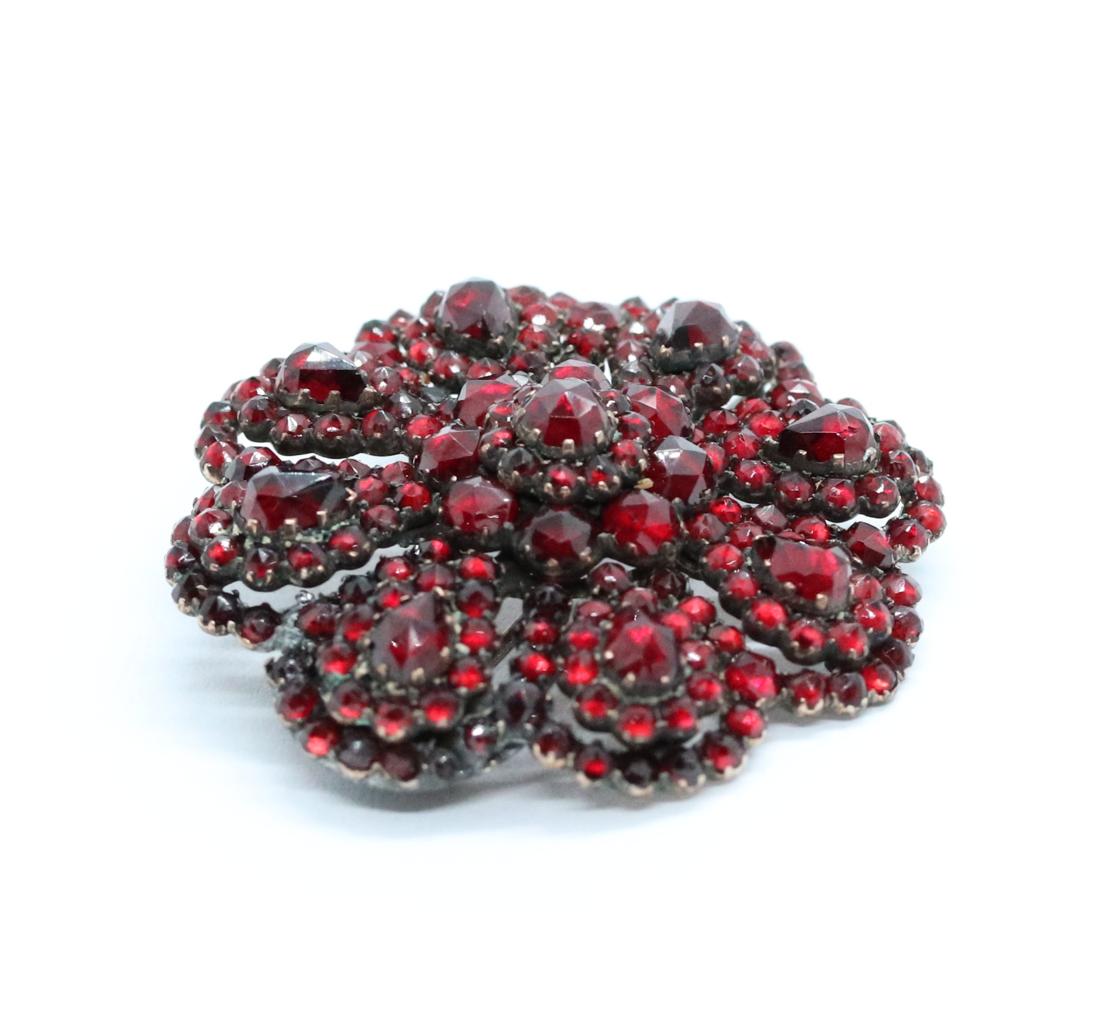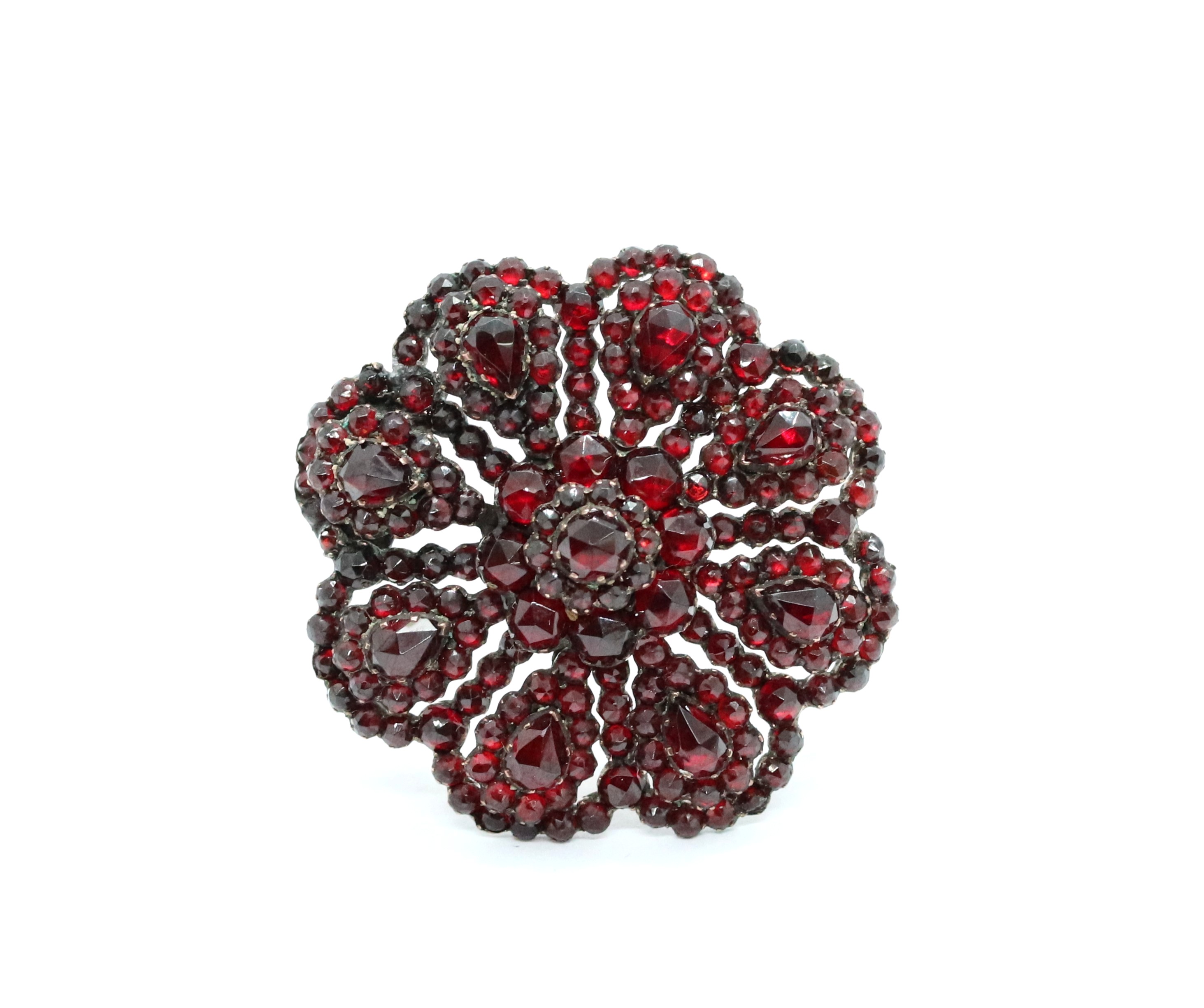 Mistrovsky zpracovaná brož z broušených českých granátů, osazených v tombaku, Čechy, 2. polovina 19. století; průměr 4 cm