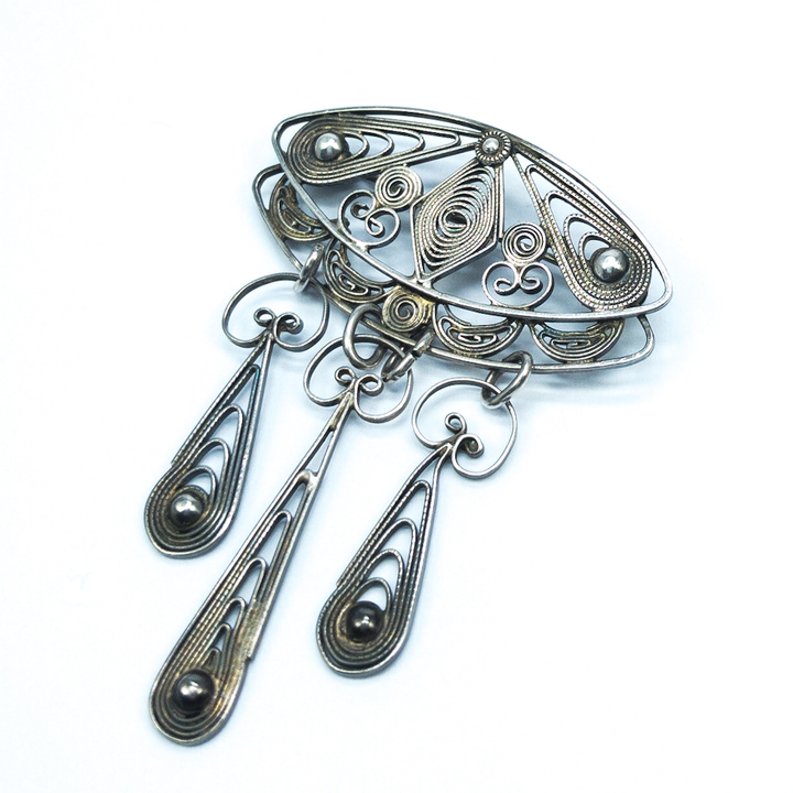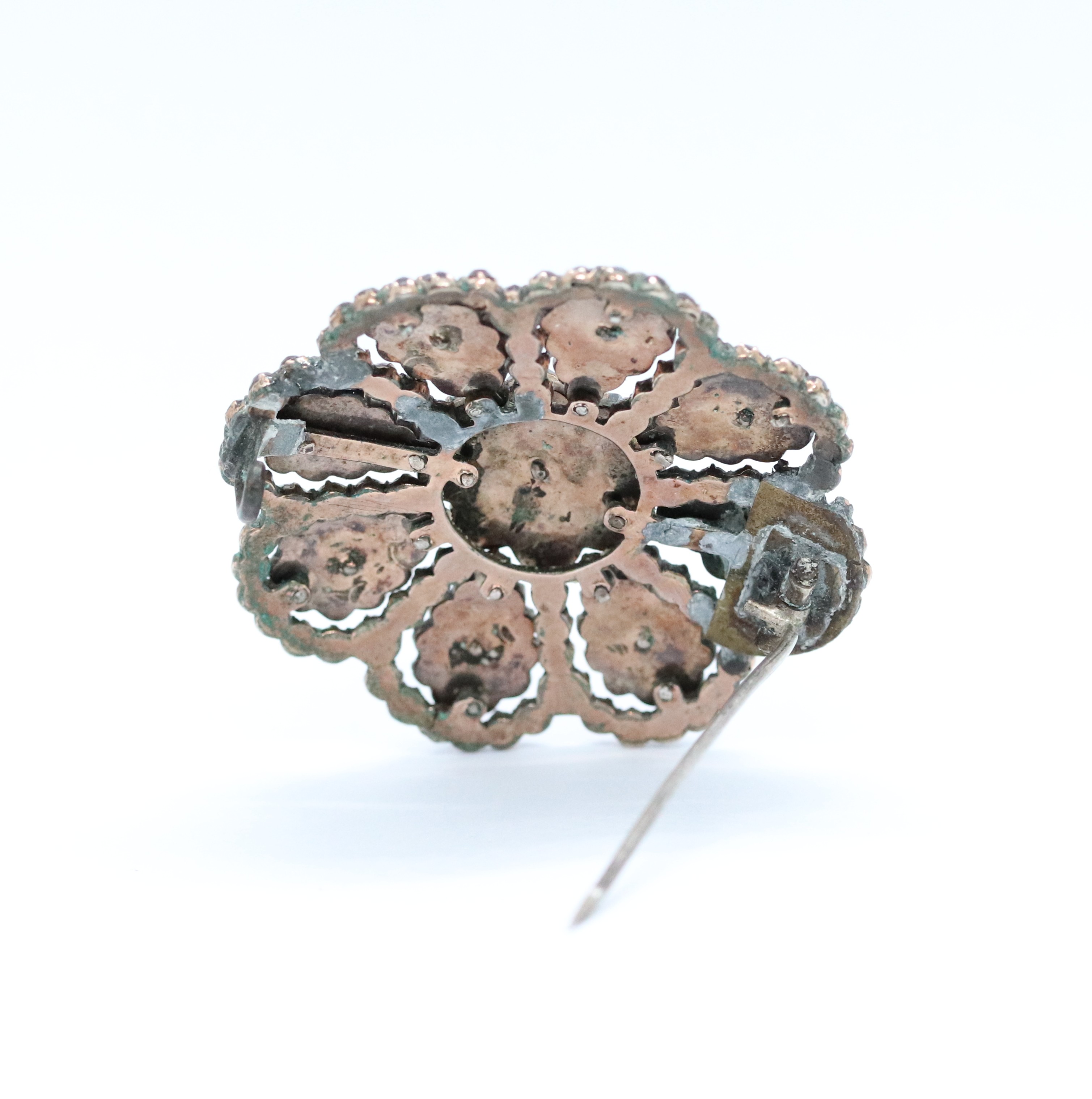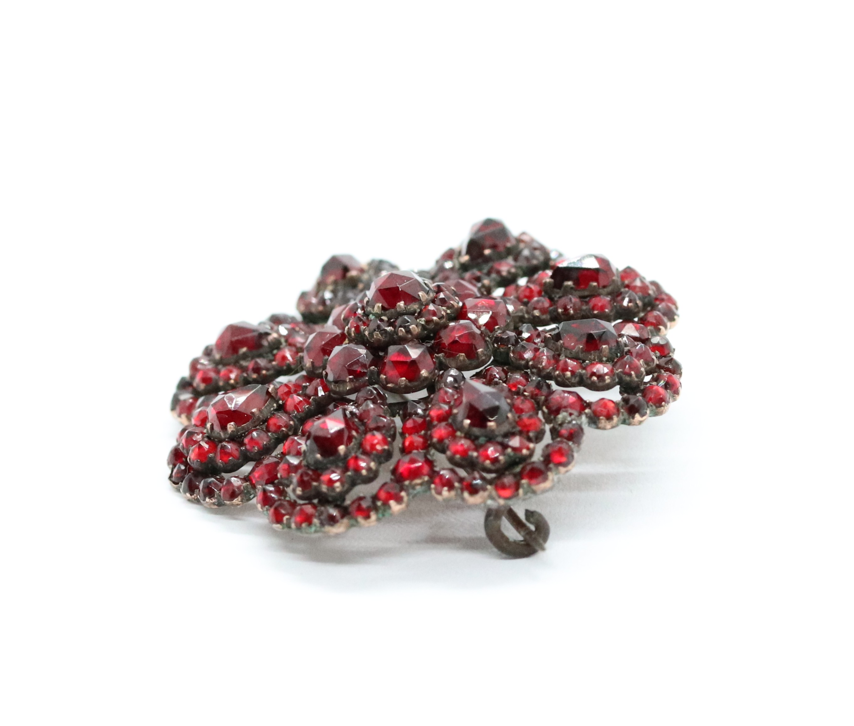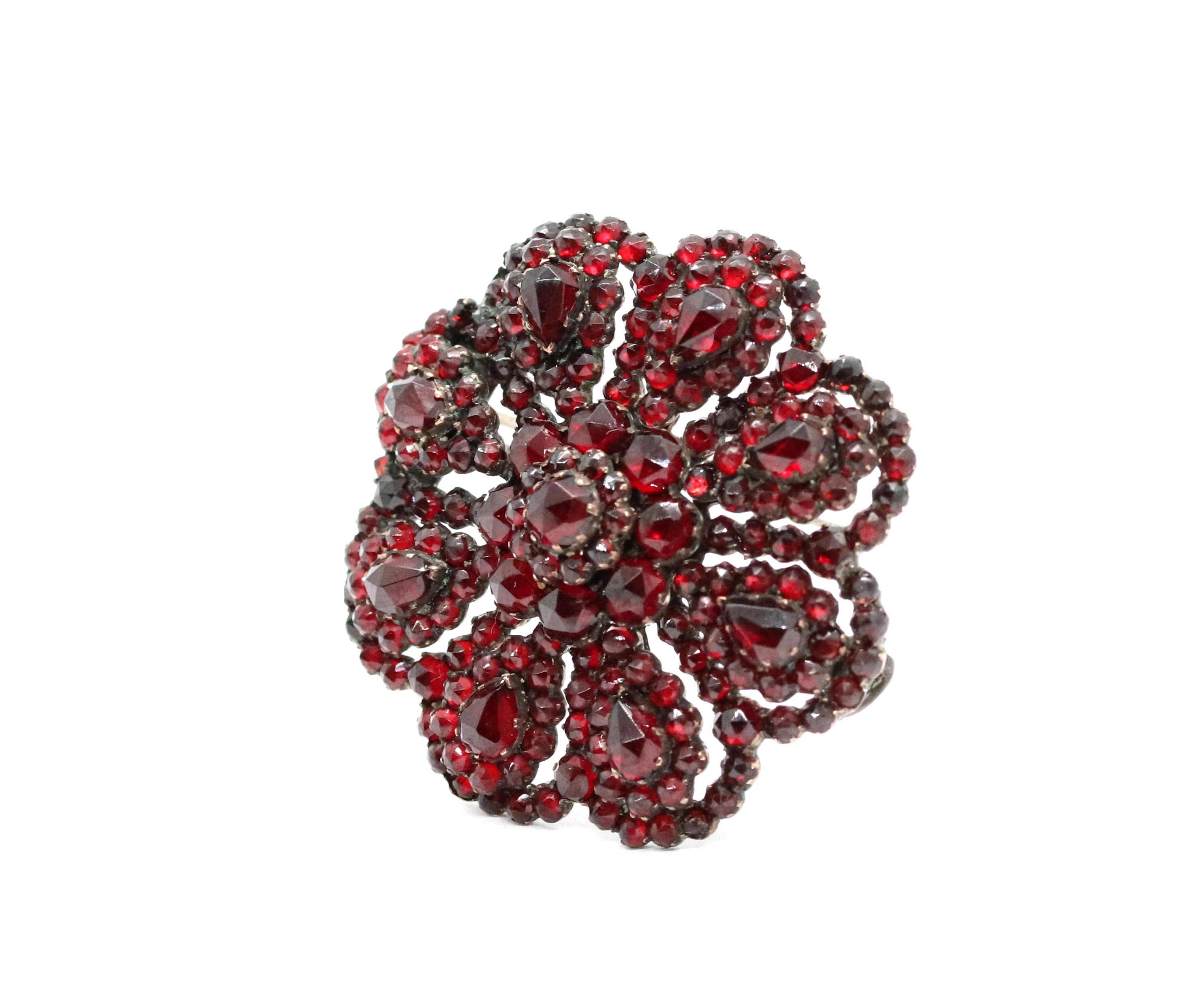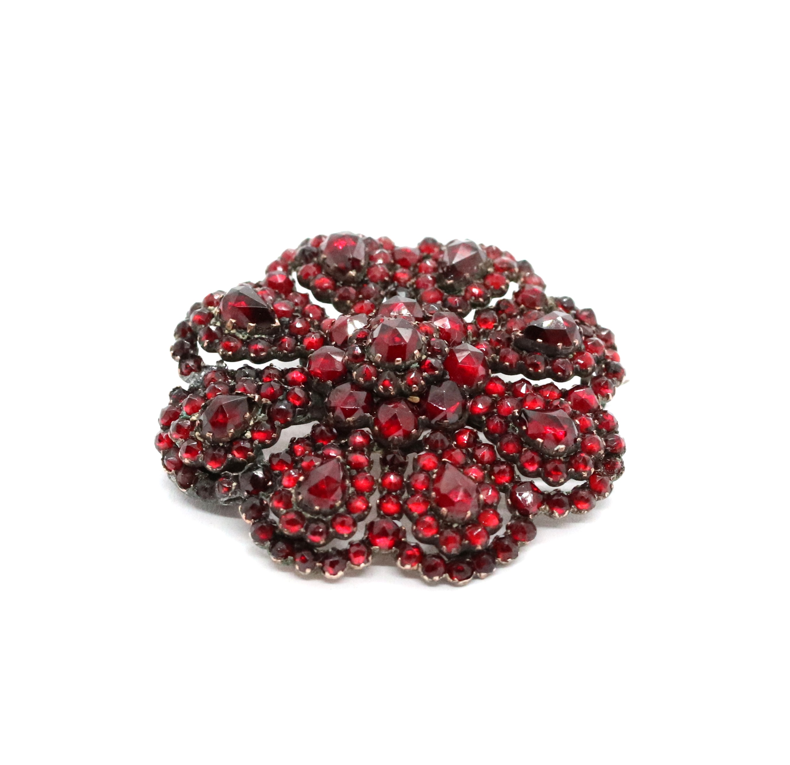 Mistrovsky zpracovaná brož z broušených českých granátů, osazených v tombaku, Čechy, 2. polovina 19. století; průměr 4 cm