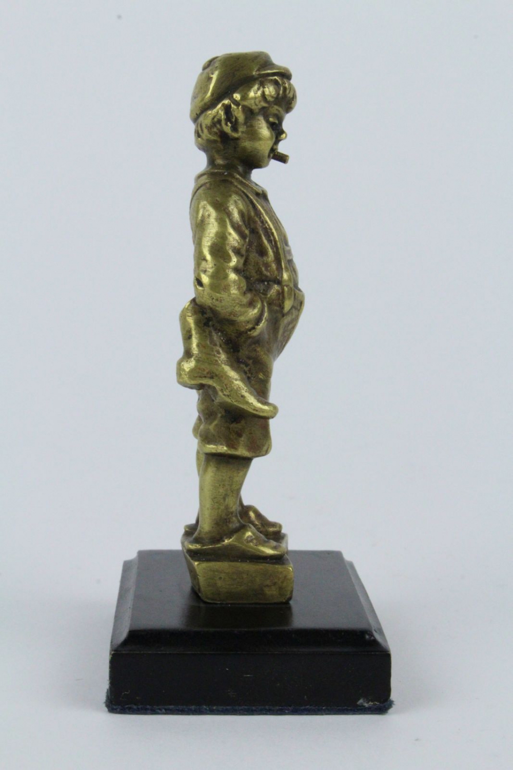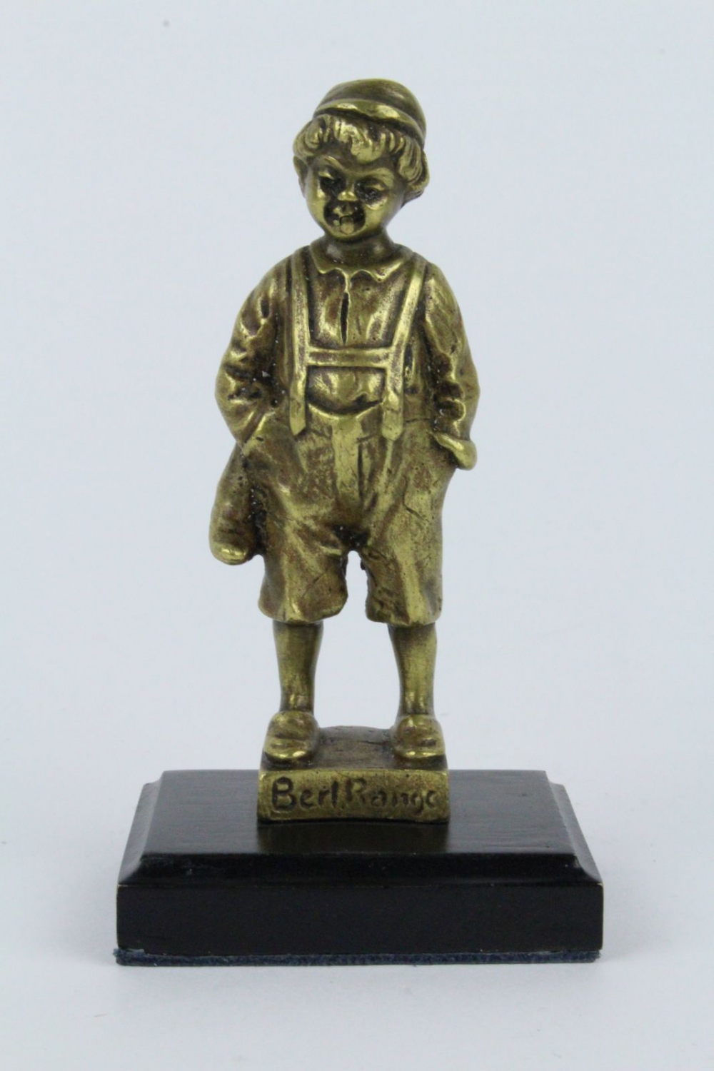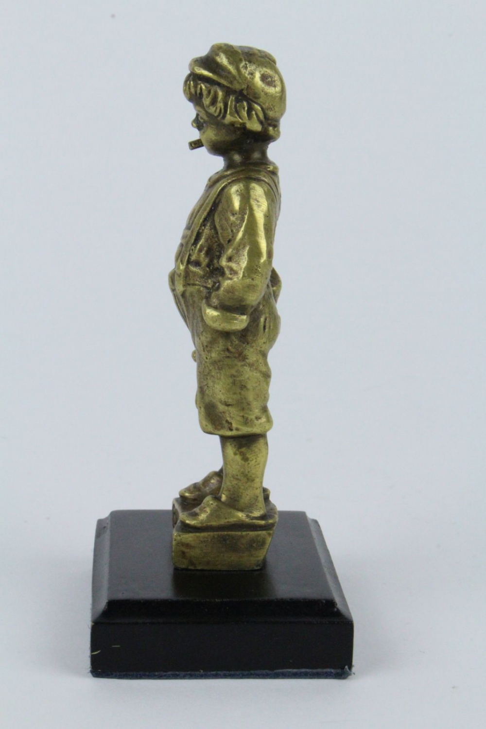 Bronzová soška chlapce s cigaretou, na dřevěném soklíku, značeno na přední straně Berl.Range, na zadní straně signováno Felling, (Julius Schmidt-Felling 1895 – 1930) – německo-holandský sochař, 1. čtvrtina 20. století; rozměry: 9,6 x 5,2 x 4 cm