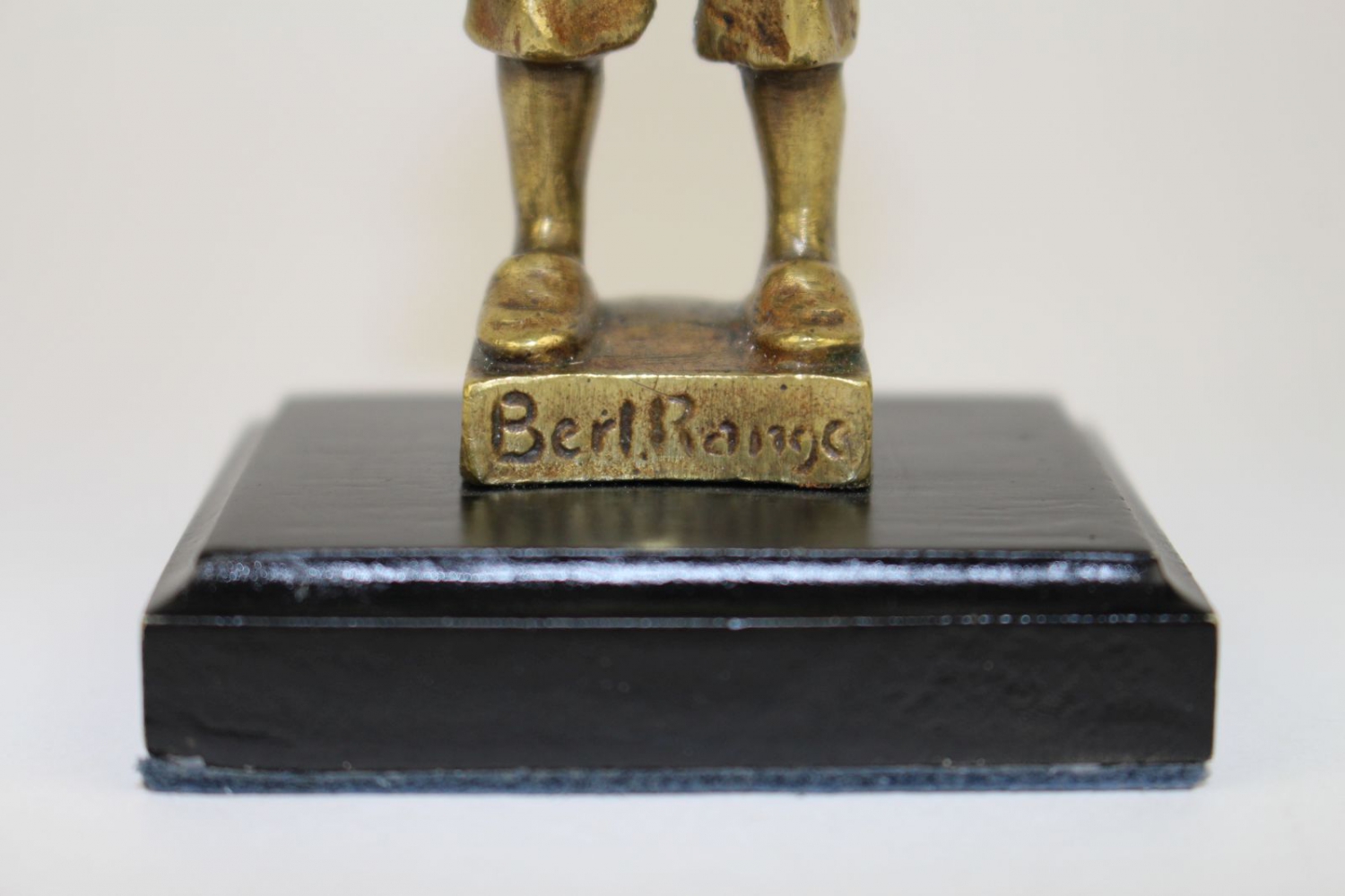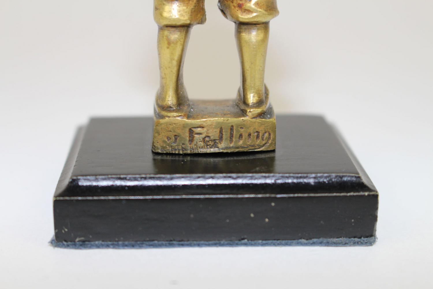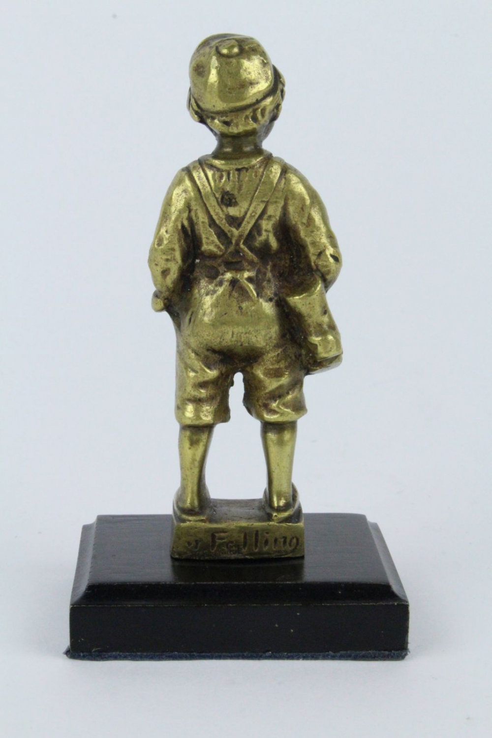 Bronzová soška chlapce s cigaretou, na dřevěném soklíku, značeno na přední straně Berl.Range, na zadní straně signováno Felling, (Julius Schmidt-Felling 1895 – 1930) – německo-holandský sochař, 1. čtvrtina 20. století; rozměry: 9,6 x 5,2 x 4 cm