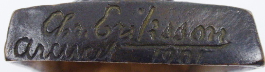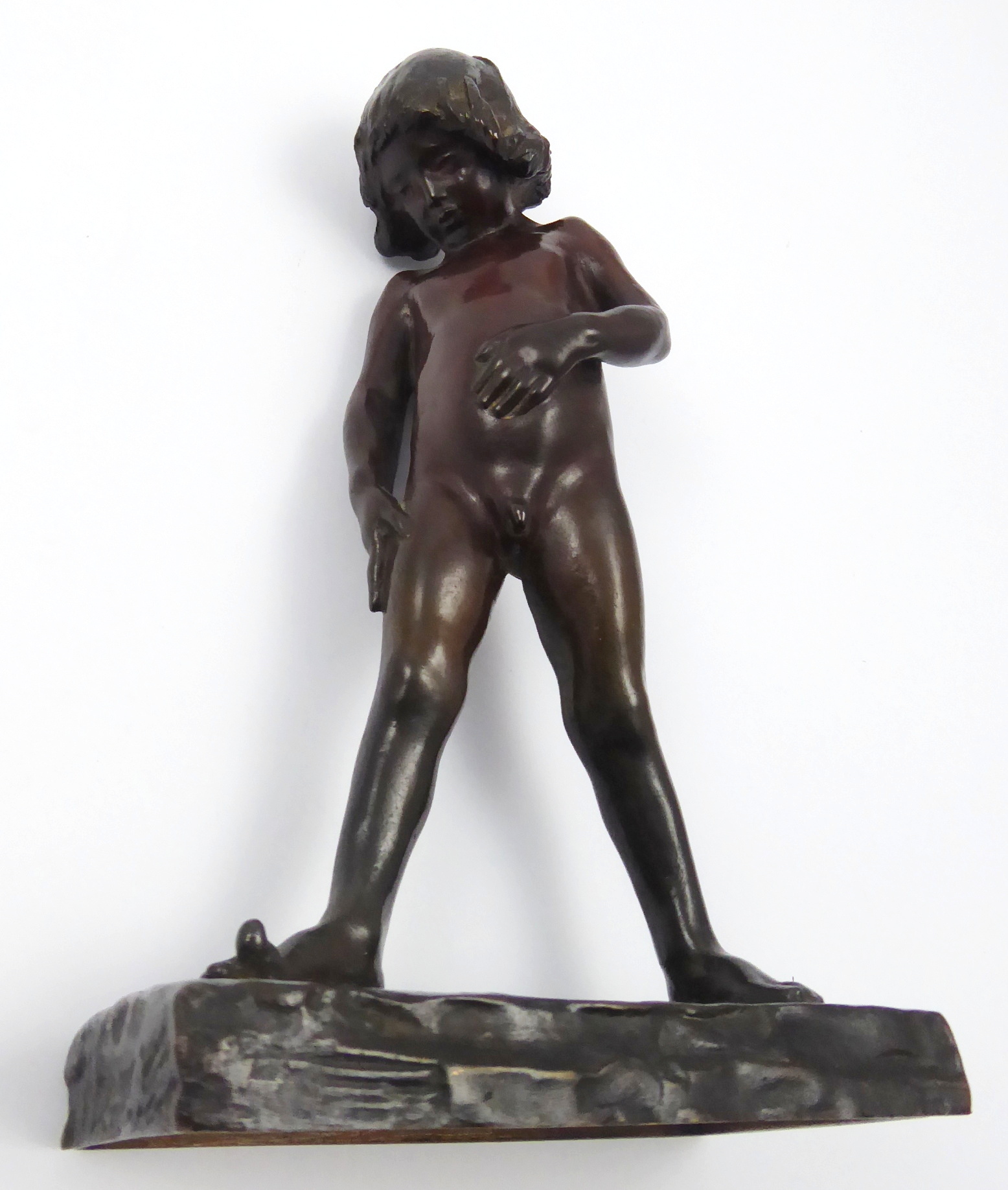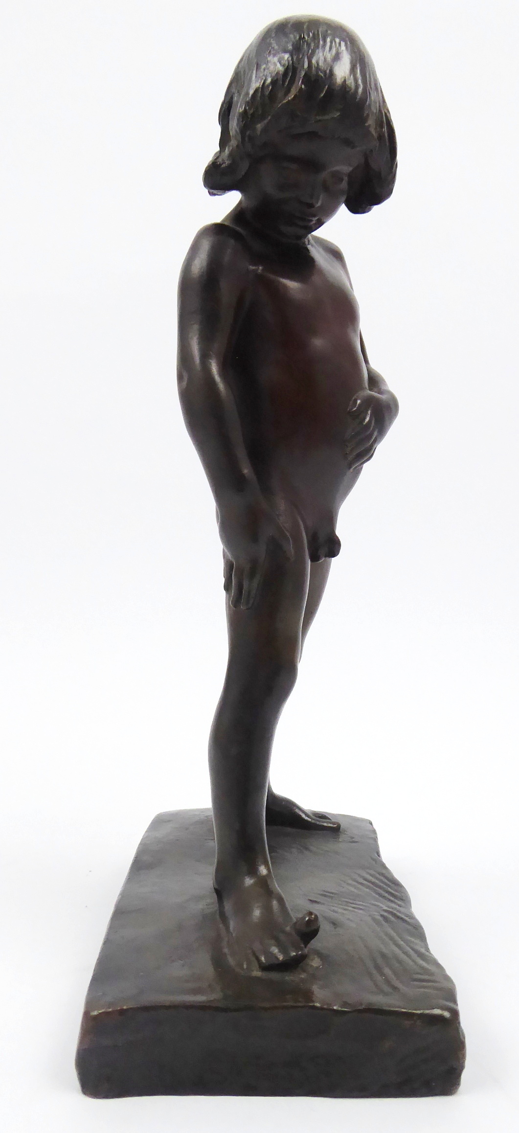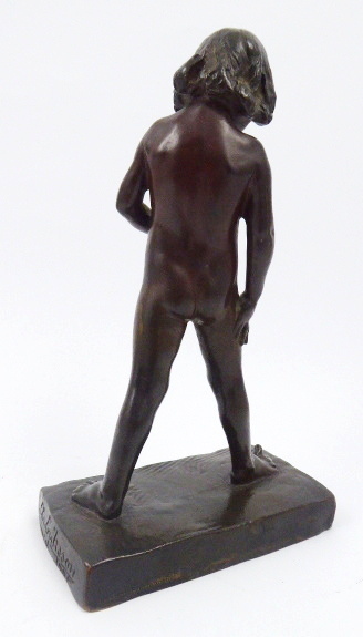 Bronz. Autor: Christian Eriksson (1858-1931) slavný švédský sochař. Název: Elof. Signováno na plintě: CHR. ERIKSSON, ARCUEIL, 1901. Vzadu na plintě: značka umělecké slévárny Herman Bergman. Tato malá socha se stala velmi populární a sochař Eriksson díky ní získal titul \“Sociétaire\“ v \“La Société nationale des Beaux-Arts\\\“. Byla prezentována i na výstavě Uměleckého spolku ve Stockholmu. Ilustrace této sošky je publikována na straně 155 v knize: Helge Kjellin – Christian Eriksson 1858 – 1935, vydalo nakladatelství SAK v roce 1953. Velmi působivá bronzová soška umělcova čtyřletého syna Elofa, který je téměř zděšen, když zjistí, že může hýbat palcem na noze. Malý Elof se skloněnou hlavou je rozkročený a levou ruku má položenou na břiše. Na nízkém obdélném mírně reliéfně zvrásněném podstavci. Francie, Arcueil, rok 1901. Výška 20 cm, rozměr podstavce 11 cm x 7 cm.