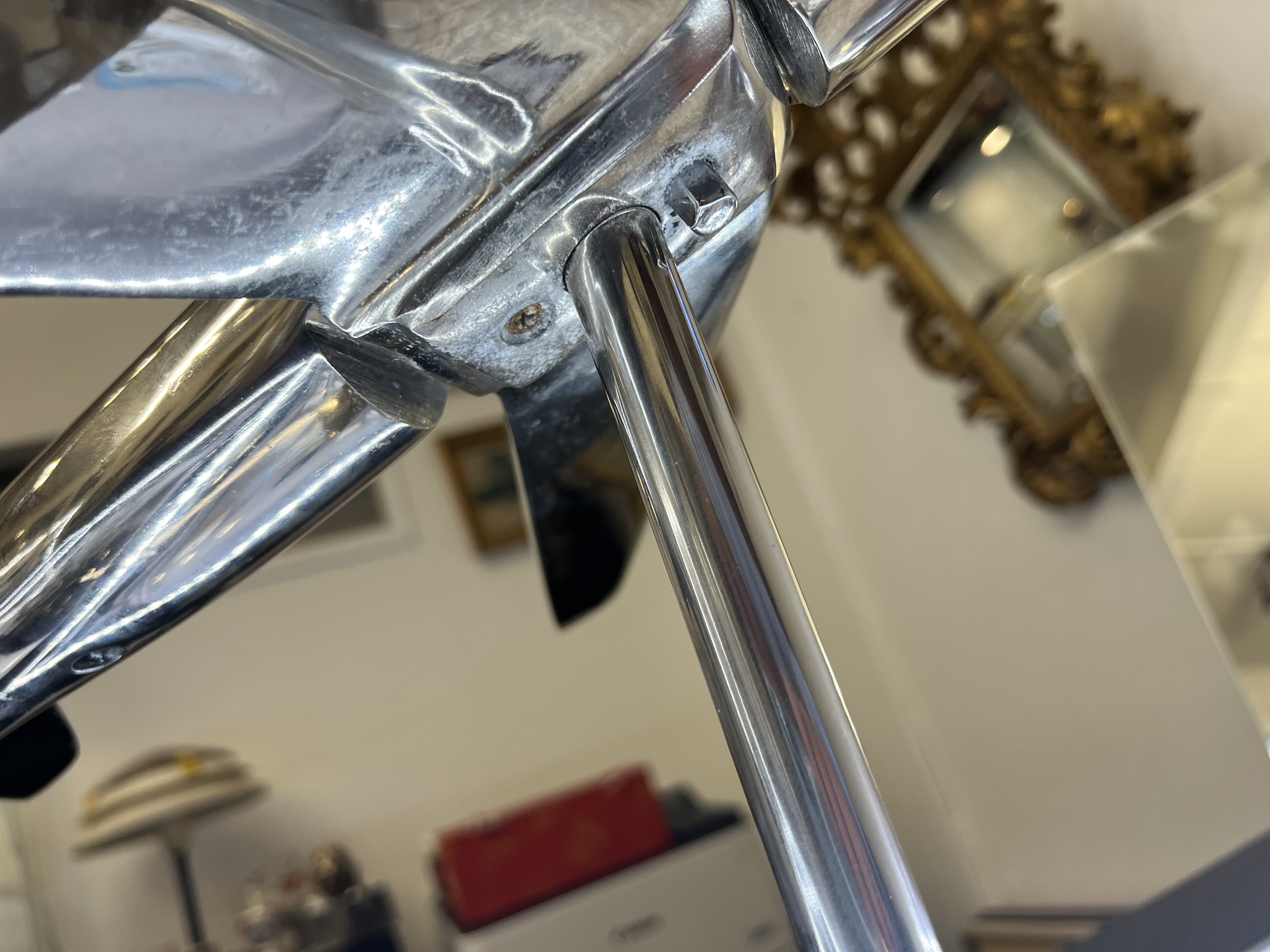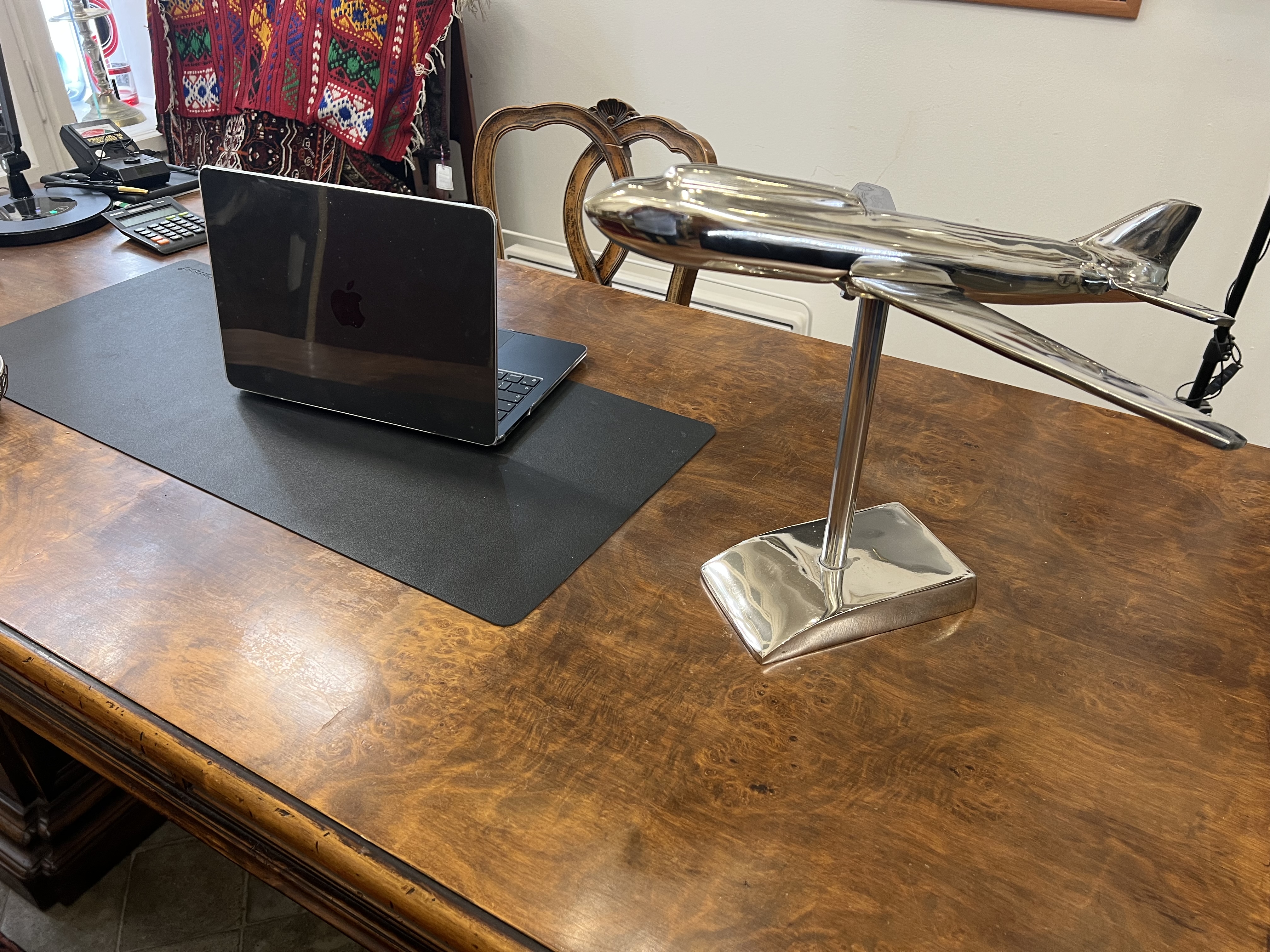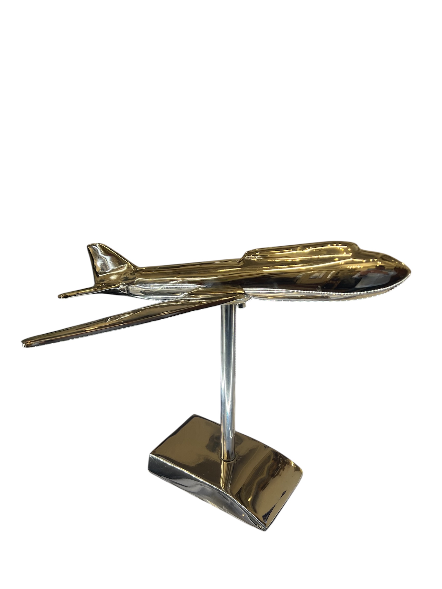Stylové chromové letadlo na podstavci, zpracované jako výrazný dekorativní objekt s industriálním nádechem. Díky lesklému chromovanému povrchu a elegantním liniím působí velmi efektně v interiéru – ideální na pracovní stůl, do kanceláře, knihovny nebo moderního obývacího prostoru. Jedná se o starší kus, který má drobné známky používání, ty však nijak nesnižují jeho dekorativní hodnotu ani celkový dojem.