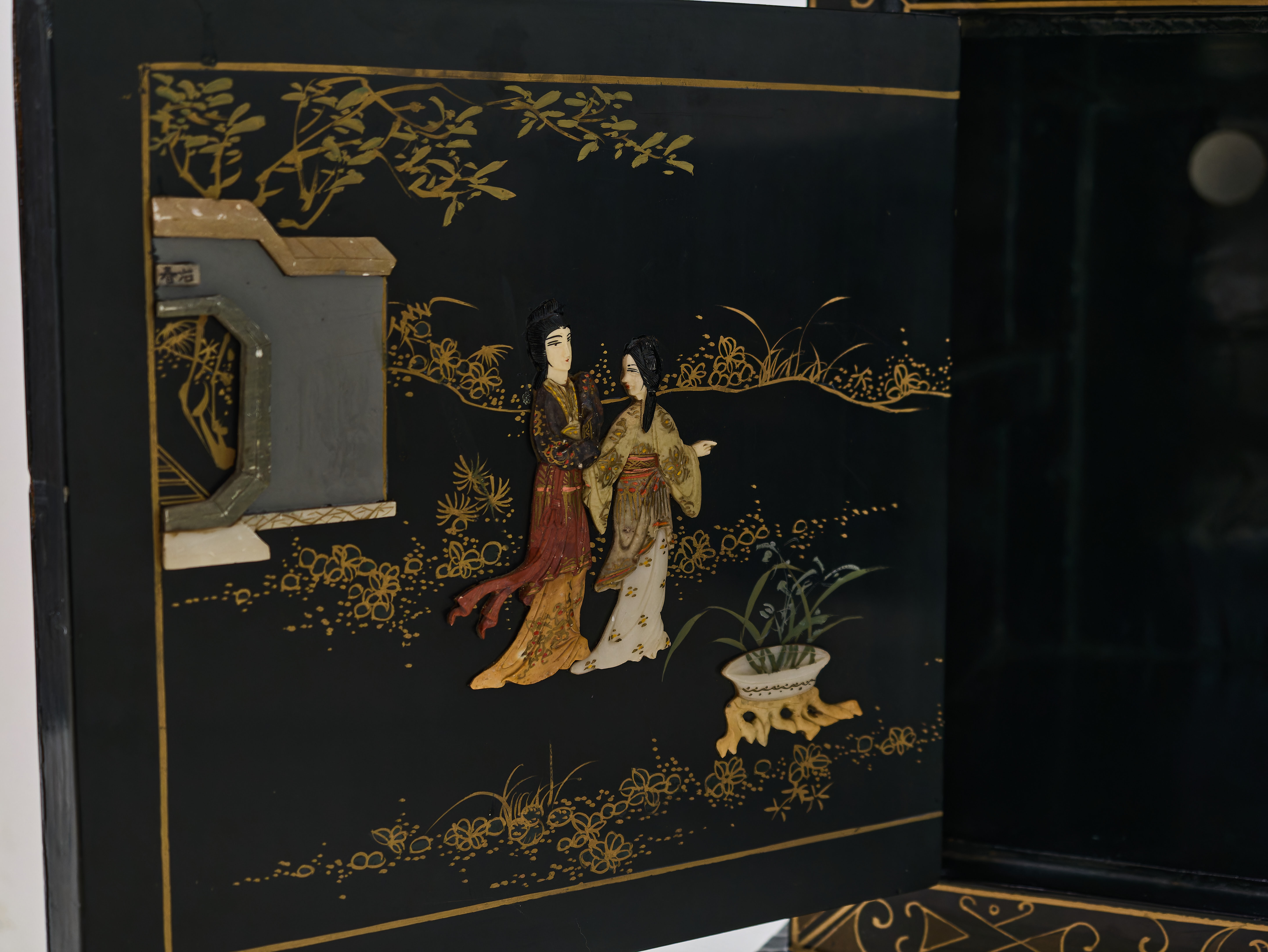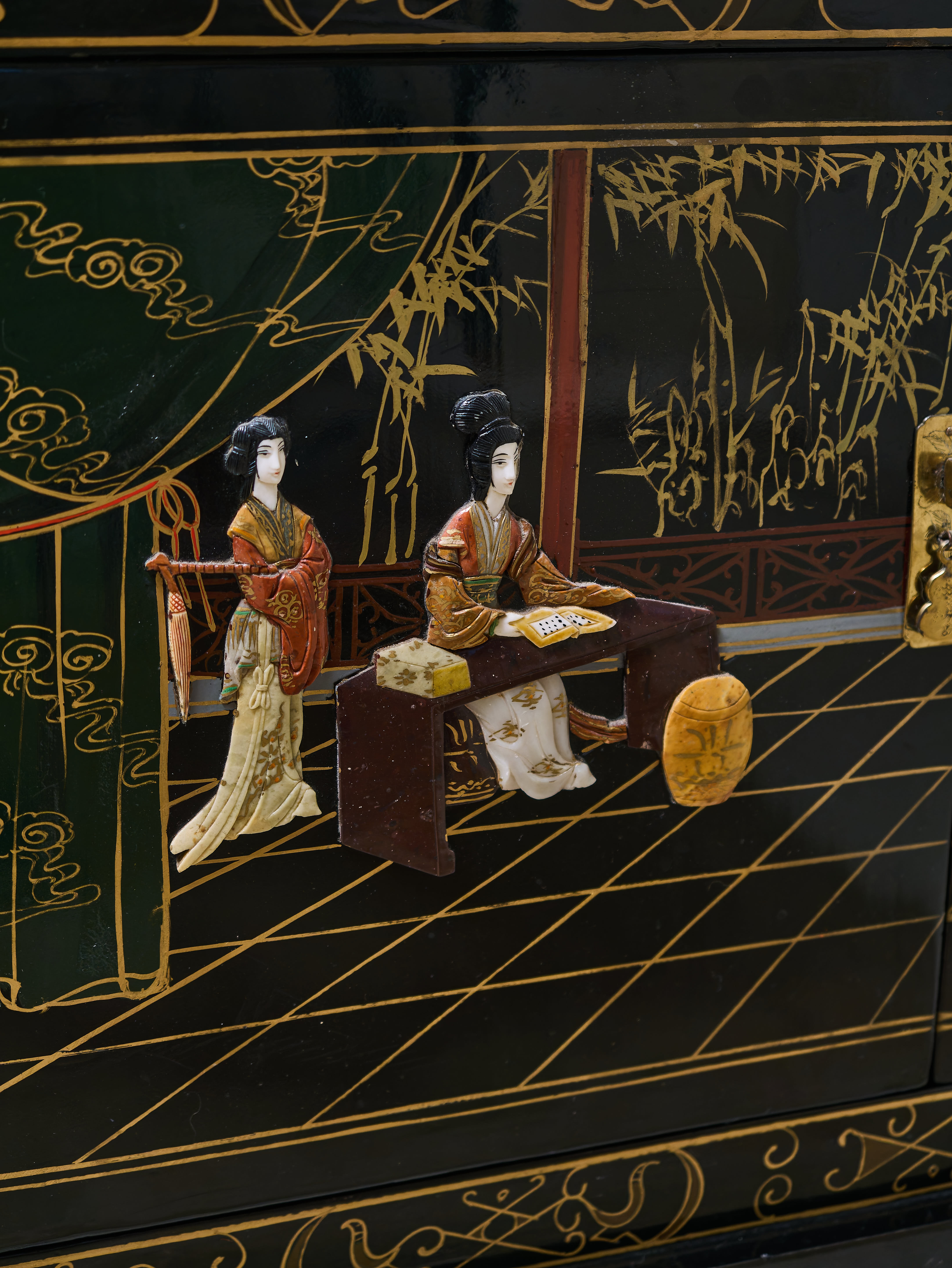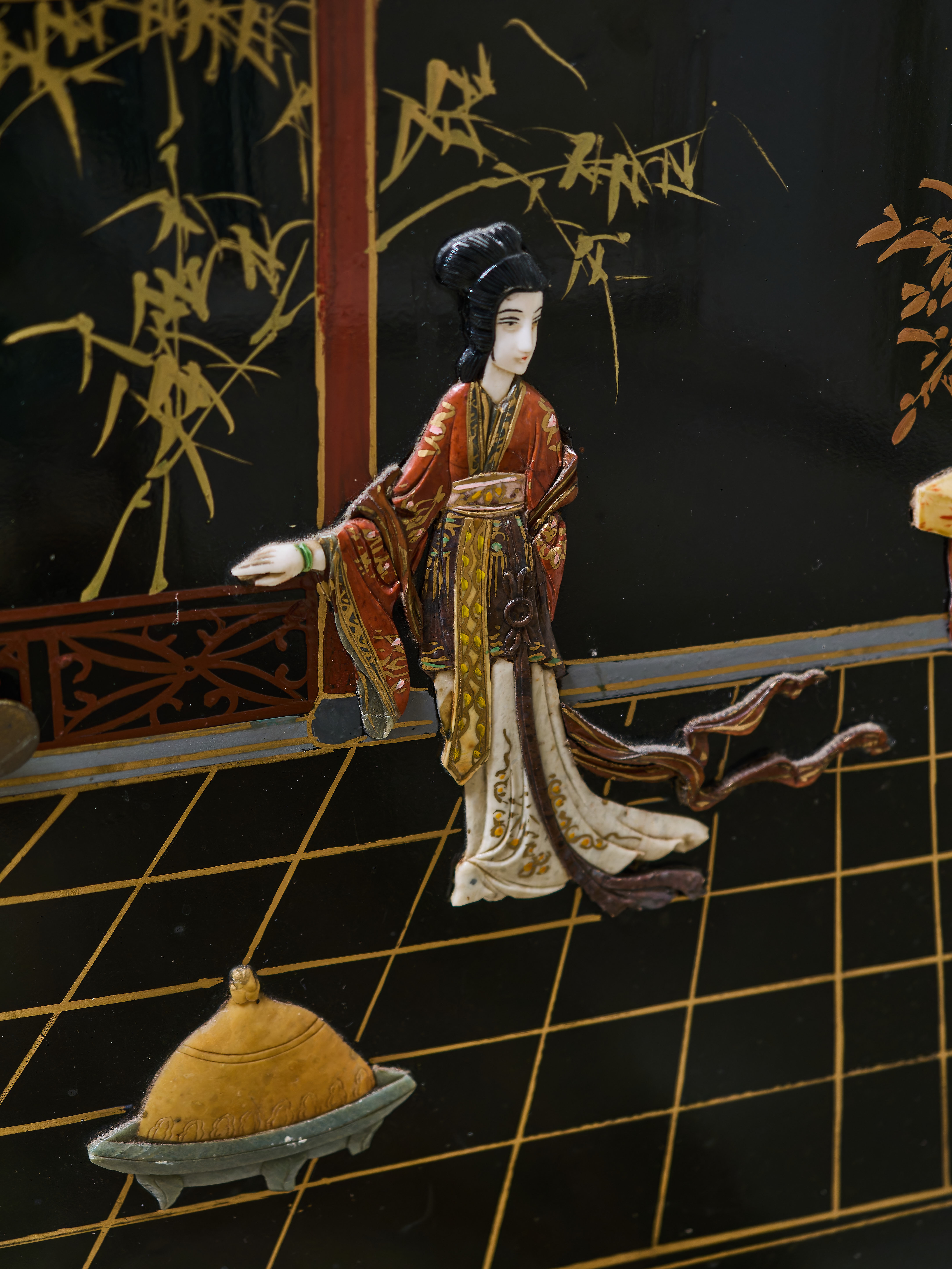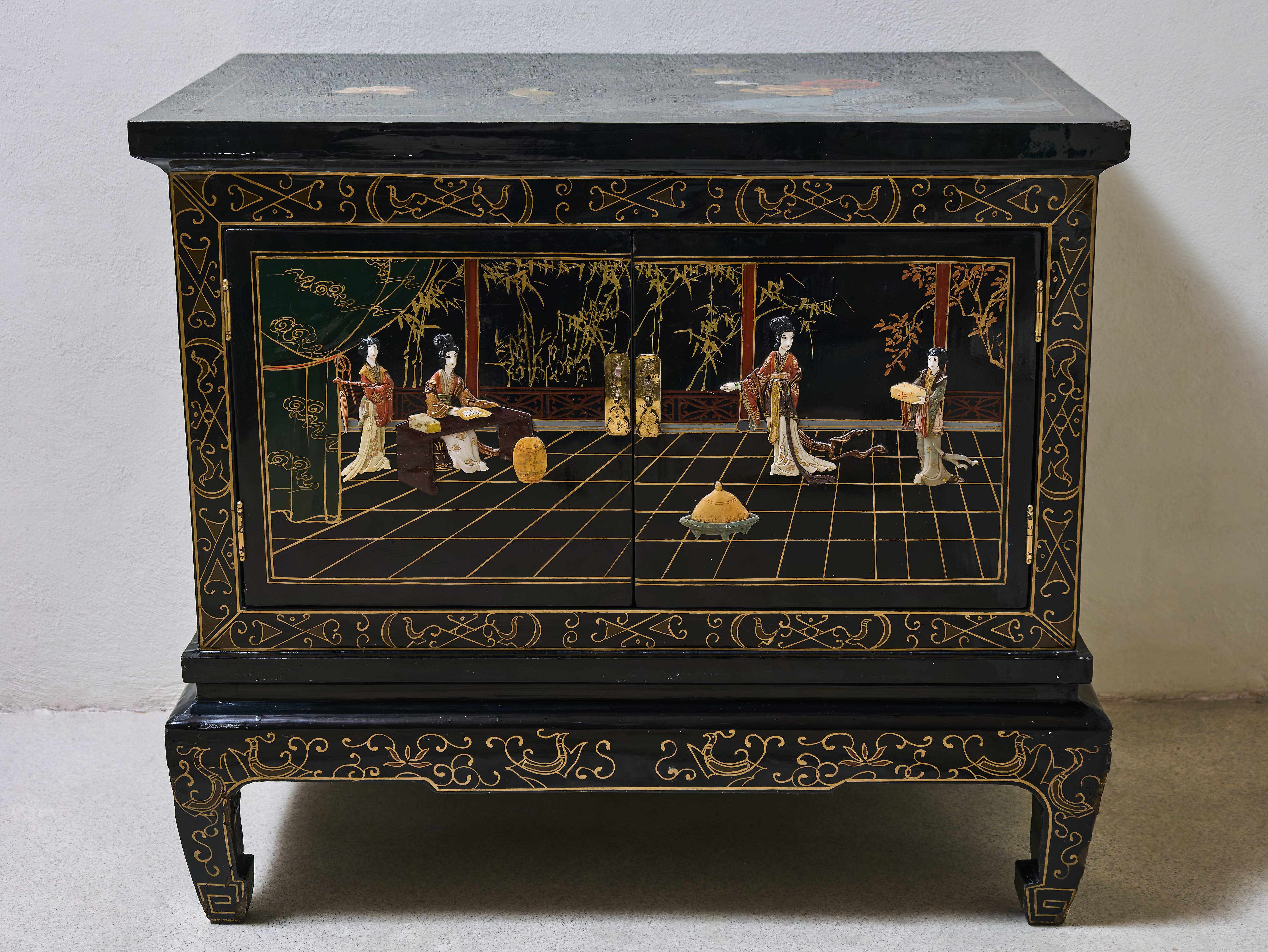 Čínská lakovaná komoda na podstavci z druhé poloviny 20. století, přibližně kolem roku 1980. Nábytek je zhotoven ze dřeva a opatřen hlubokým černým lakem s jemnou ručně malovanou zlatou dekorací. Přední stranu zdobí výrazná figurální scéna z prostředí čínského palácového interiéru, kde jsou postavy dvorních dam provedeny technikou plastické intarzie z řezaného kamene a dalších přírodních materiálů. Tento způsob dekorace vytváří jemný reliéf a dodává celé kompozici mimořádnou prostorovou plasticitu.
