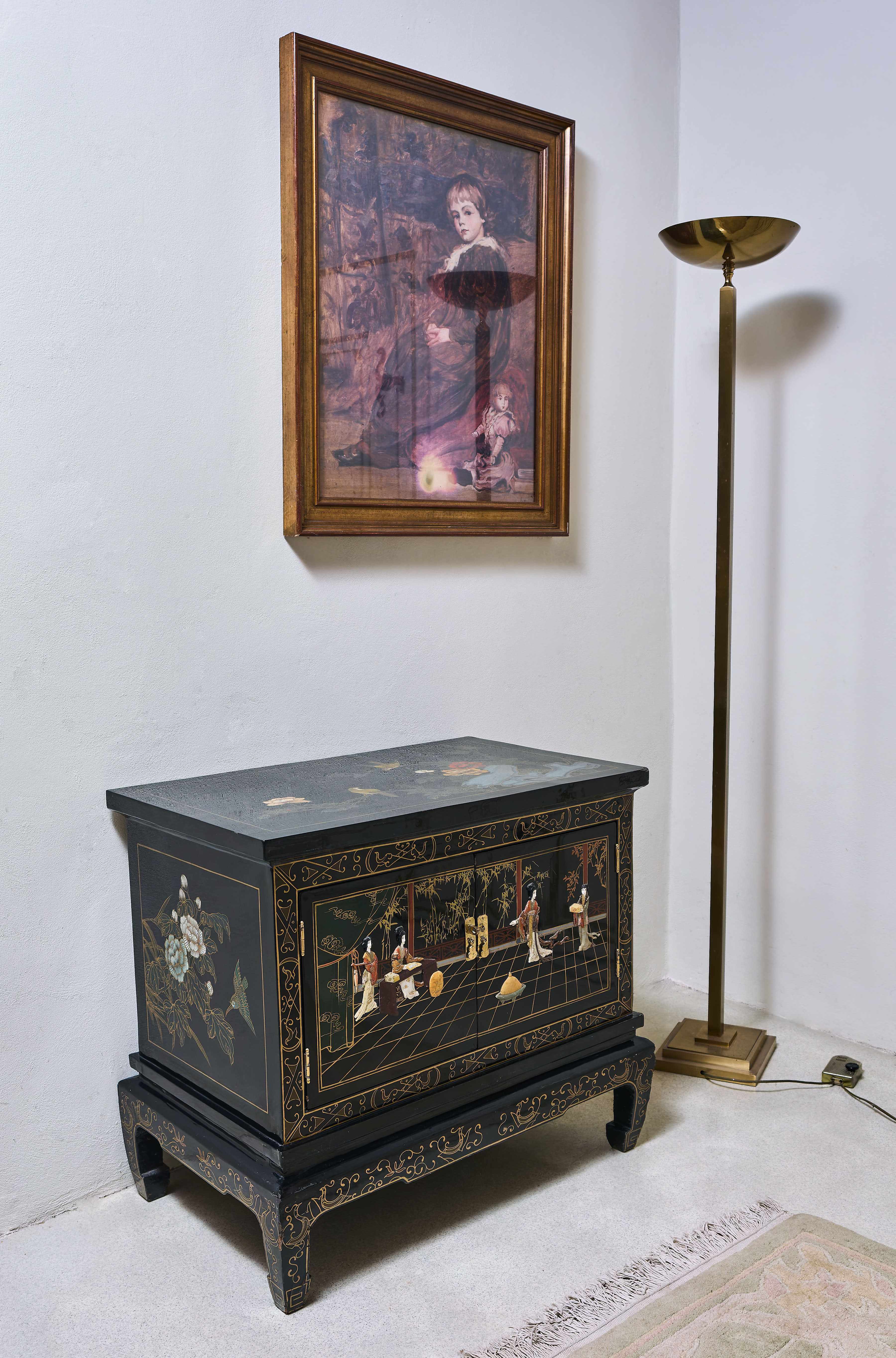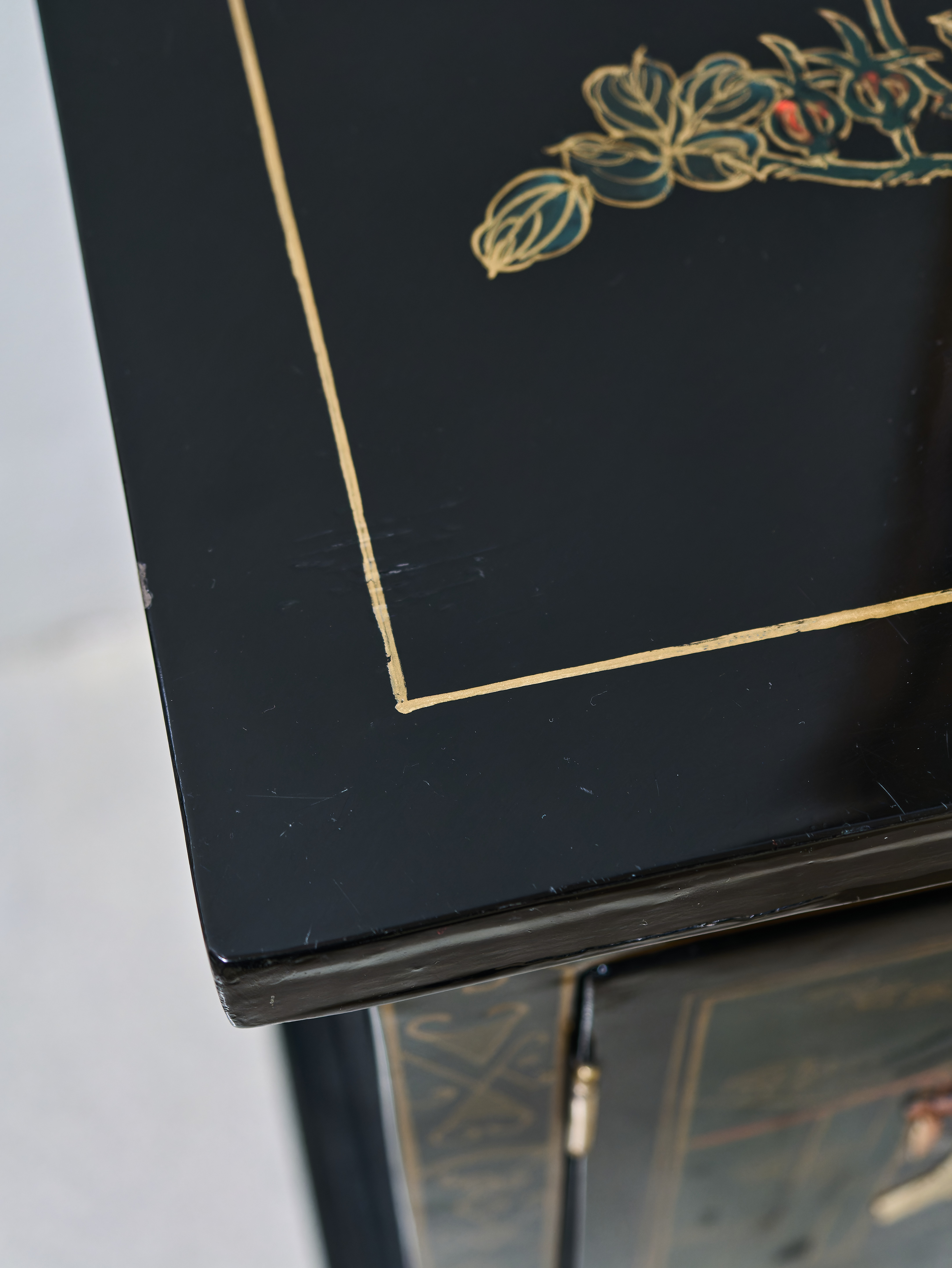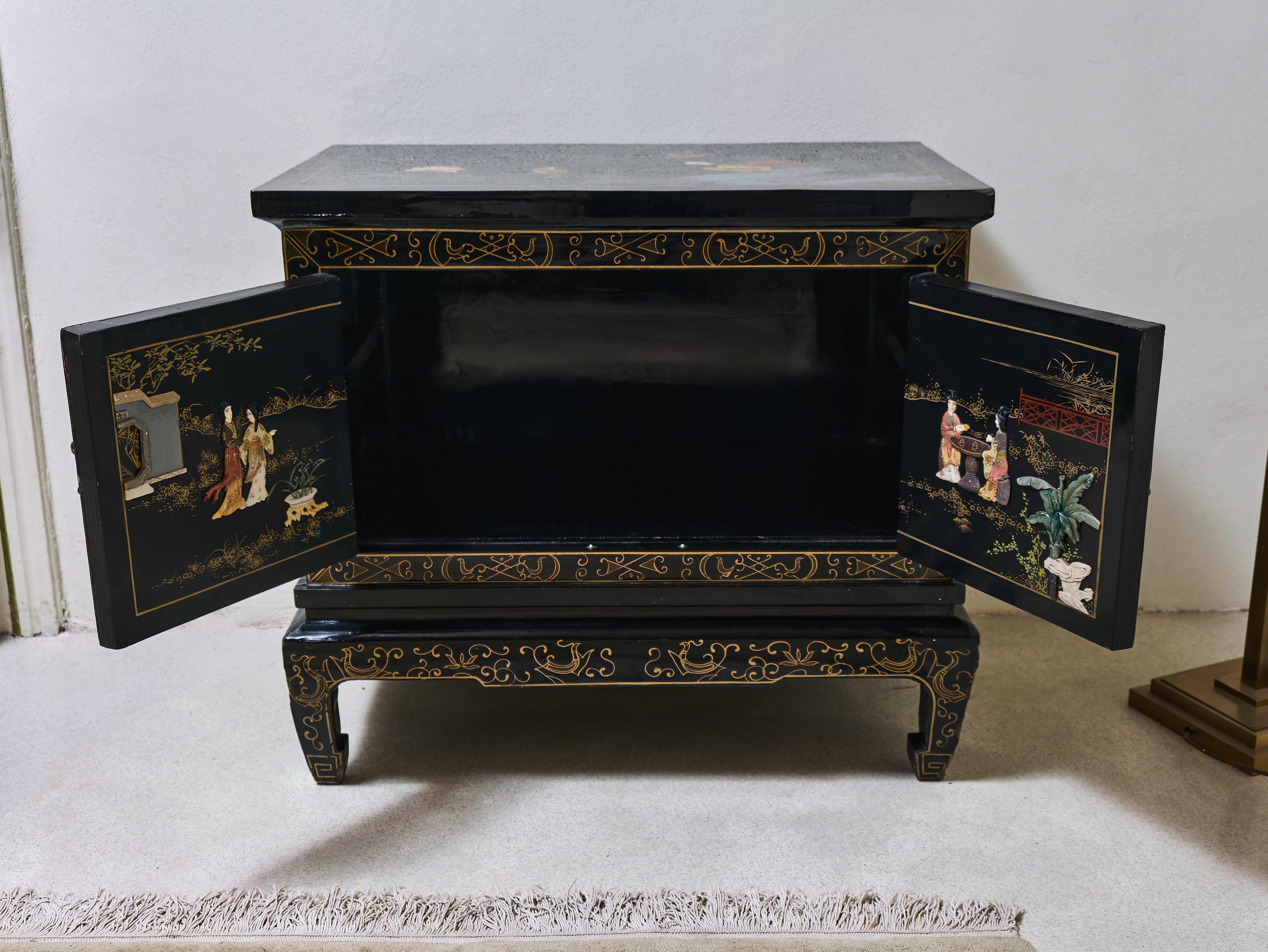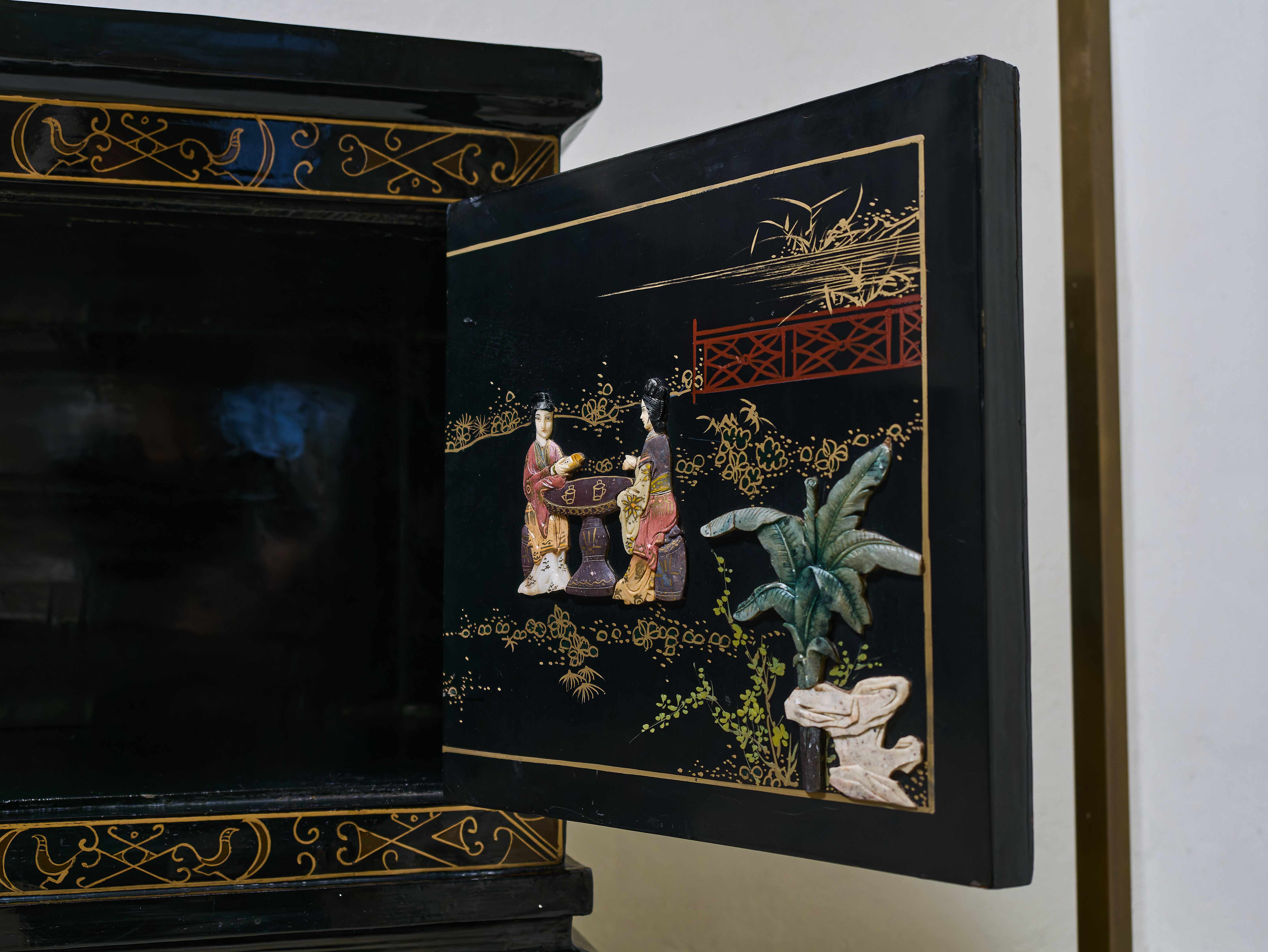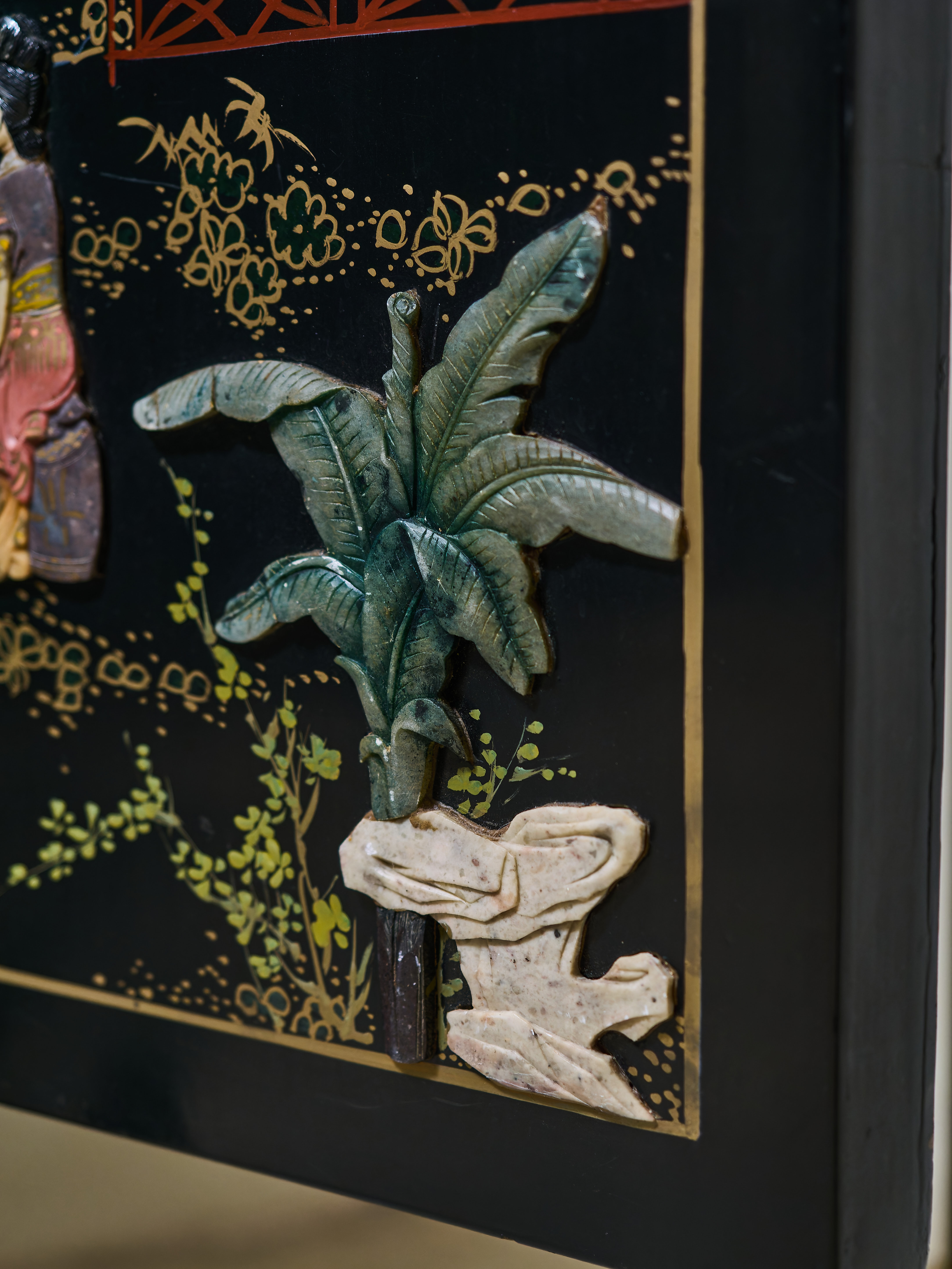 Čínská lakovaná komoda na podstavci z druhé poloviny 20. století, přibližně kolem roku 1980. Nábytek je zhotoven ze dřeva a opatřen hlubokým černým lakem s jemnou ručně malovanou zlatou dekorací. Přední stranu zdobí výrazná figurální scéna z prostředí čínského palácového interiéru, kde jsou postavy dvorních dam provedeny technikou plastické intarzie z řezaného kamene a dalších přírodních materiálů. Tento způsob dekorace vytváří jemný reliéf a dodává celé kompozici mimořádnou prostorovou plasticitu.