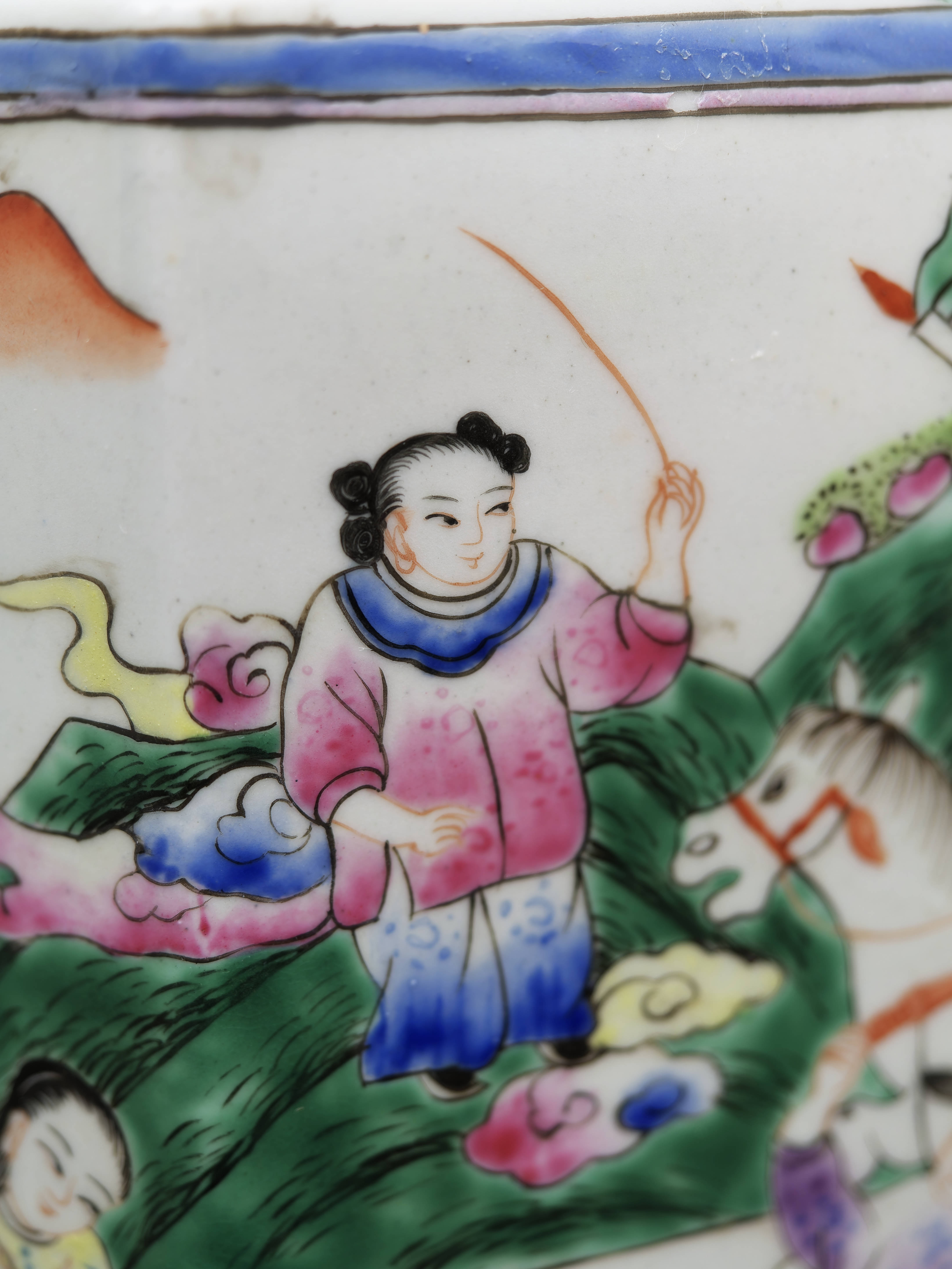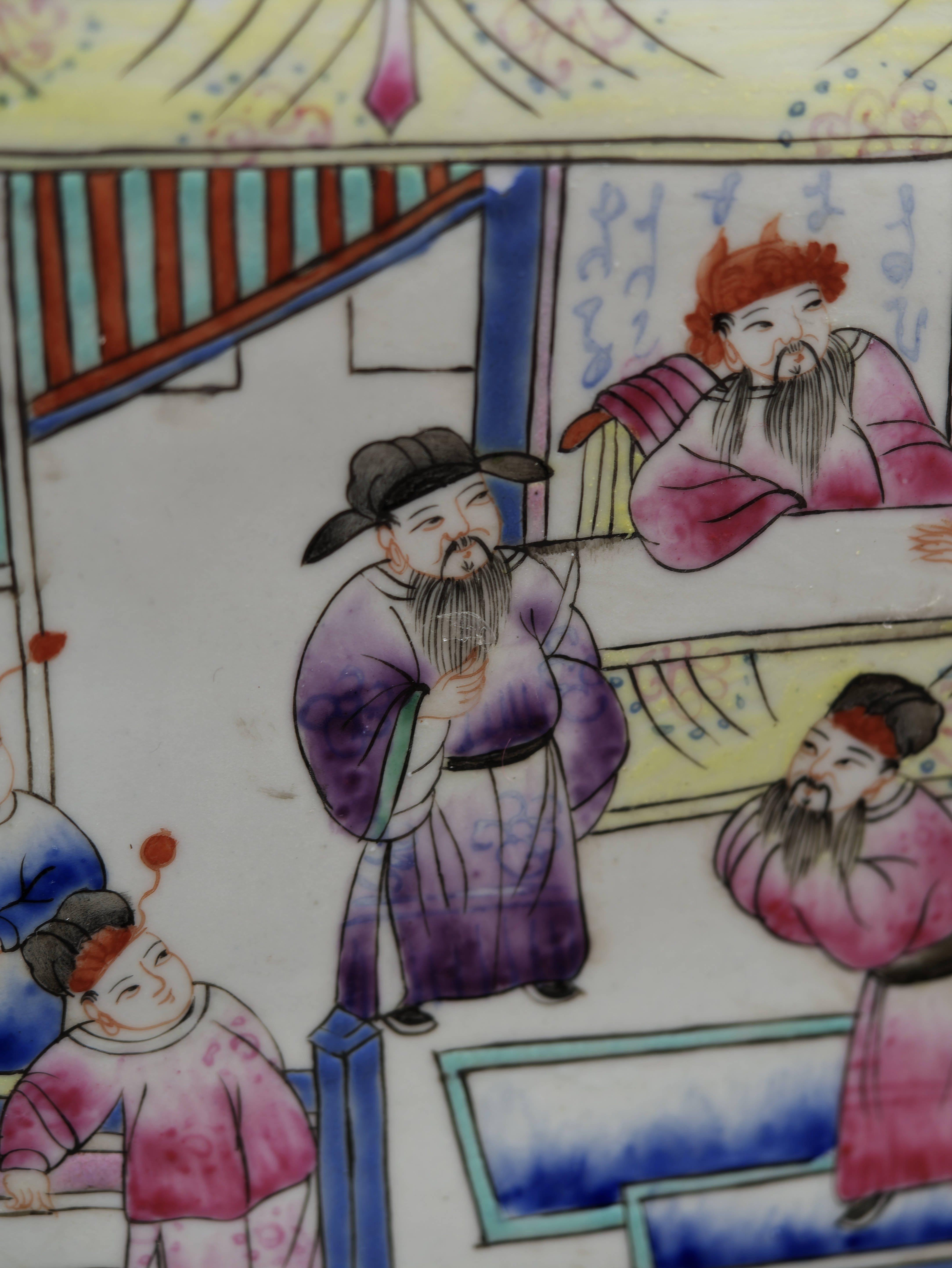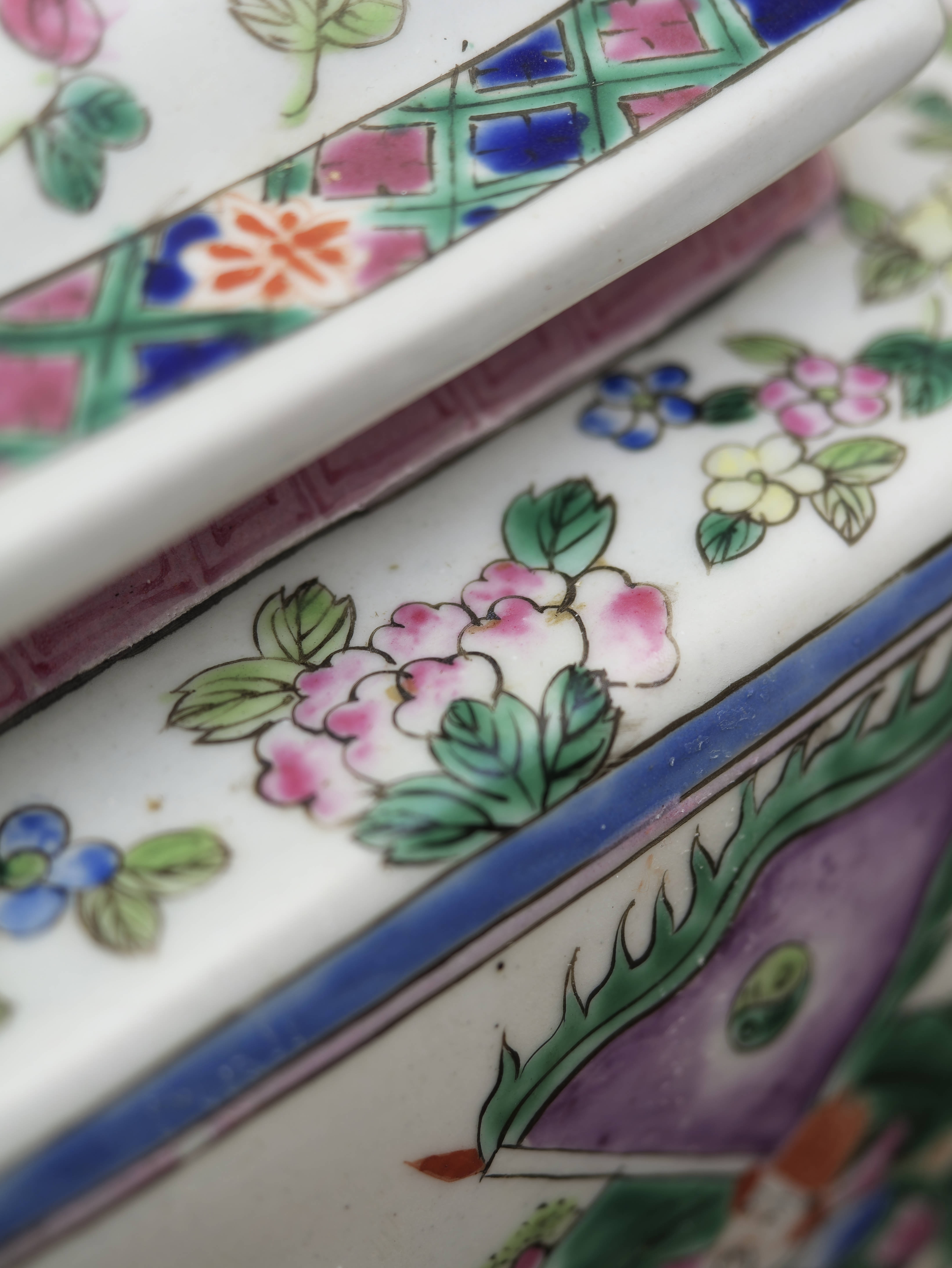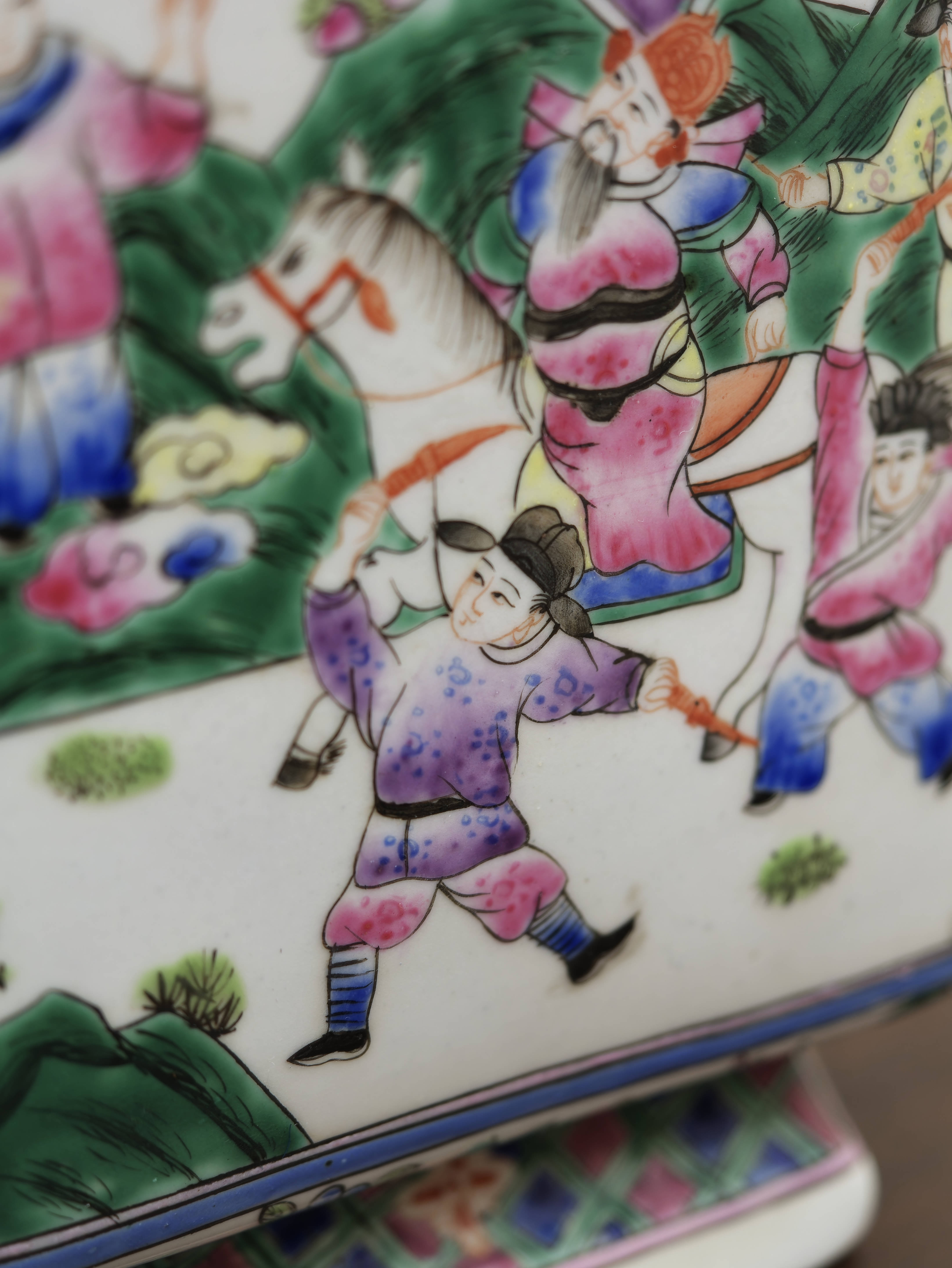 Na jednotlivých stěnách se střídají figurální výjevy s postavami v krajině a v interiéru s jemně pojatými květinovými motivy. Víko i spodní část doplňují dekorativní ornamentální pásy v růžových, zelených a modrých tónech, které celku dodávají živost a ozdobnost. Malba působí lehce a kultivovaně a dobře ukazuje oblibu narativních i florálních motivů v čínském porcelánu tohoto typu.