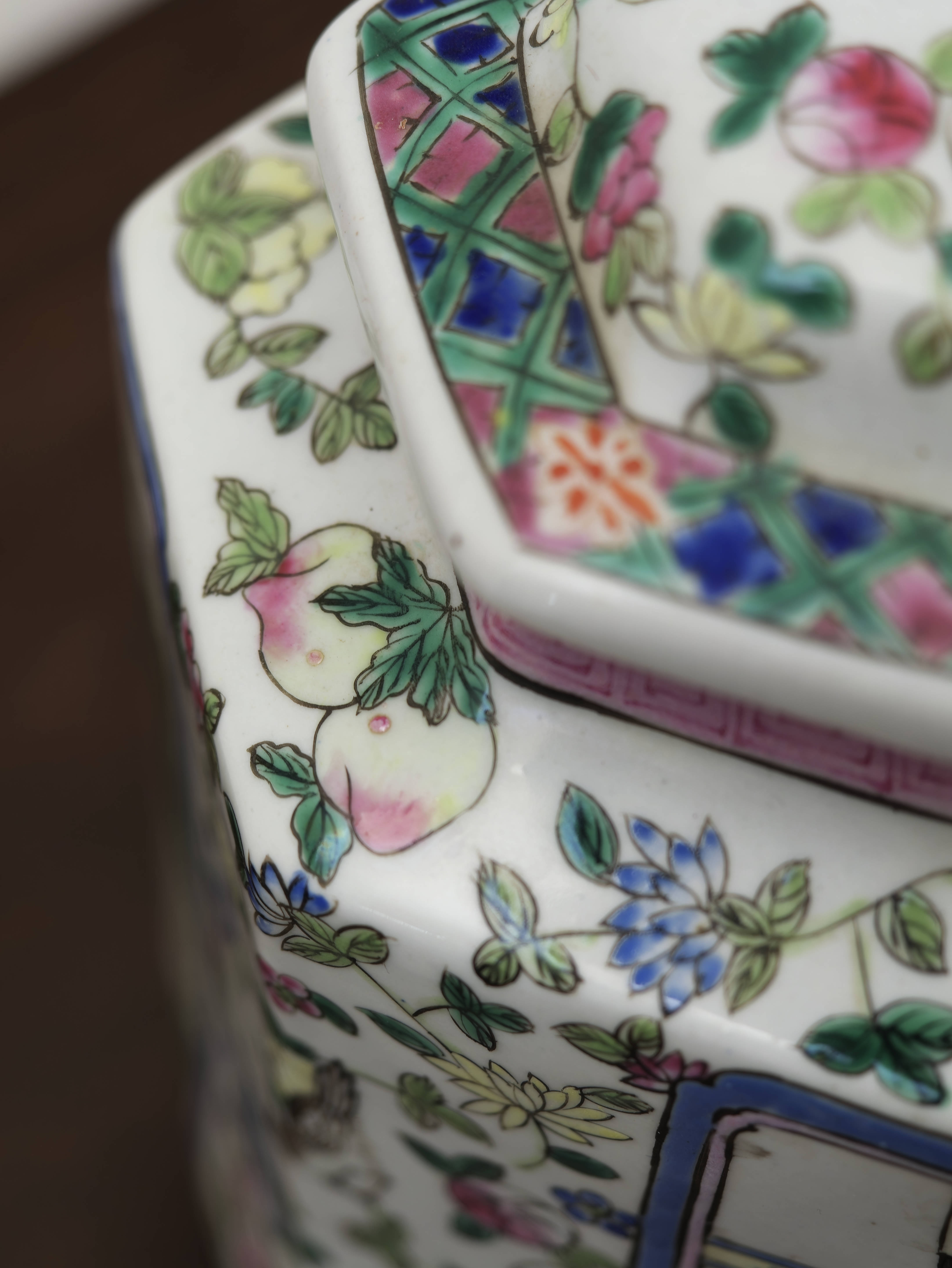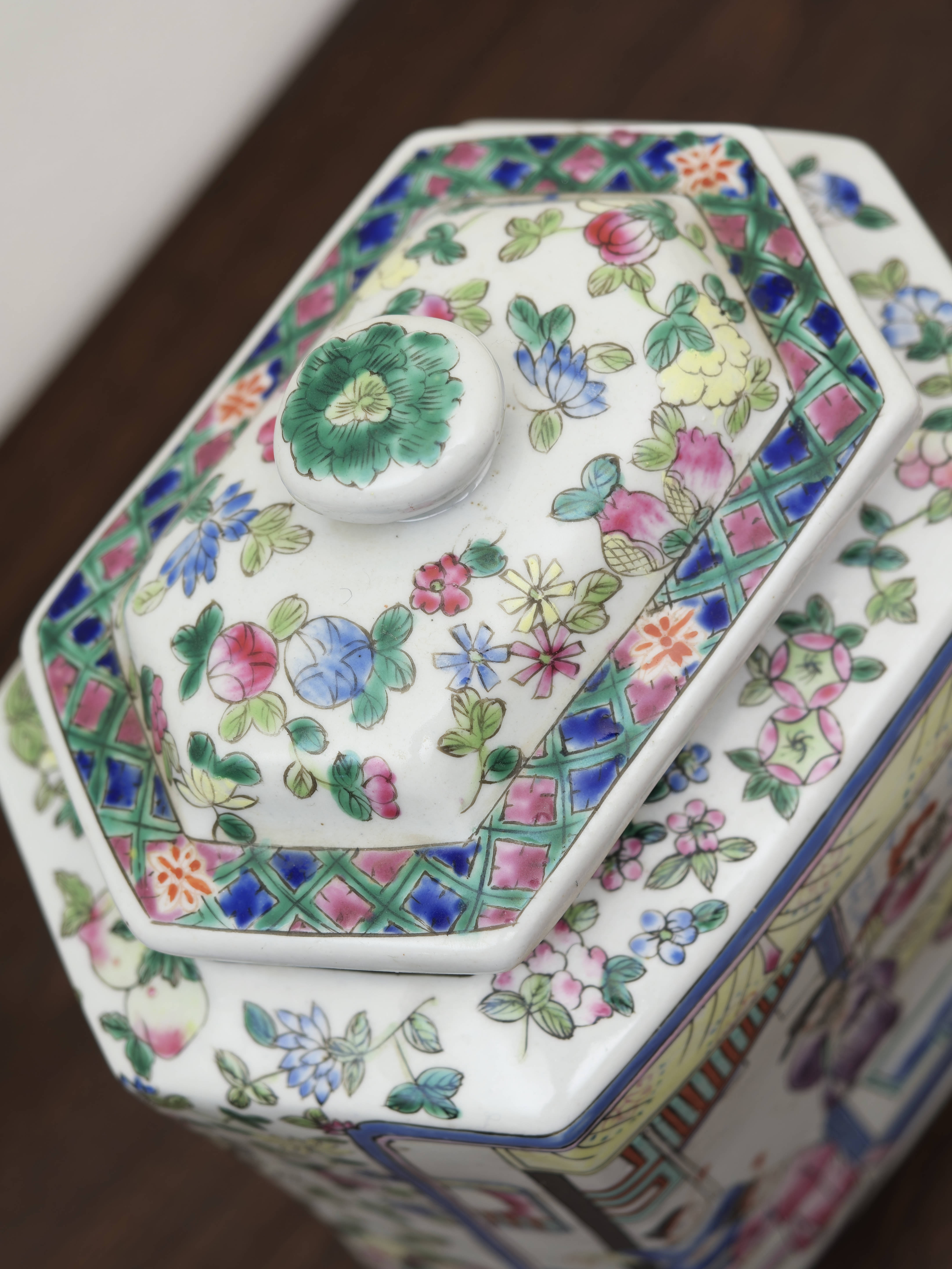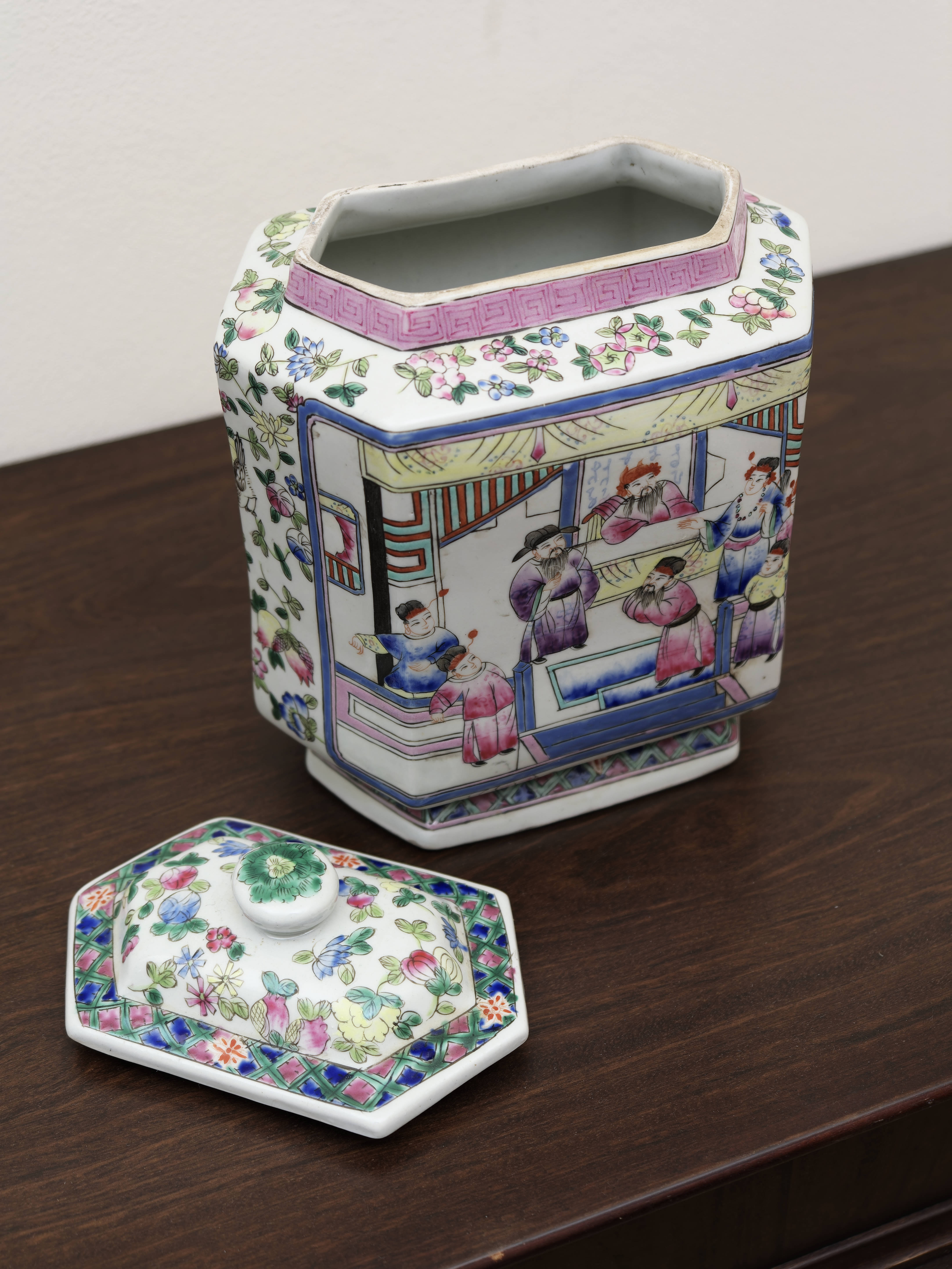 Čínská porcelánová zásobnice s víkem, ručně malovaná v dekoru famille rose jemnými polychromními emaily. Šestiboké provedení zdobí bohatá figurální a květinová výmalba, typická pro vyhledávaný okruh čínského exportního porcelánu. Celek zaujme jemností kresby, svěží barevností i výrazným tvarovým řešením.
