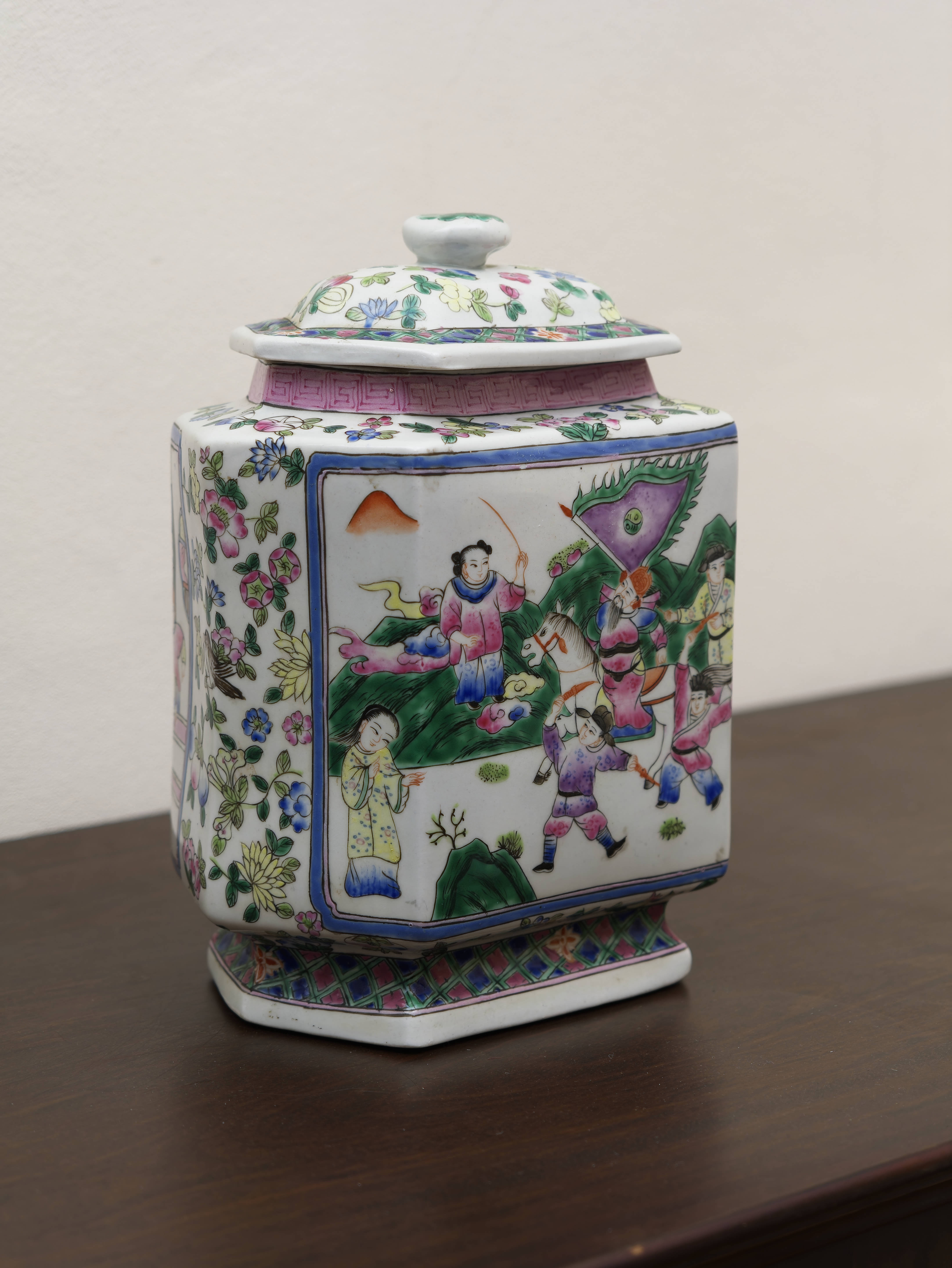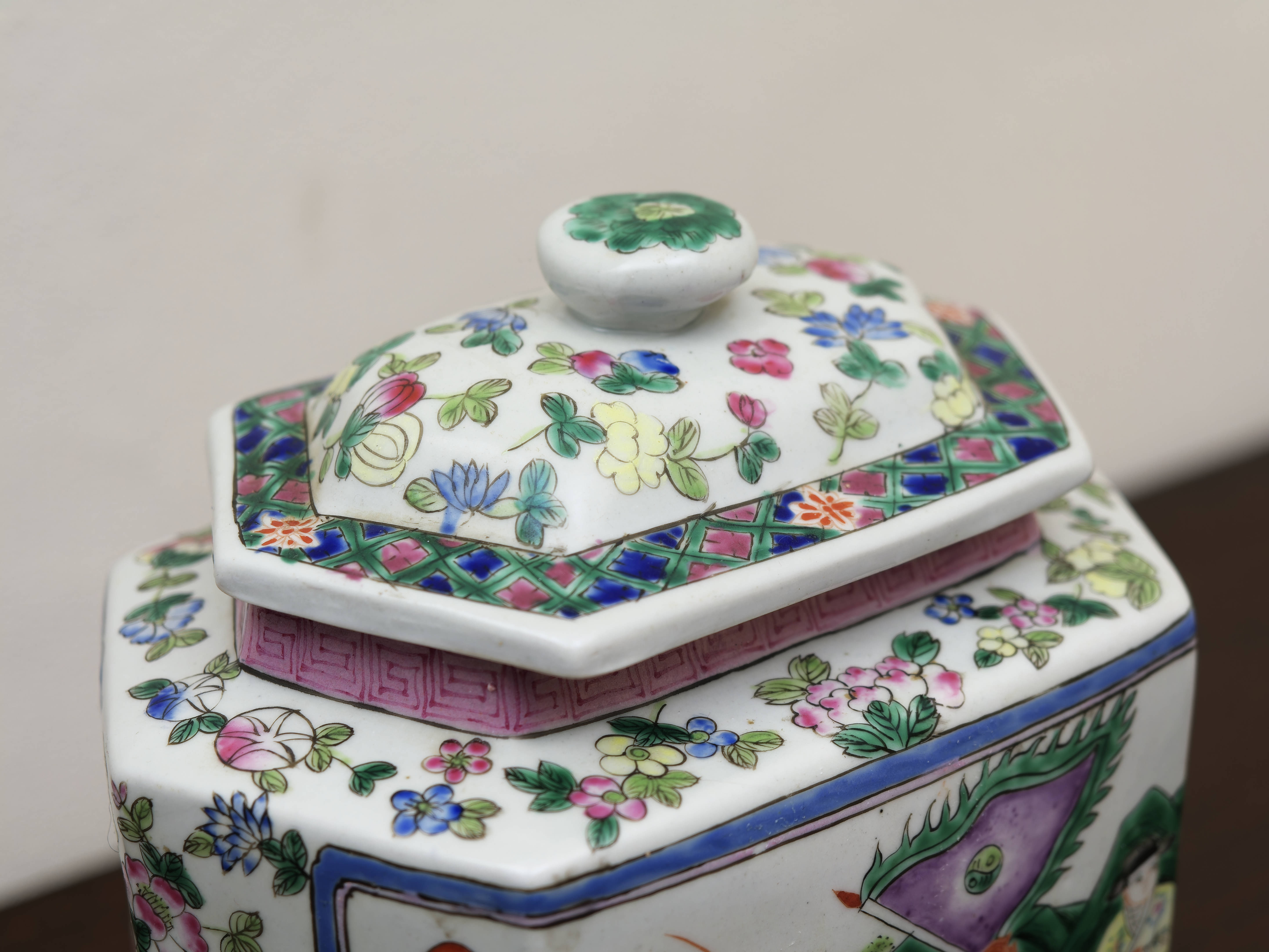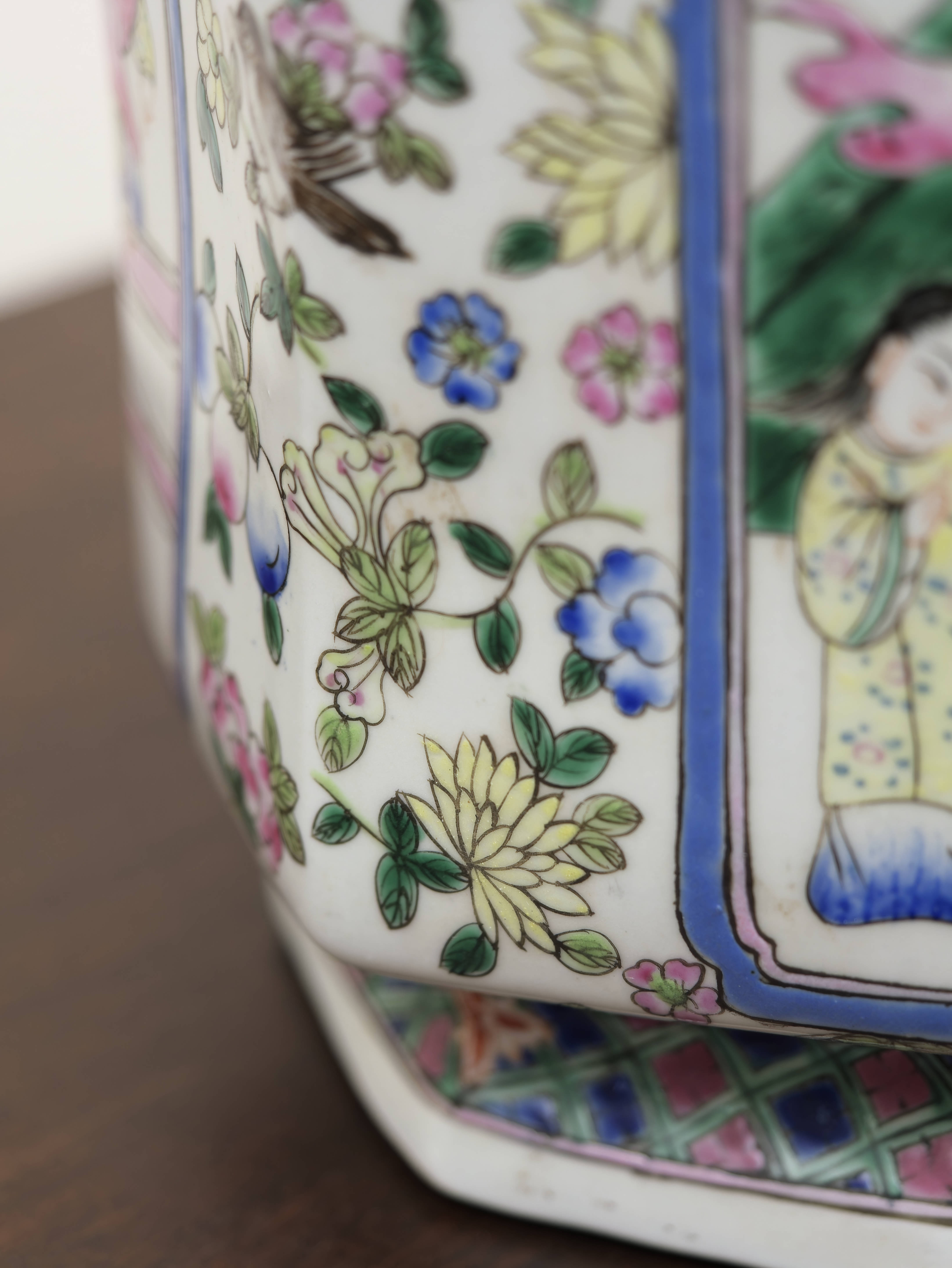 Čínská porcelánová zásobnice s víkem, ručně malovaná v dekoru famille rose jemnými polychromními emaily. Šestiboké provedení zdobí bohatá figurální a květinová výmalba, typická pro vyhledávaný okruh čínského exportního porcelánu. Celek zaujme jemností kresby, svěží barevností i výrazným tvarovým řešením.