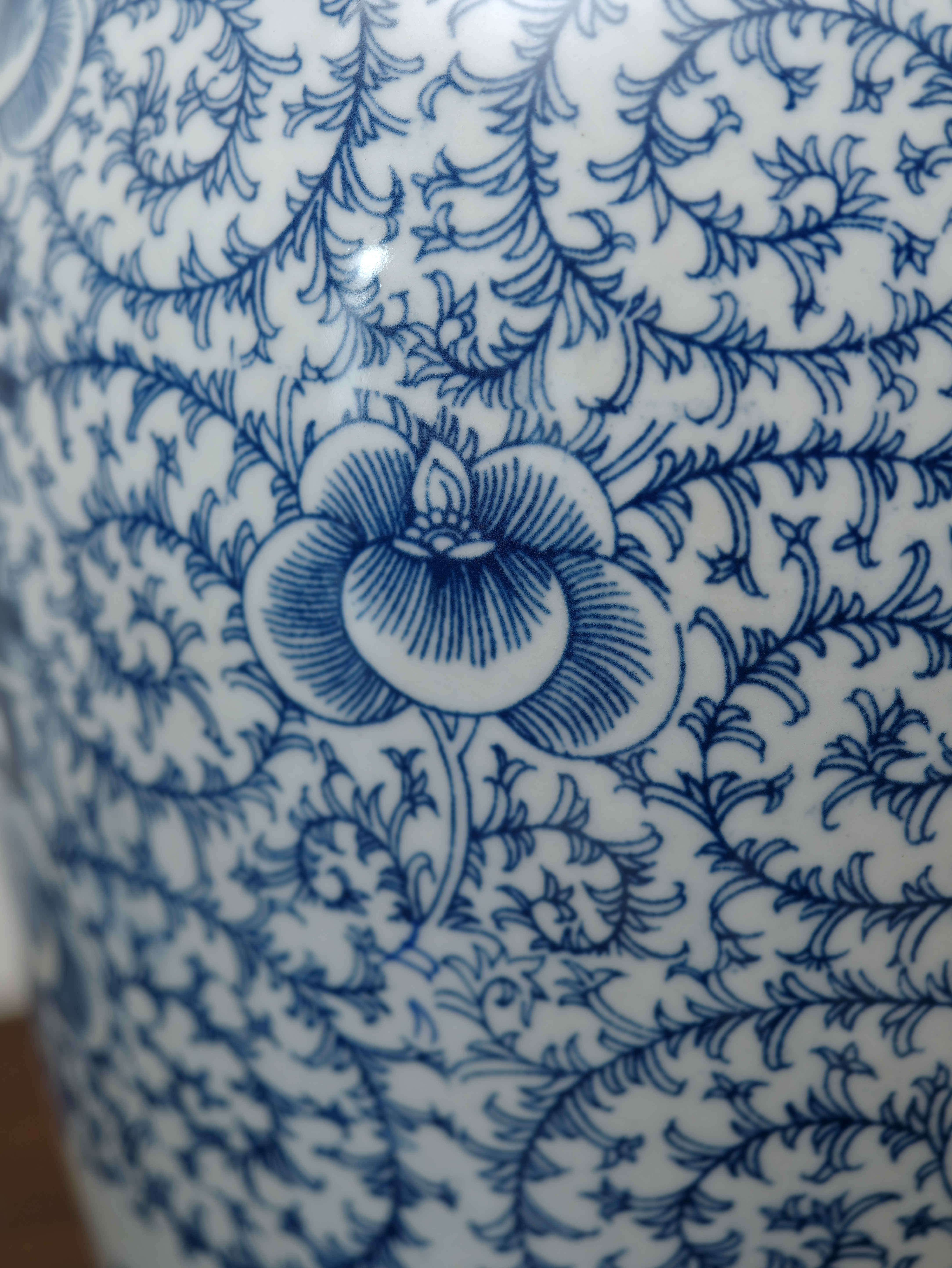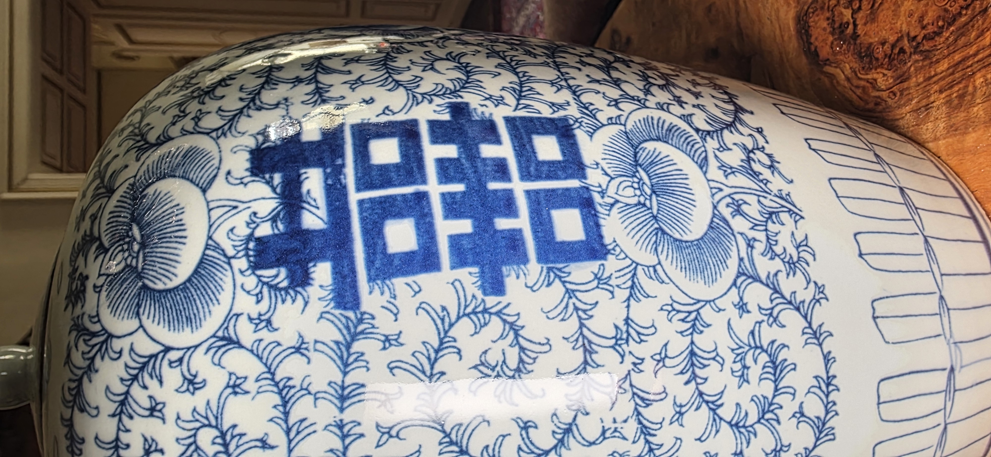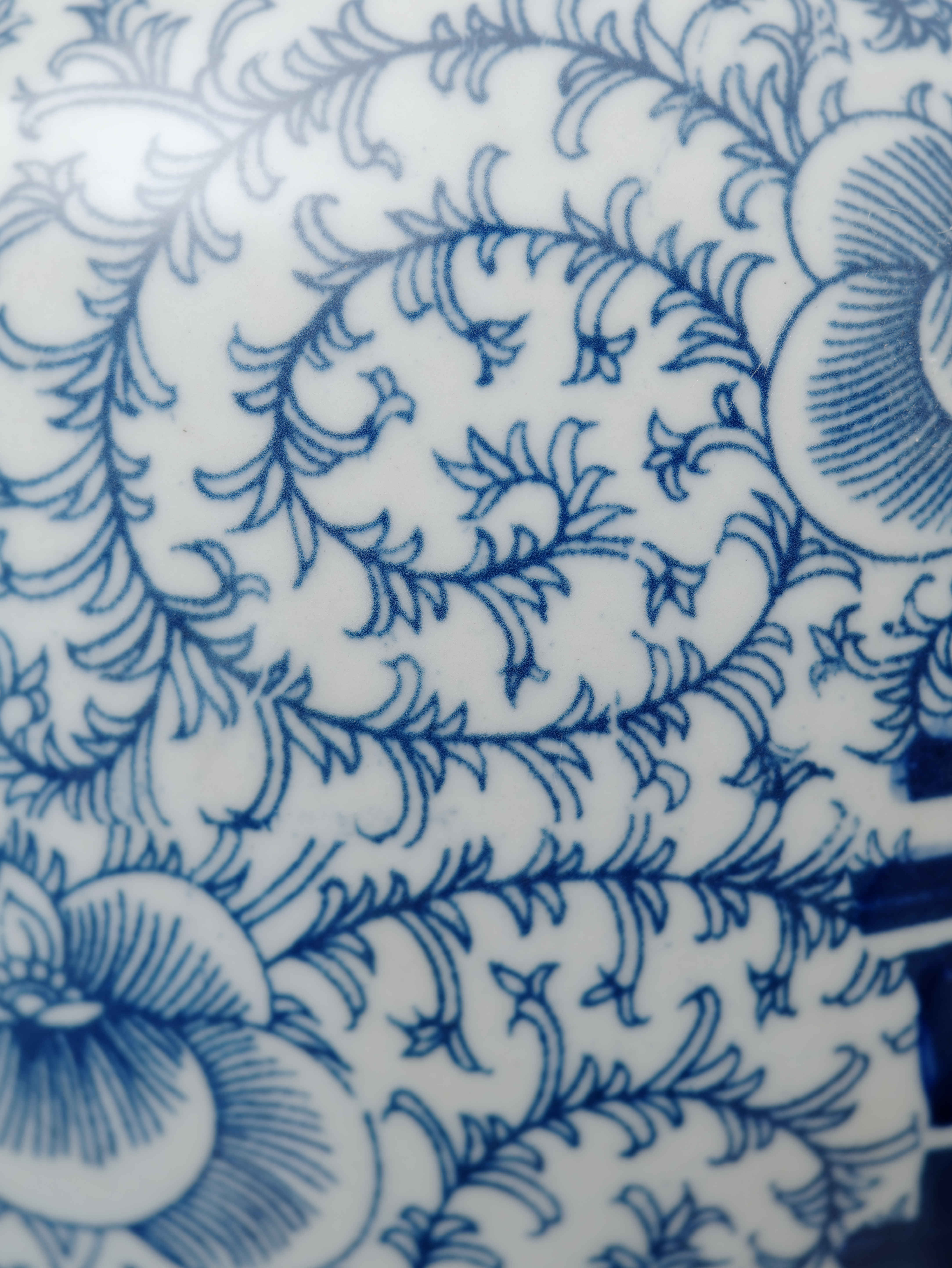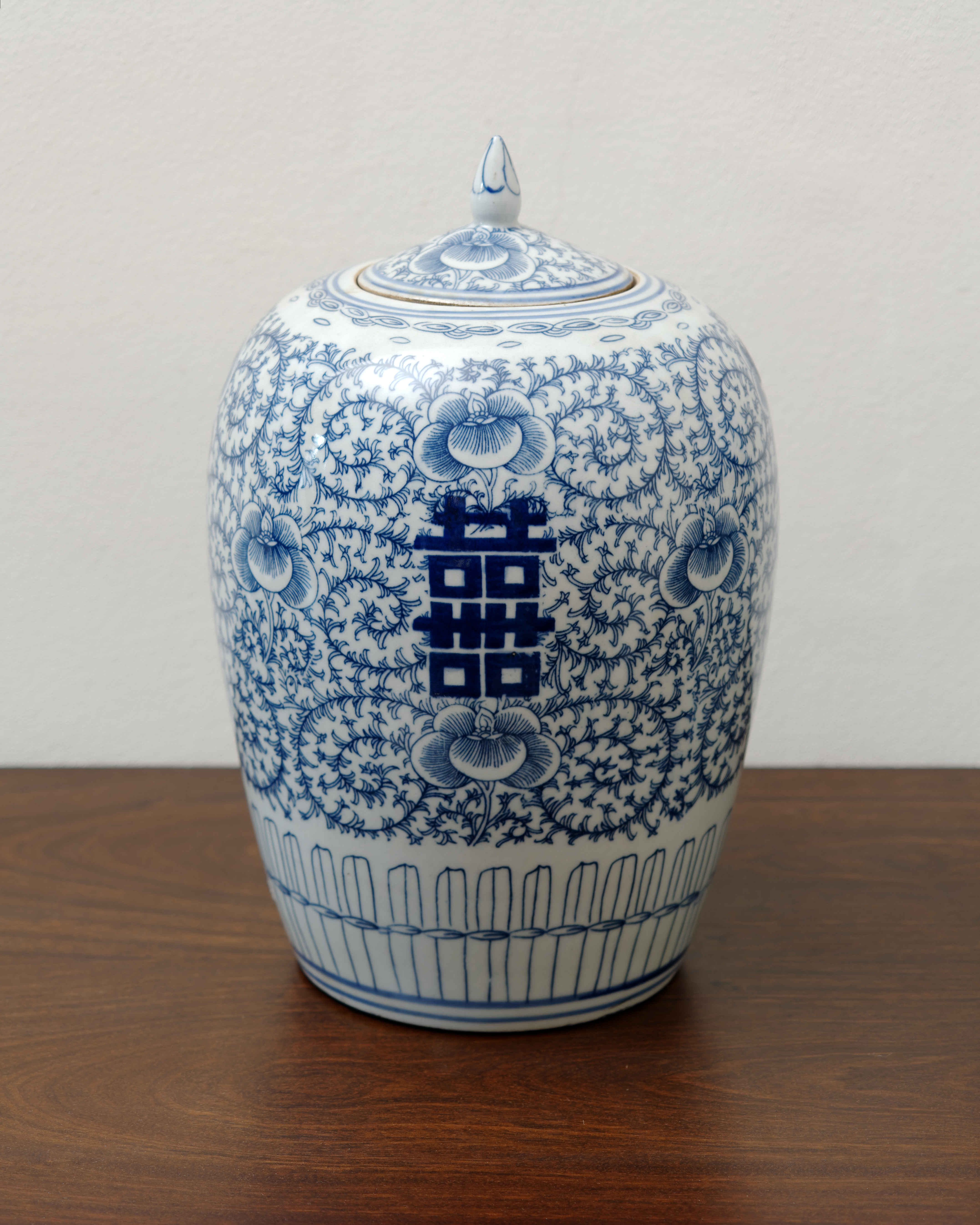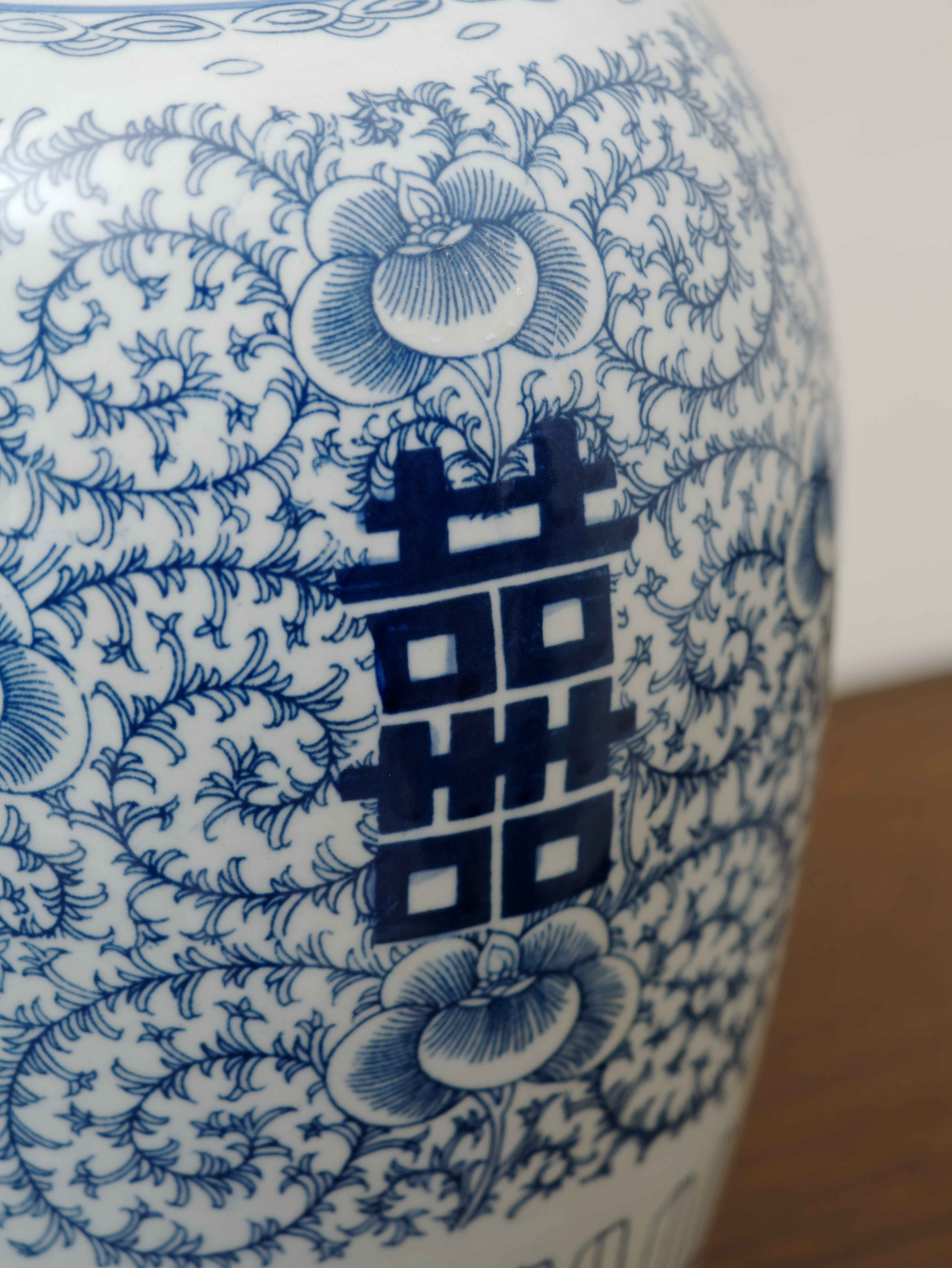 Dekorativní pár čínských porcelánových zásobnic s víky, ručně malovaných kobaltovou modří v podglazurním dekoru. Oválnější balustrovitý tvar s klenutými víky zdobí mimořádně jemně rozvedený rostlinný ornament, jehož hustá lineární kresba vytváří bohatou a zároveň harmonickou plochu. Střed každé zásobnice je akcentován výrazným modrým znakem dvojitého štěstí, který celku dodává symbolický i výtvarný důraz.