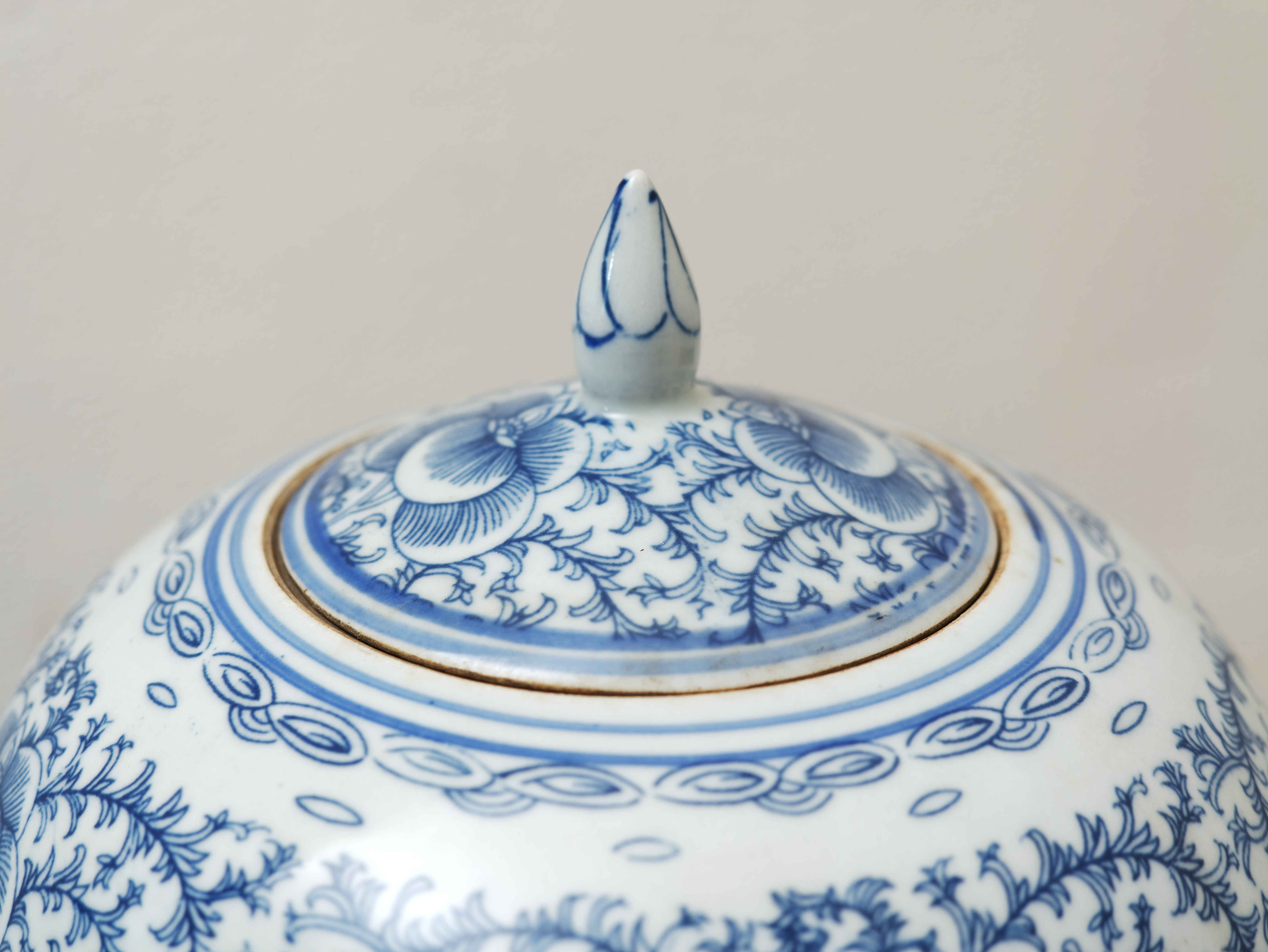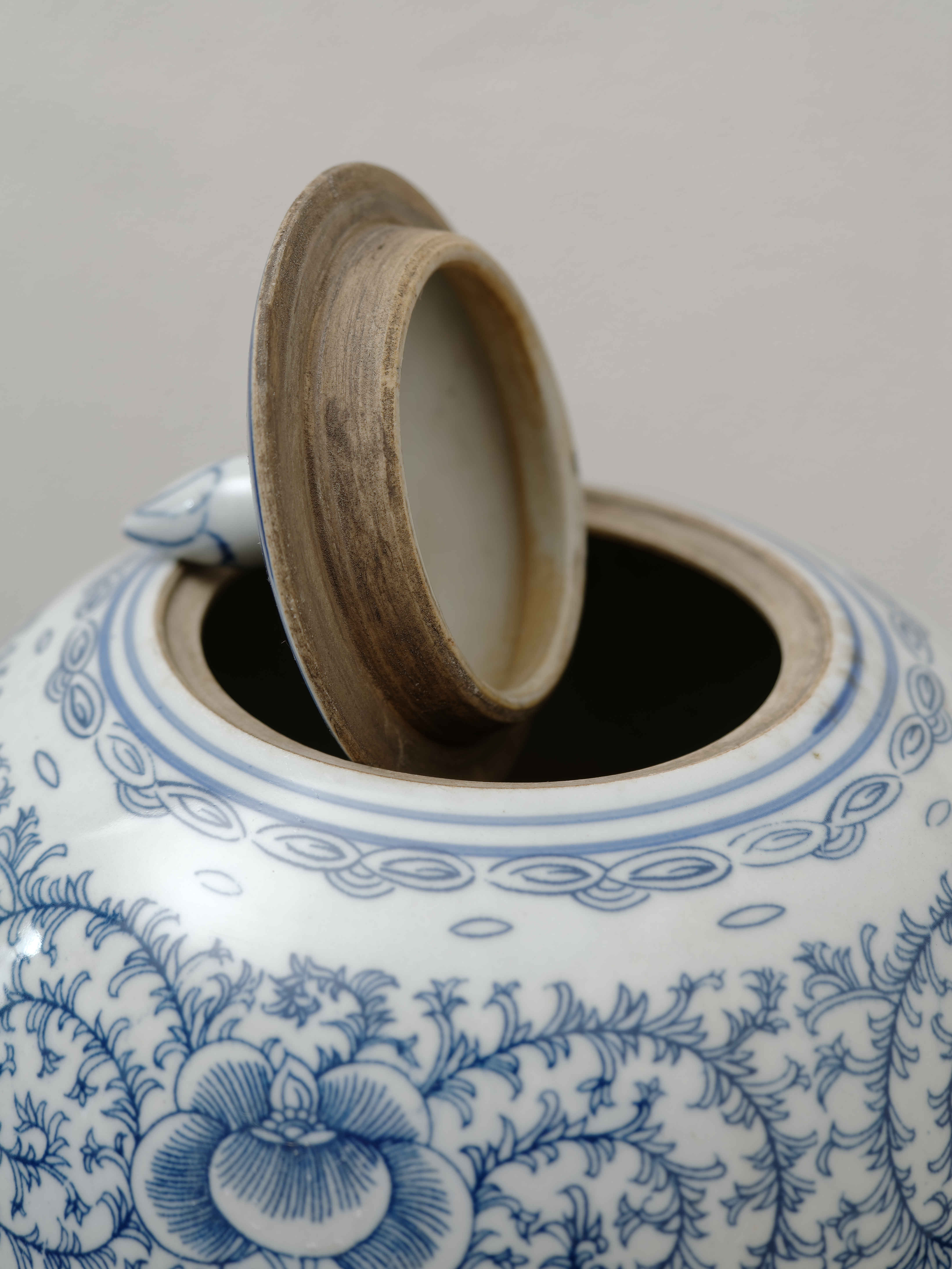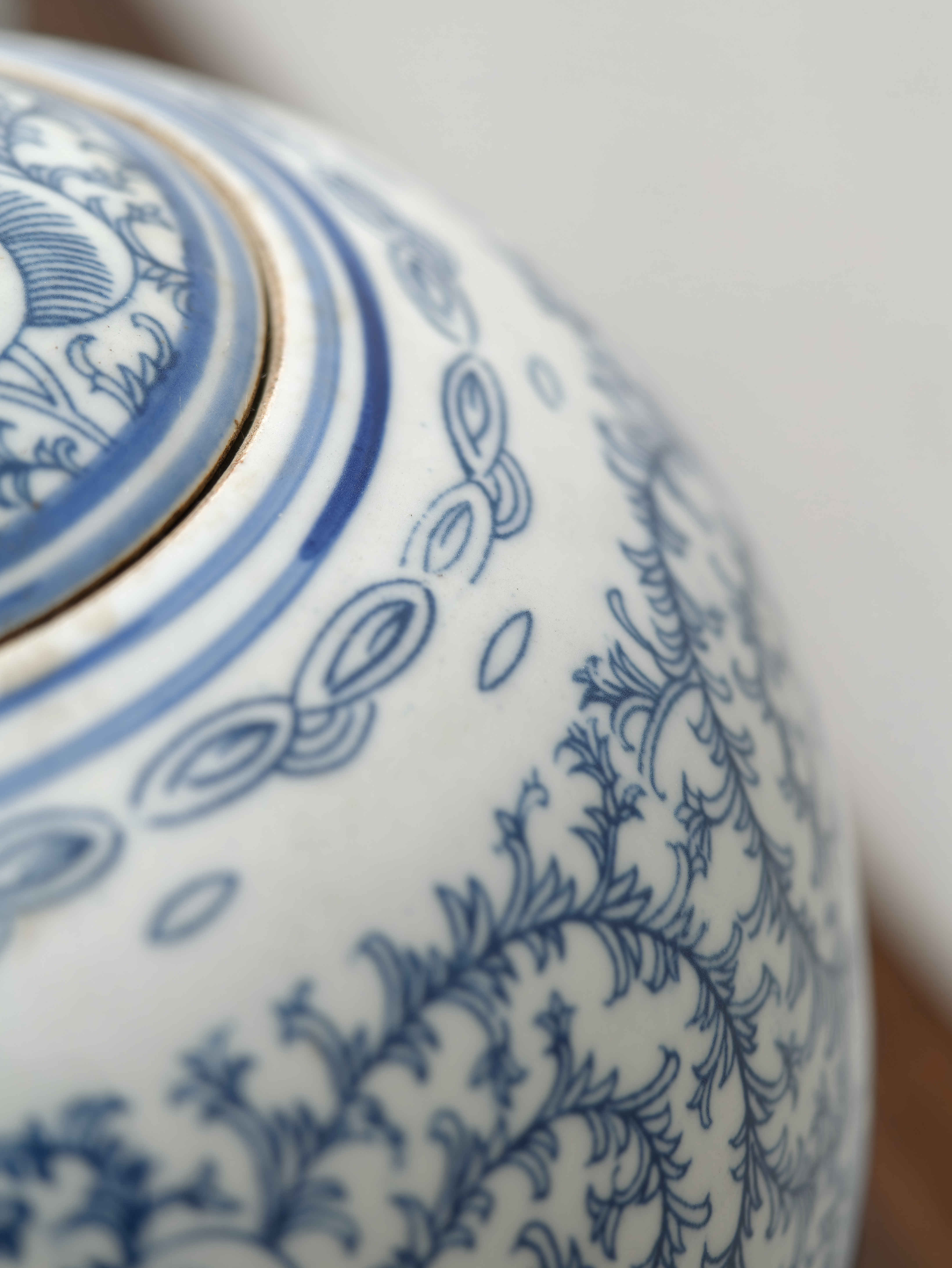 Podglazurní malba vyniká precizní linkou, čistotou provedení a kultivovaným kontrastem s bílým porcelánovým střepem. Jemné florální motivy, rytmizované pásy při dolním okraji i dekor vík působí vyváženě a ukazují oblibu tradičních čínských ornamentálních kompozic ve spojení s výrazným symbolem štěstí a harmonie. Právě spojení kobaltové modři s bohatě rozvrženým dekorem dává těmto zásobnicím reprezentativní a nadčasový charakter.