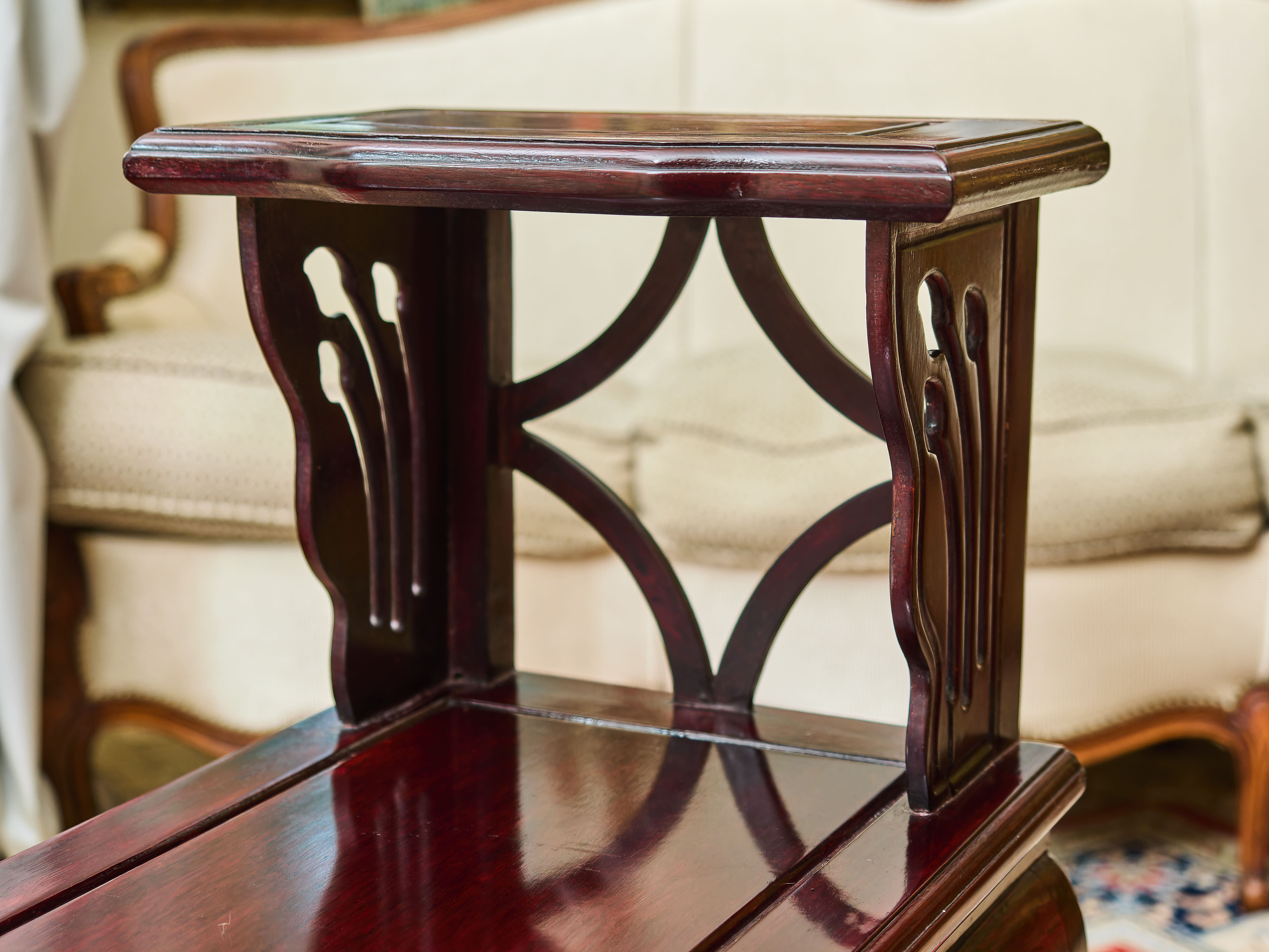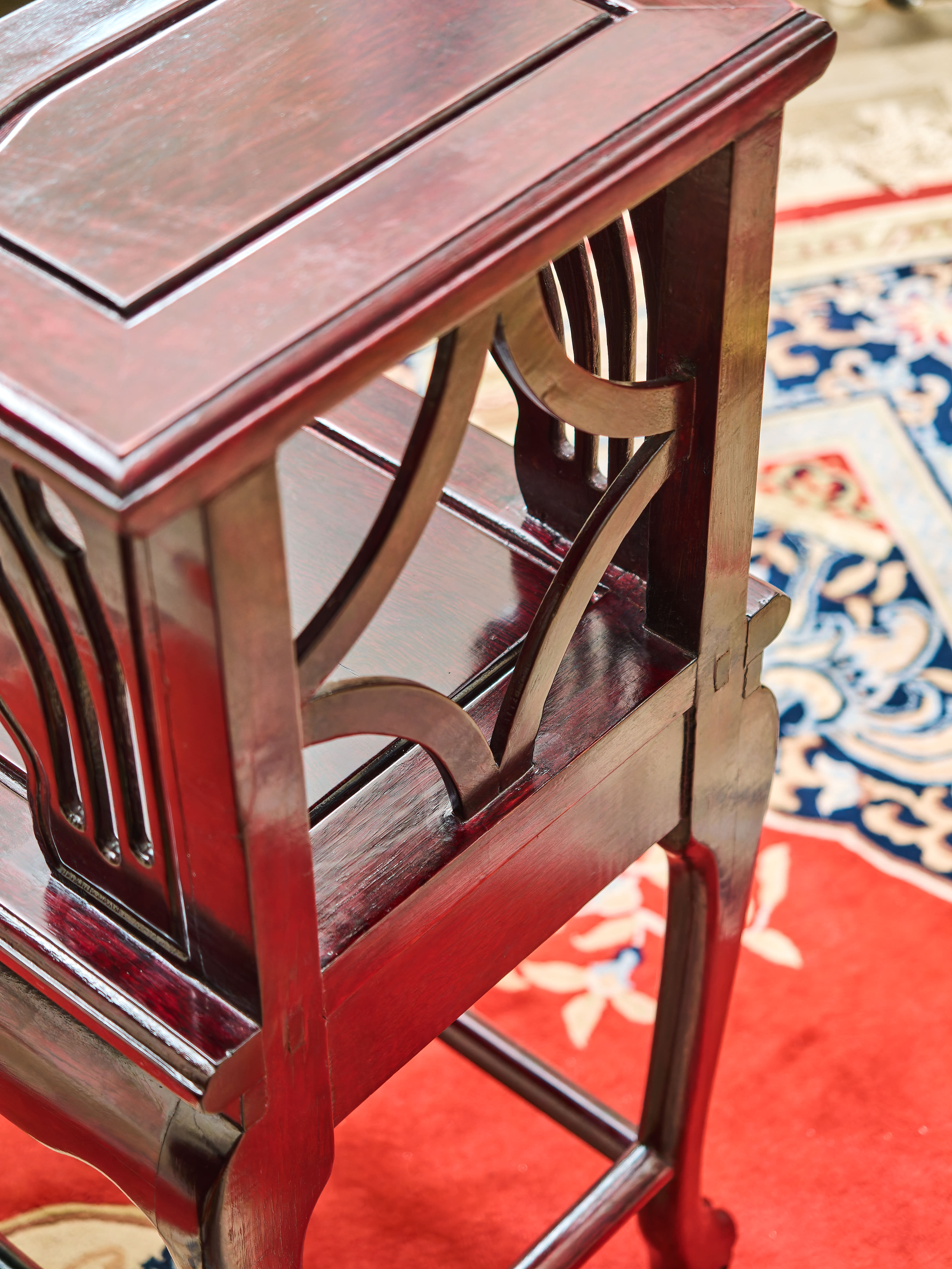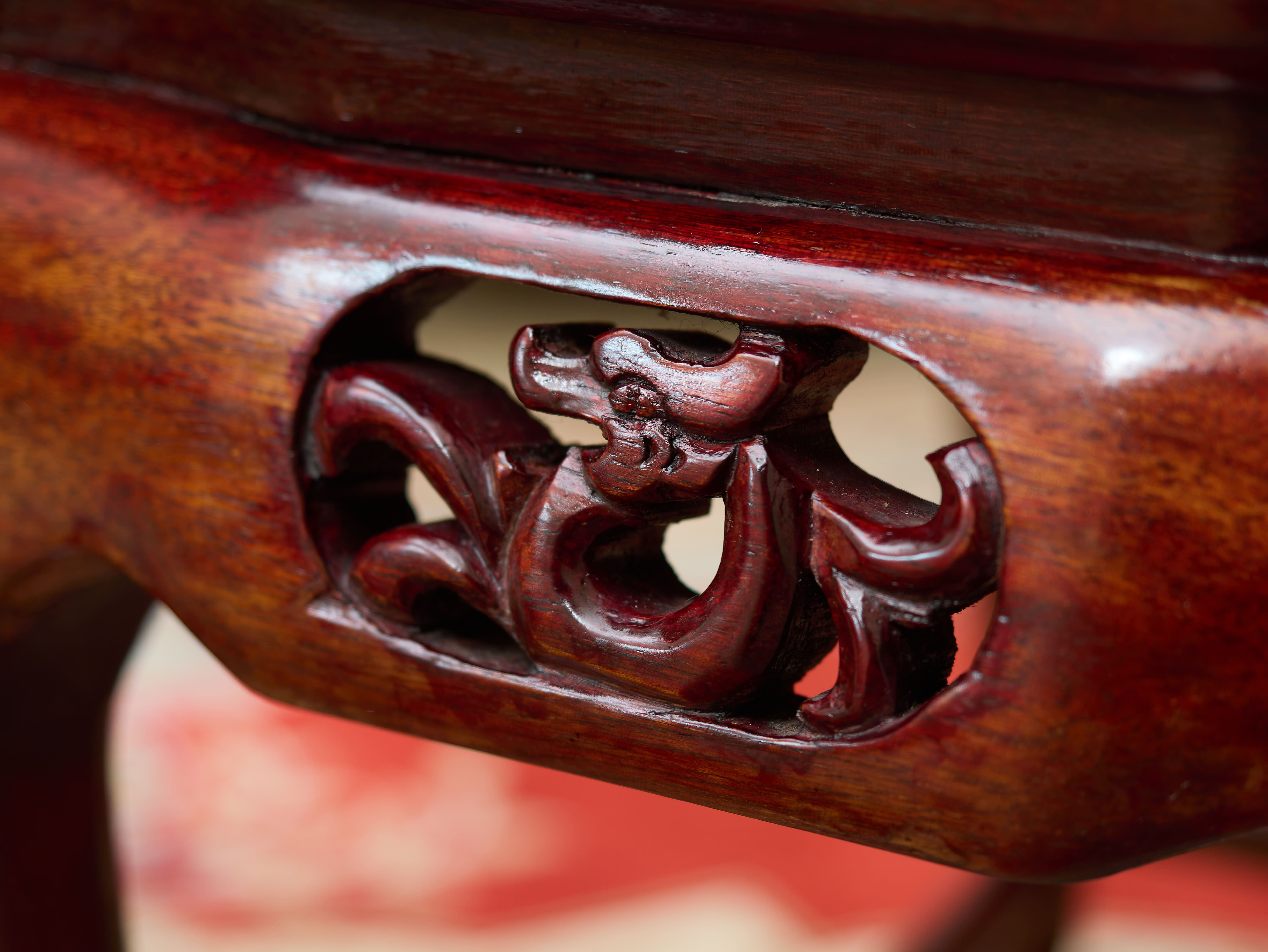 Elegantní pár čínských stolků z masivního tvrdého dřeva, ručně vyřezávaný v tradičním stylu. Stolky mají jemně profilované nohy, boční výplně s obloukovým dekorem a plastickou řezbu v čelních partiích. Povrch je ručně leštěný do hlubokého, teplého lesku, který zvýrazňuje kresbu dřeva.